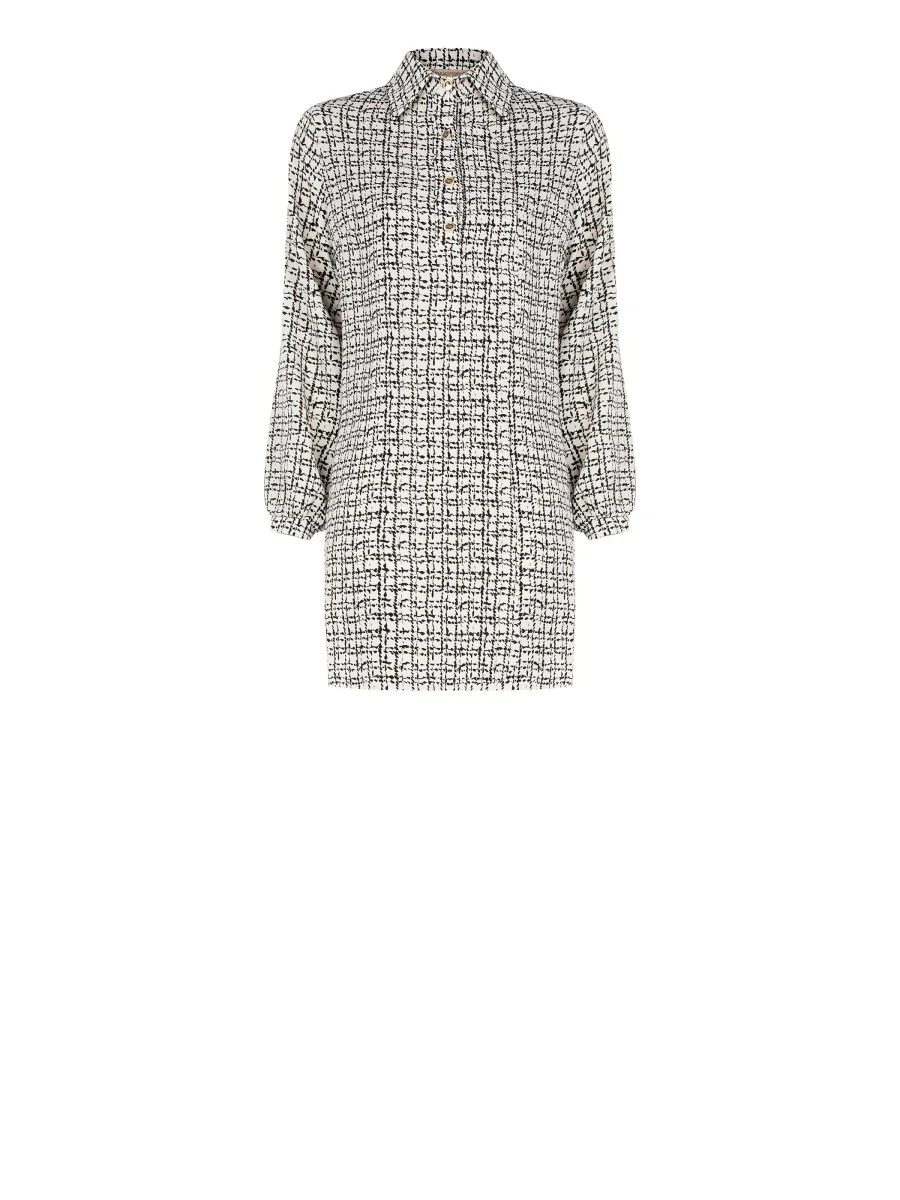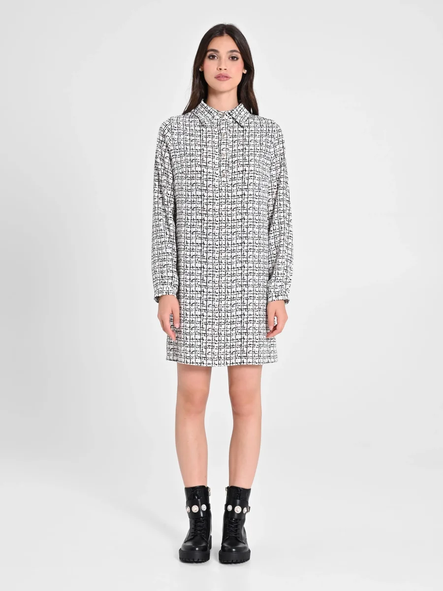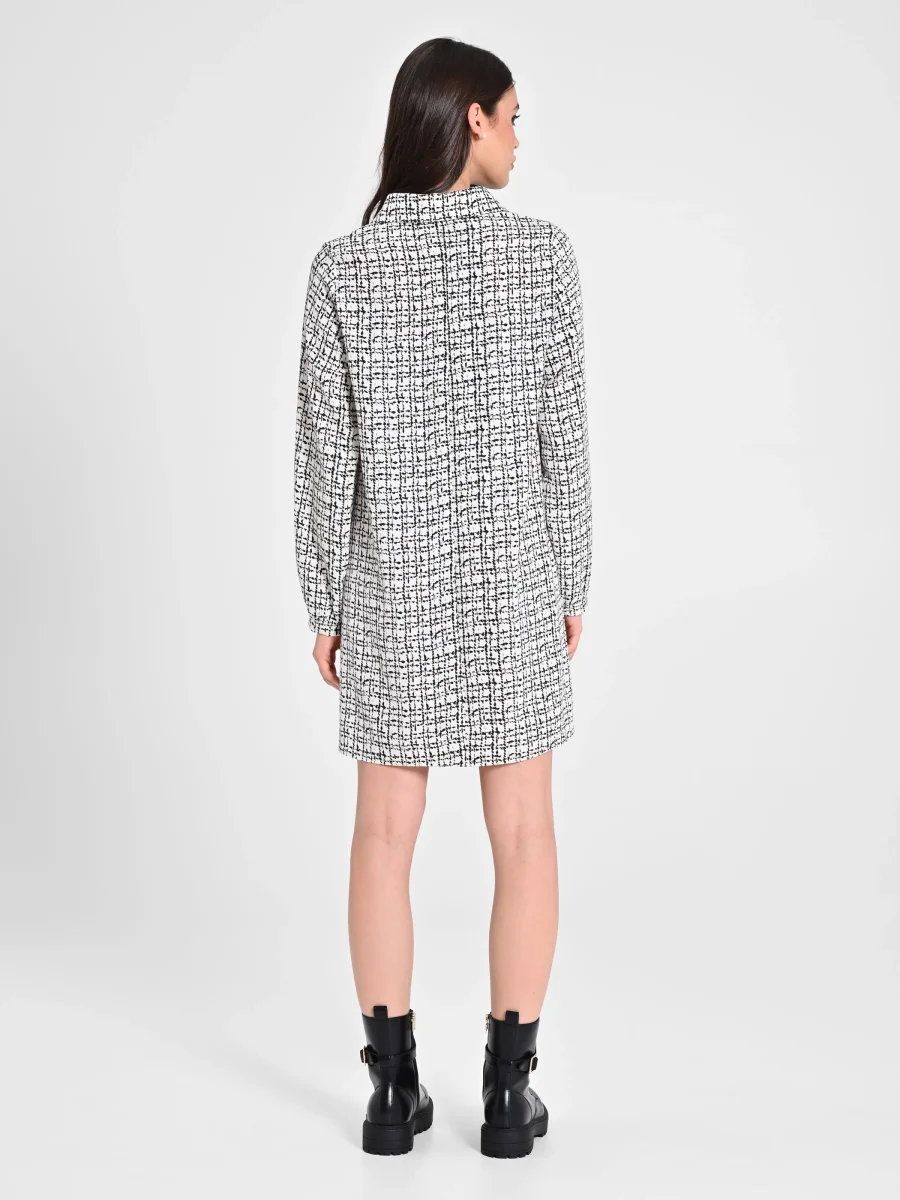 Abito lunghezza al ginocchio, « A Line », realizzato in tessuto tecnico. Il tessuto riprende un motivo geometrico all-over nero su base bianca. Colletto e polsini modello camicia, con abbottonatura frontale tramite bottoni dorati. Il capo è interamente made in Italy. La modella è alta 1,74 ed indossa la taglia S. Il capo in taglia S corrisponde alle seguenti misure: Il seno misura 49 cm, la vita misura 48 cm,la lunghezza è 85 cm.