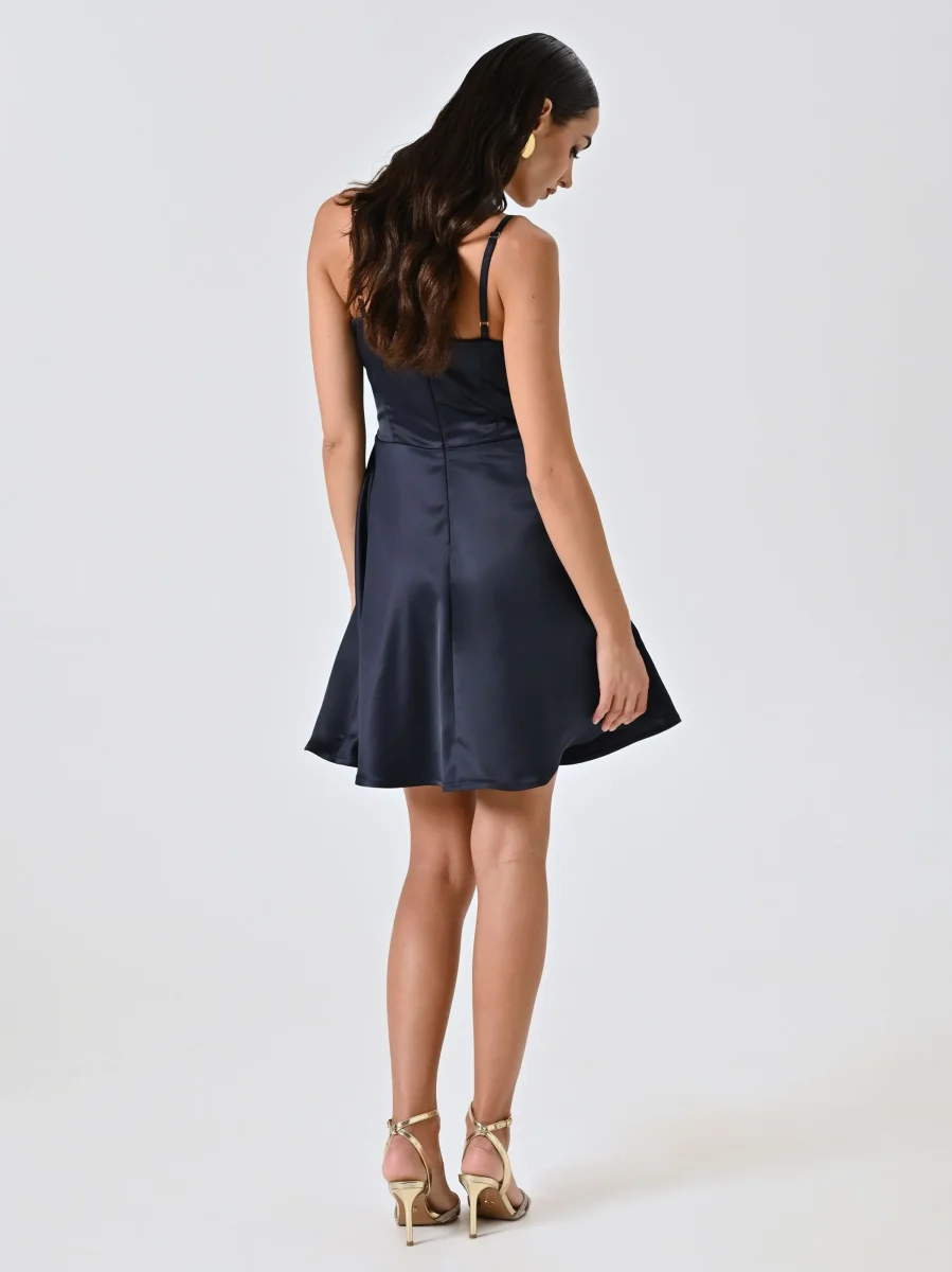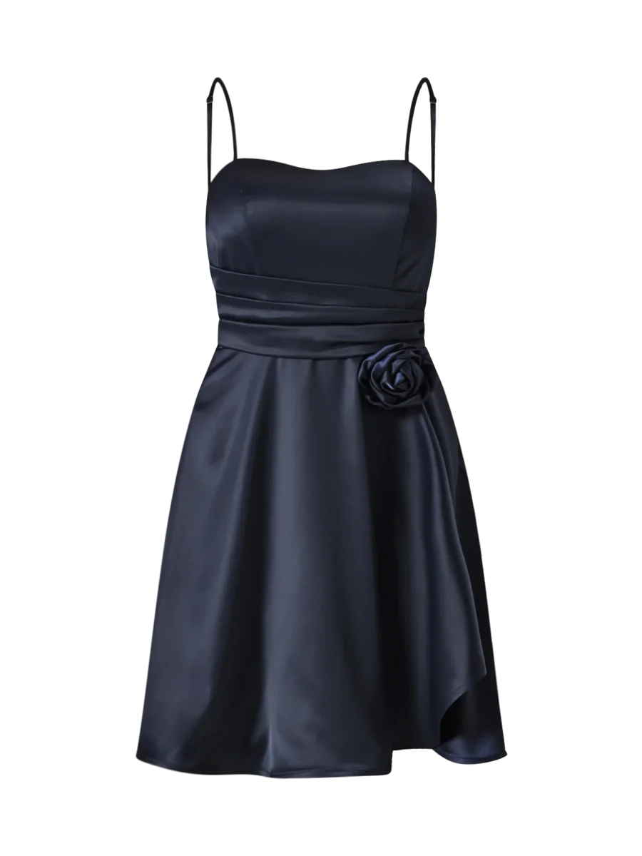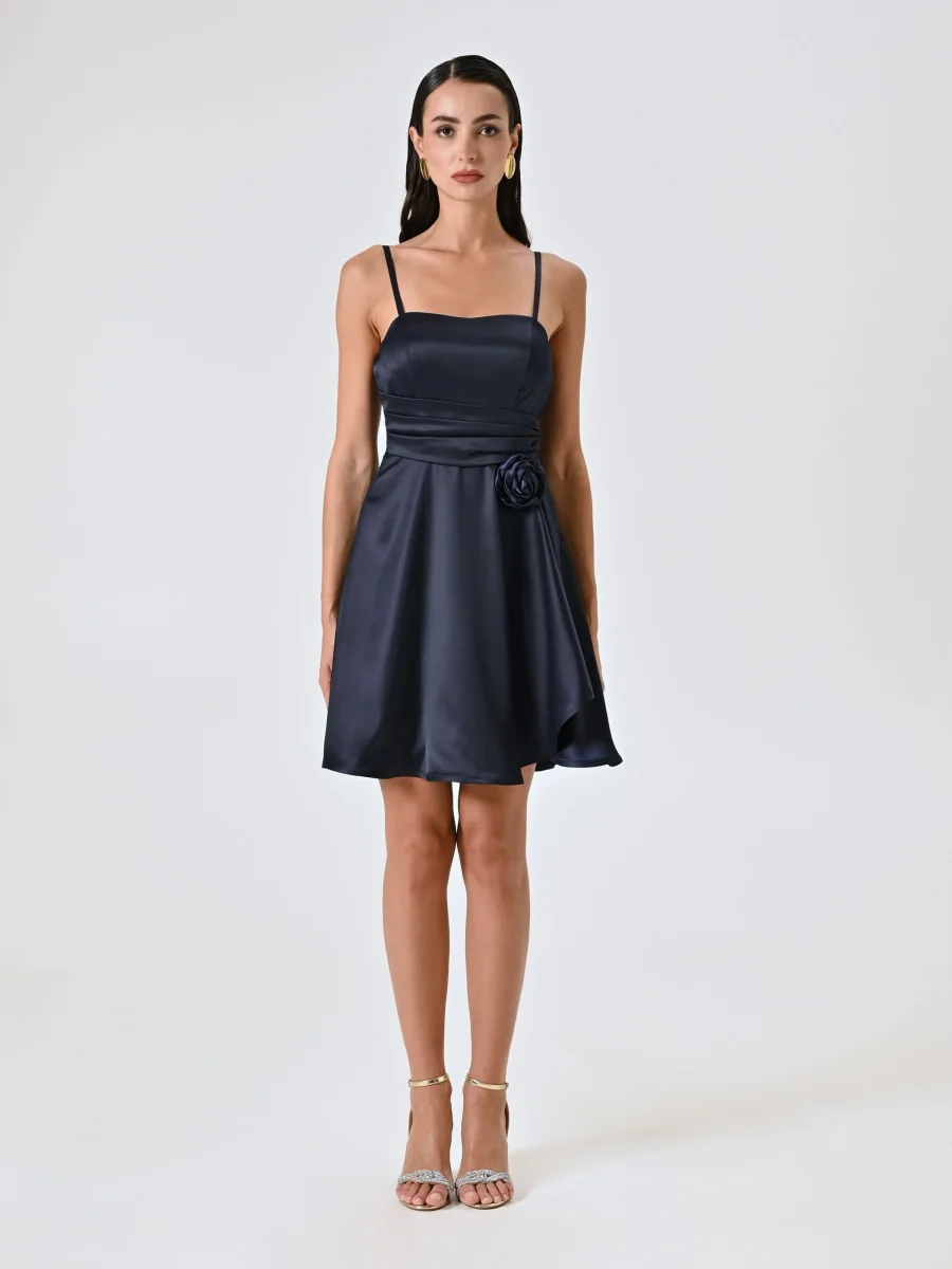 Realizzato in raso parzialmente riciclato, l’Abito a Ruota Blu presenta uno scollo dritto che mette in risalto le spalle, un delicato drappeggio in vita che sottolinea la silhouette e una rosa in tessuto cucita, che dona tridimensionalità e un tocco romantico al design. La chiusura con zip posteriore garantisce una vestibilità pratica e pulita.
