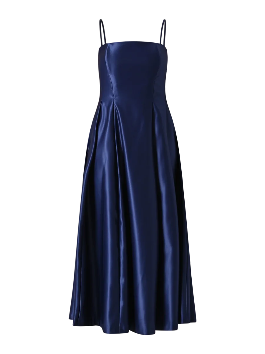 Realizzato in raso strutturato con tessuto parzialmente riciclato, l’Abito a Ruota con Scollo Dritto presenta spalline sottili regolabili, corpino con stecche che scolpisce il busto, vita stretta e una voluminosa gonna a ruota che dona movimento e leggerezza. La chiusura con zip posteriore garantisce una vestibilità precisa e confortevole.