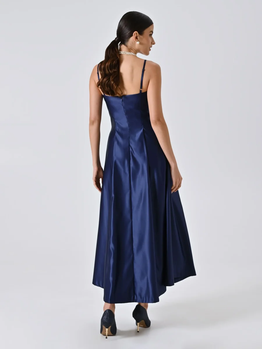 Abito atelier lungo blu indaco con corpetto drappeggiato