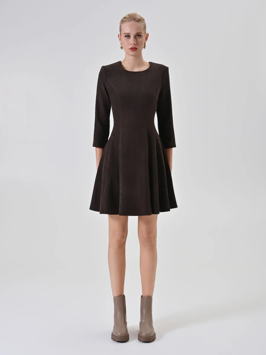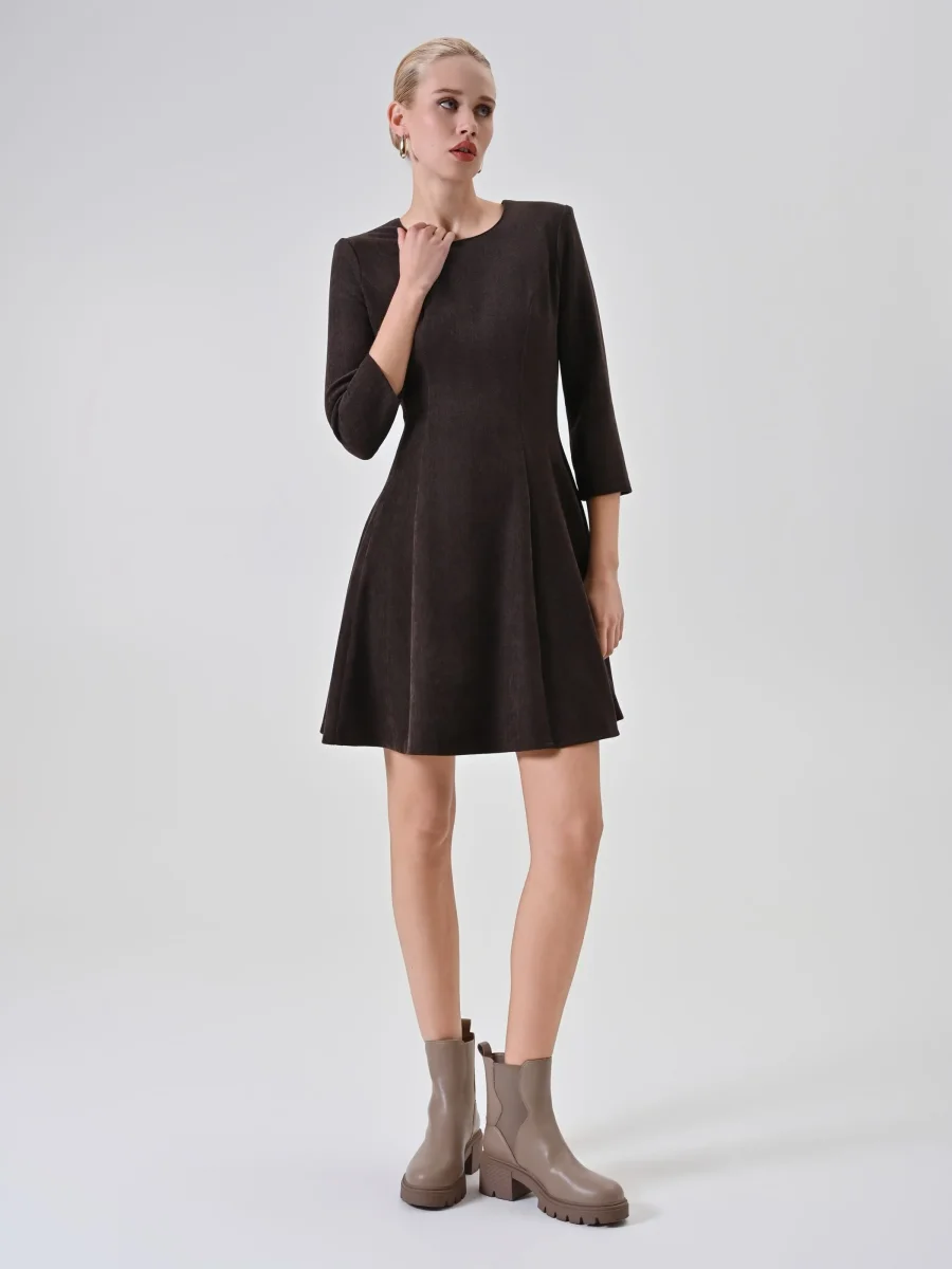 Il design gioca sull’equilibrio delle forme: il corpetto aderente, con tagli a principessa che seguono la silhouette, si apre in una gonna corta e svasata, libera di muoversi a ogni passo. Le maniche a tre quarti e il semplice scollo rotondo contribuiscono a creare una linea pulita e versatile, facile da indossare. La chiusura con zip invisibile sul retro mantiene intatta l’armonia del capo.