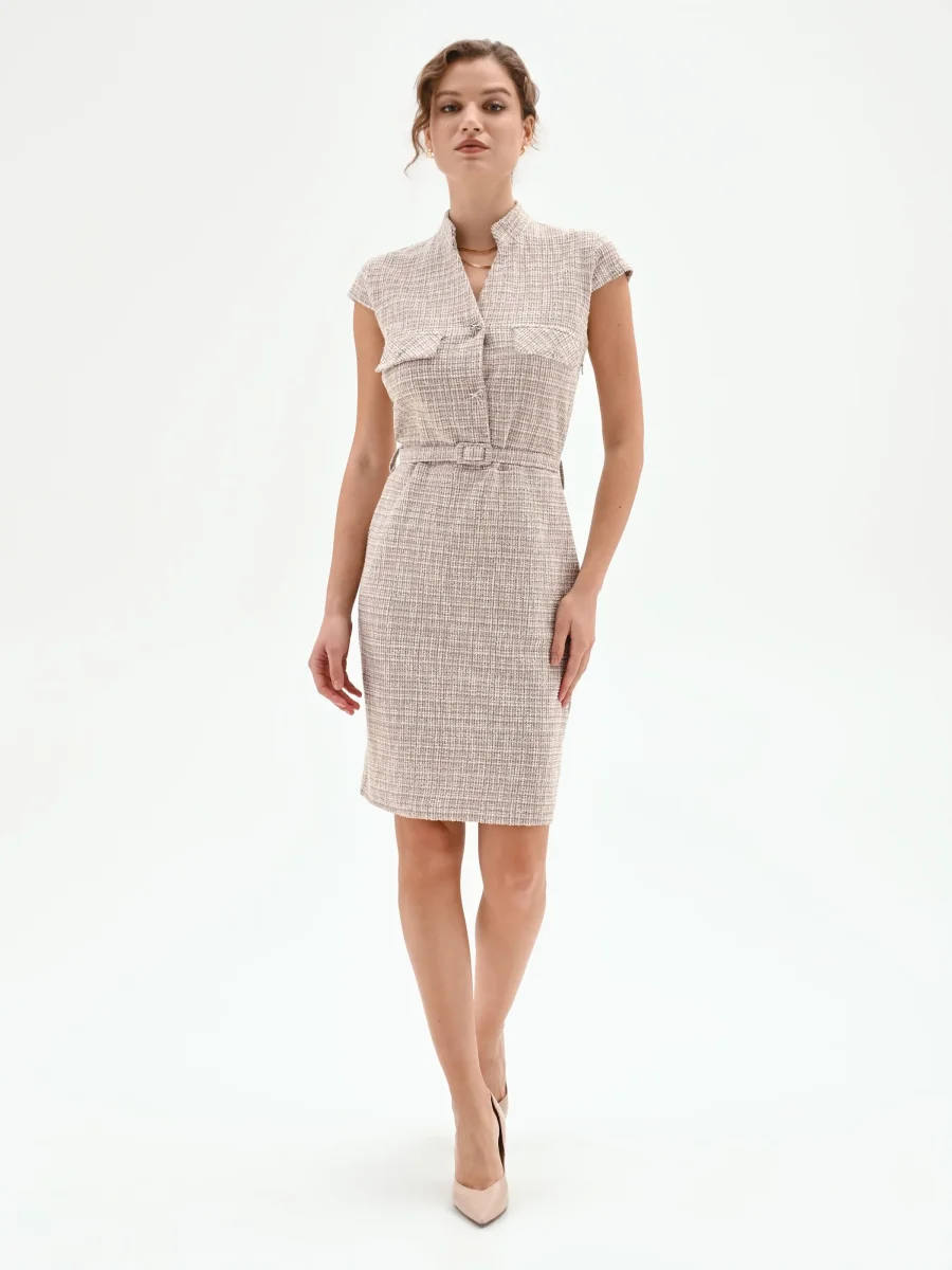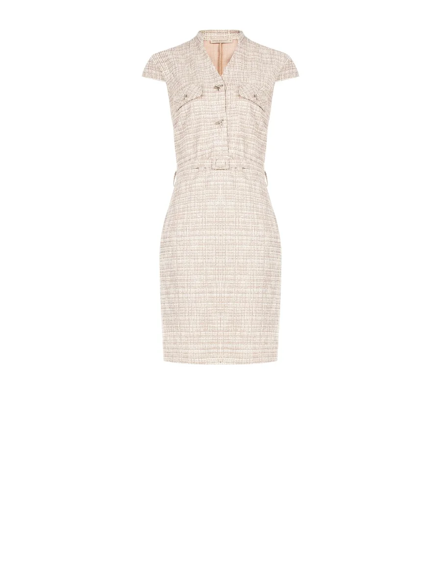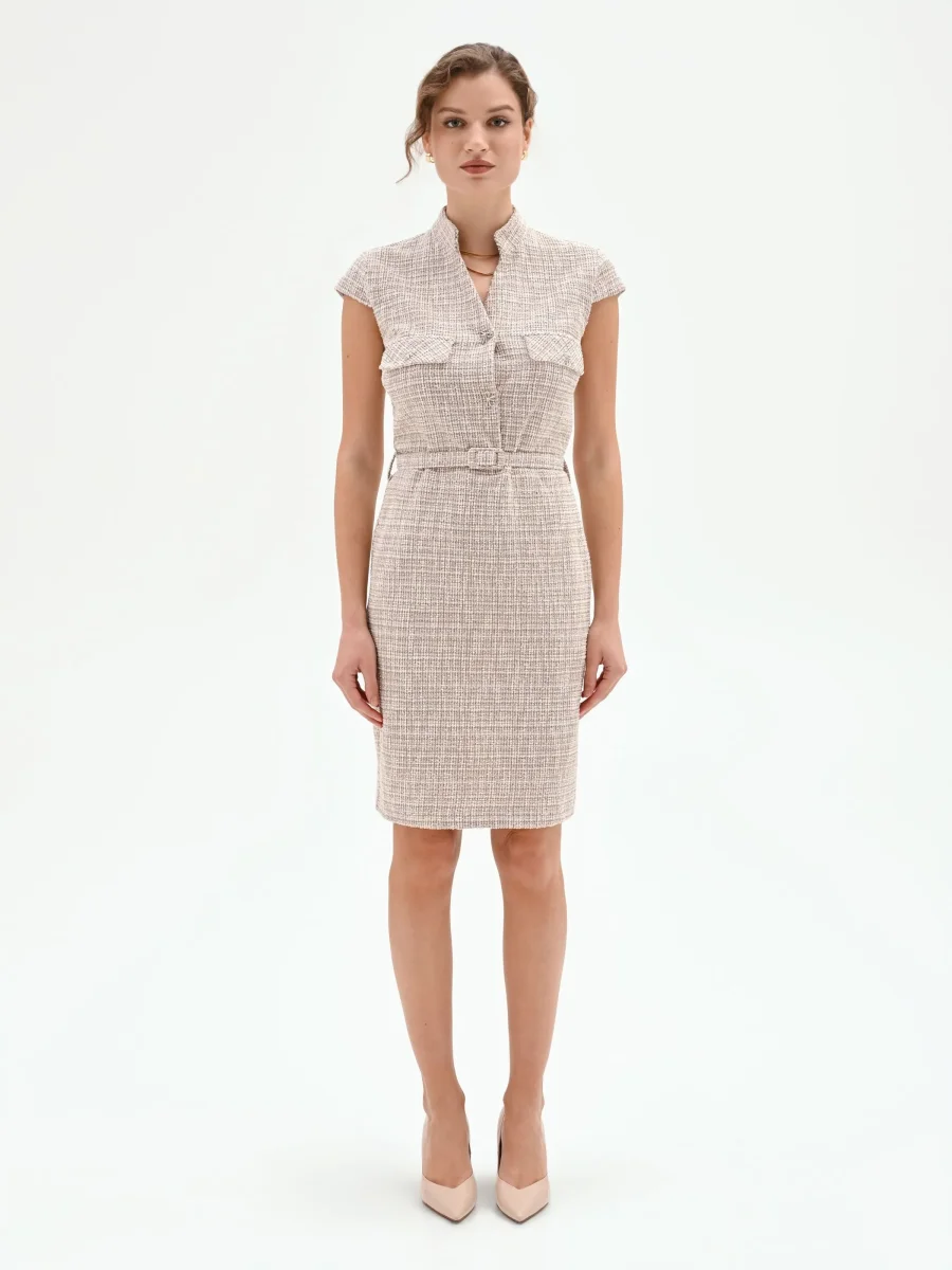 Abito a tubino beige chiaro in tweed con cintura
