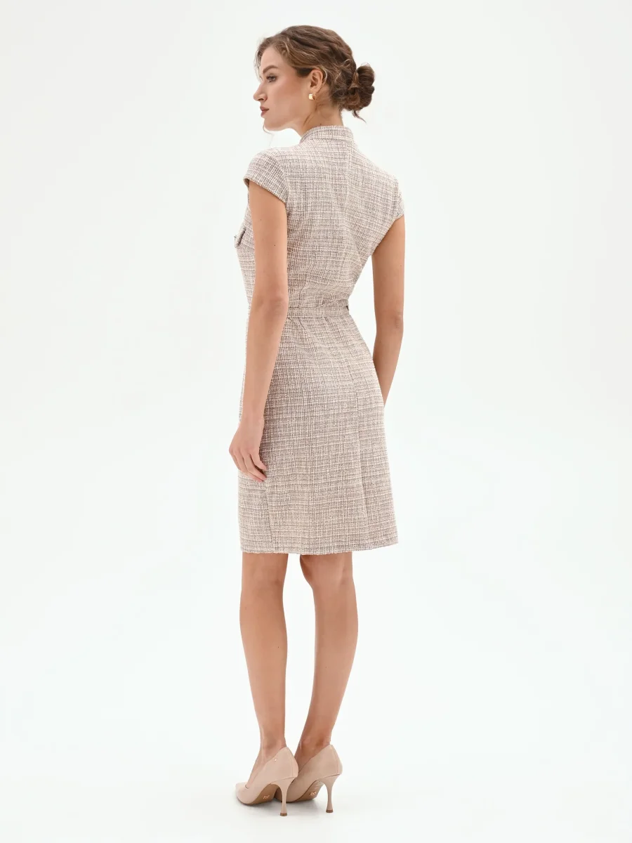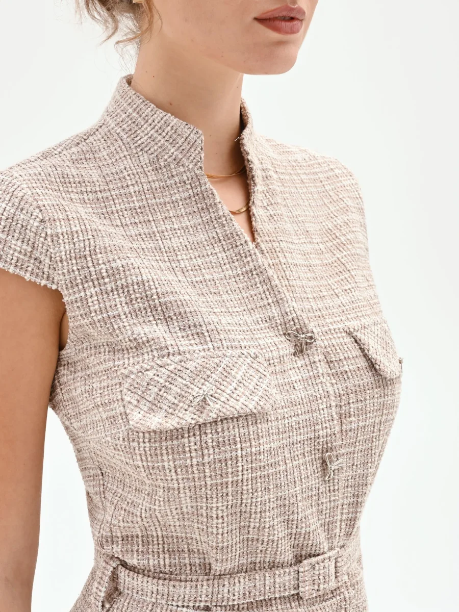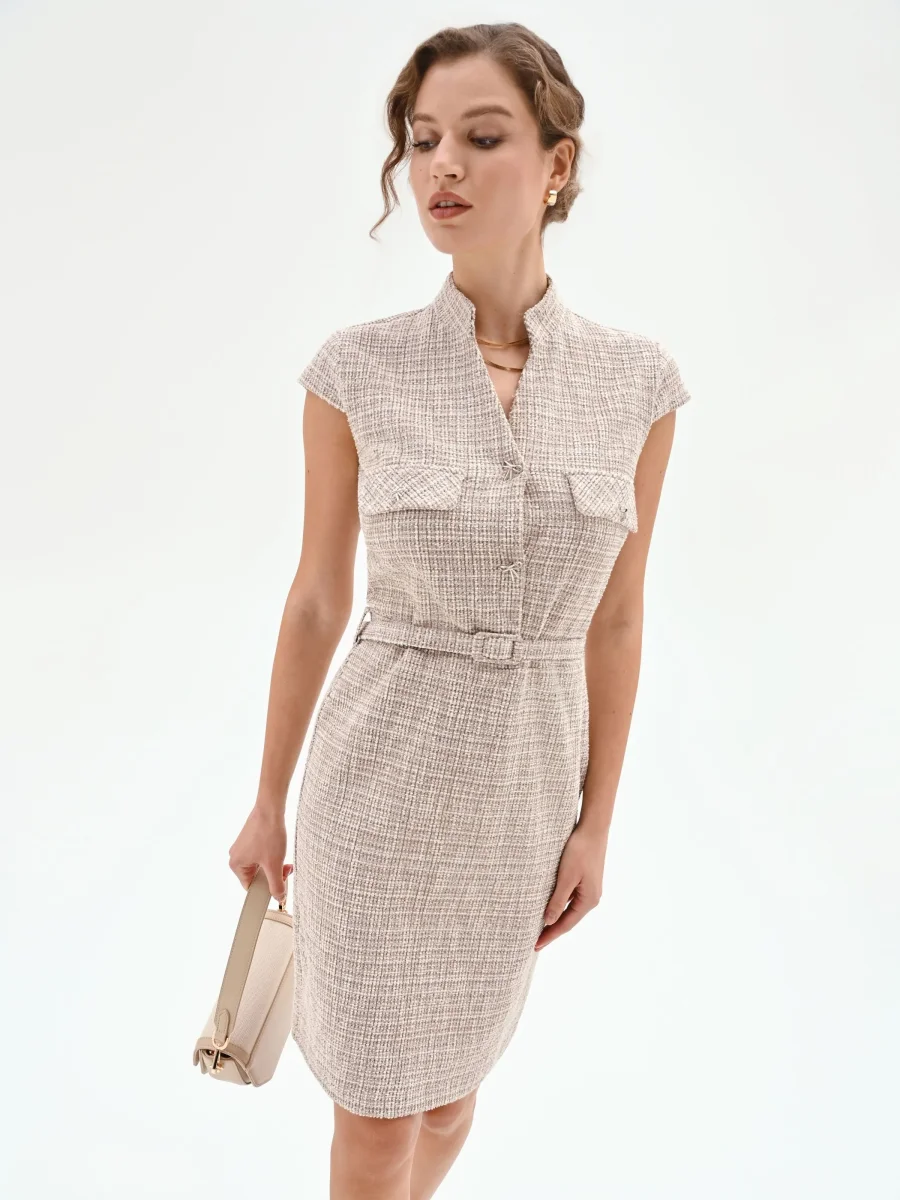 Abito a tubino beige chiaro in tweed con cintura