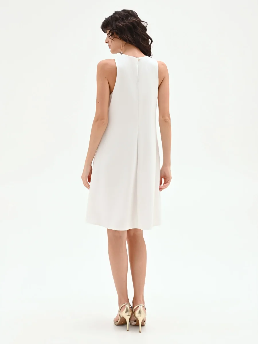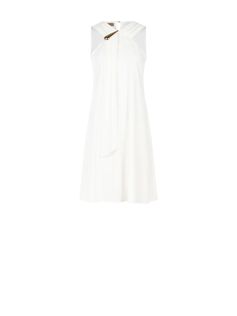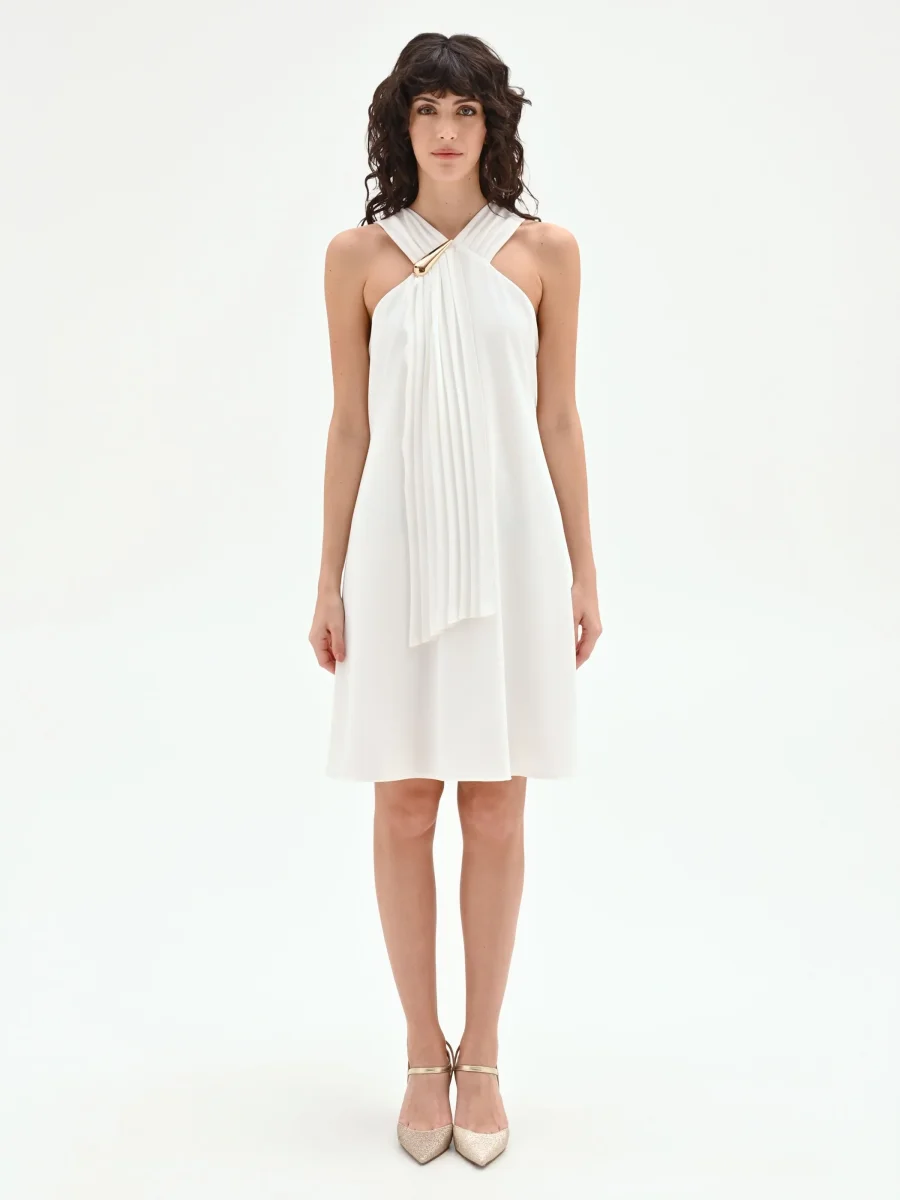 L’essenzialità del bianco incontra un design scultoreo nell’abito corto con spilla, una proposta moderna per le occasioni speciali. La texture materica del tweed crea un interessante contrasto con la linea pulita e svasata del modello, che scivola leggera sulla silhouette. Il décolleté è protagonista grazie allo scollo all’americana, con fasce che si incrociano elegantemente e sono fermate da una spilla gioiello in metallo dorato. Da questo punto luce parte un fitto plissé che dona un movimento verticale e dinamico al corpino, esaltando la figura con grazia. Questo abito è la scelta perfetta per un evento che richiede un dress code elegante ma non convenzionale. Immaginalo come protagonista di un look total white per un party esclusivo, o come originale cambio d’abito per una sposa moderna e chic. La chiusura posteriore garantisce una vestibilità perfetta. Abbinalo a sandali con tacco e a una pochette coordinata per un look completo e ricercato.