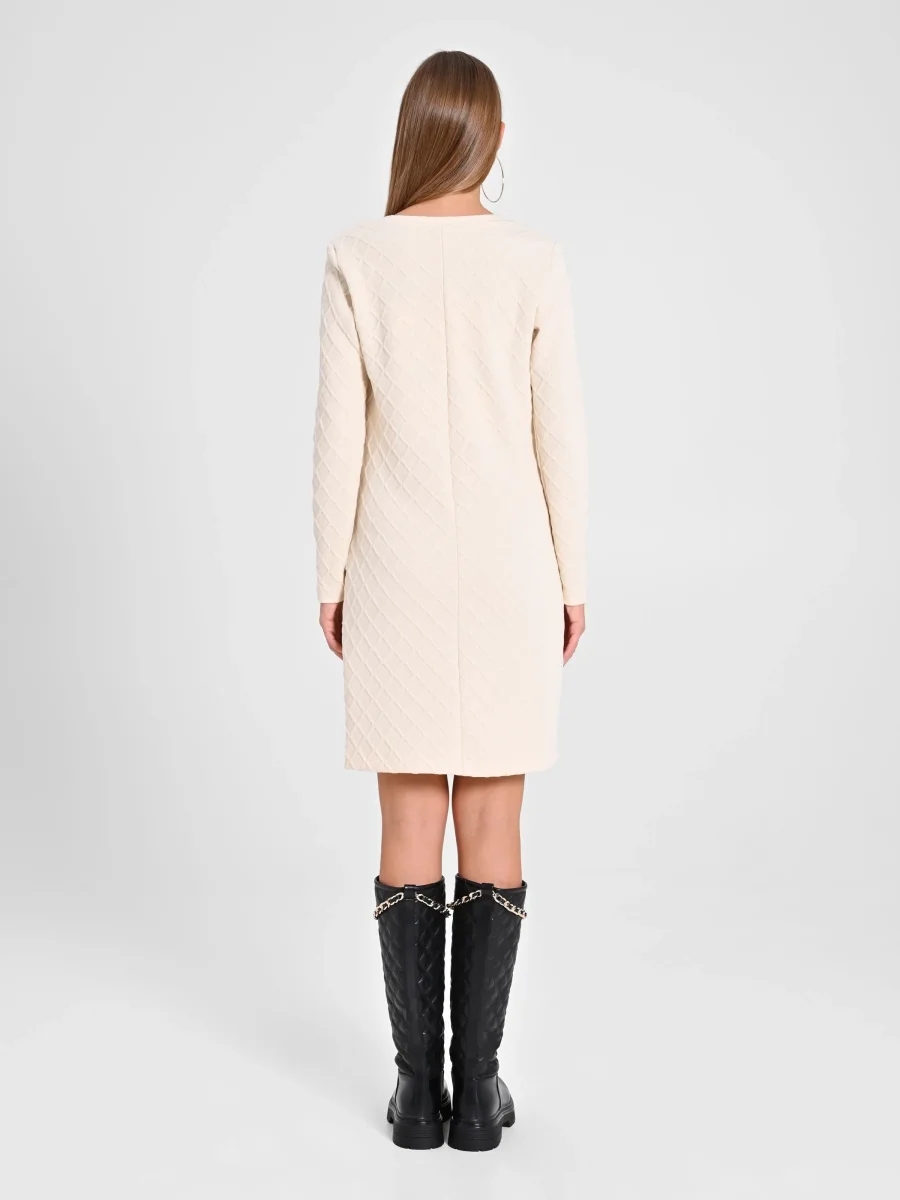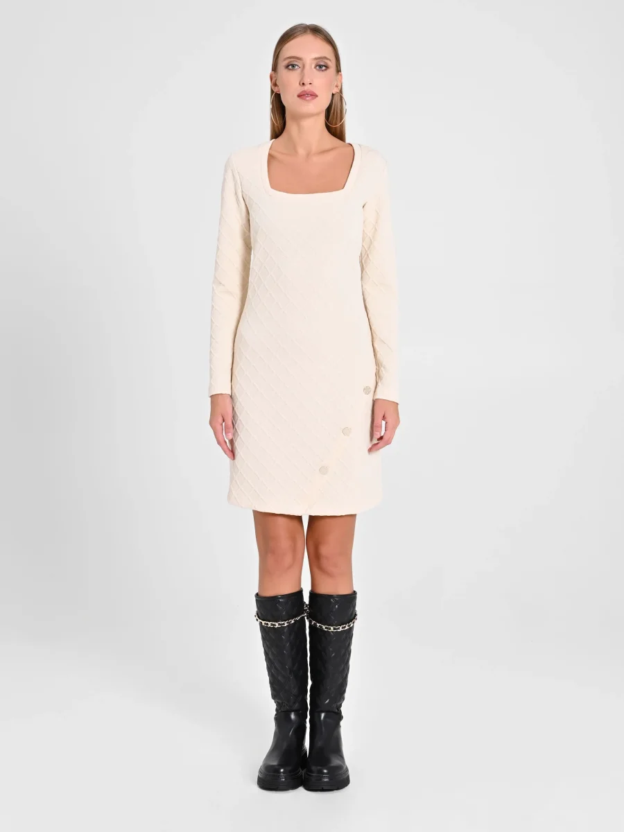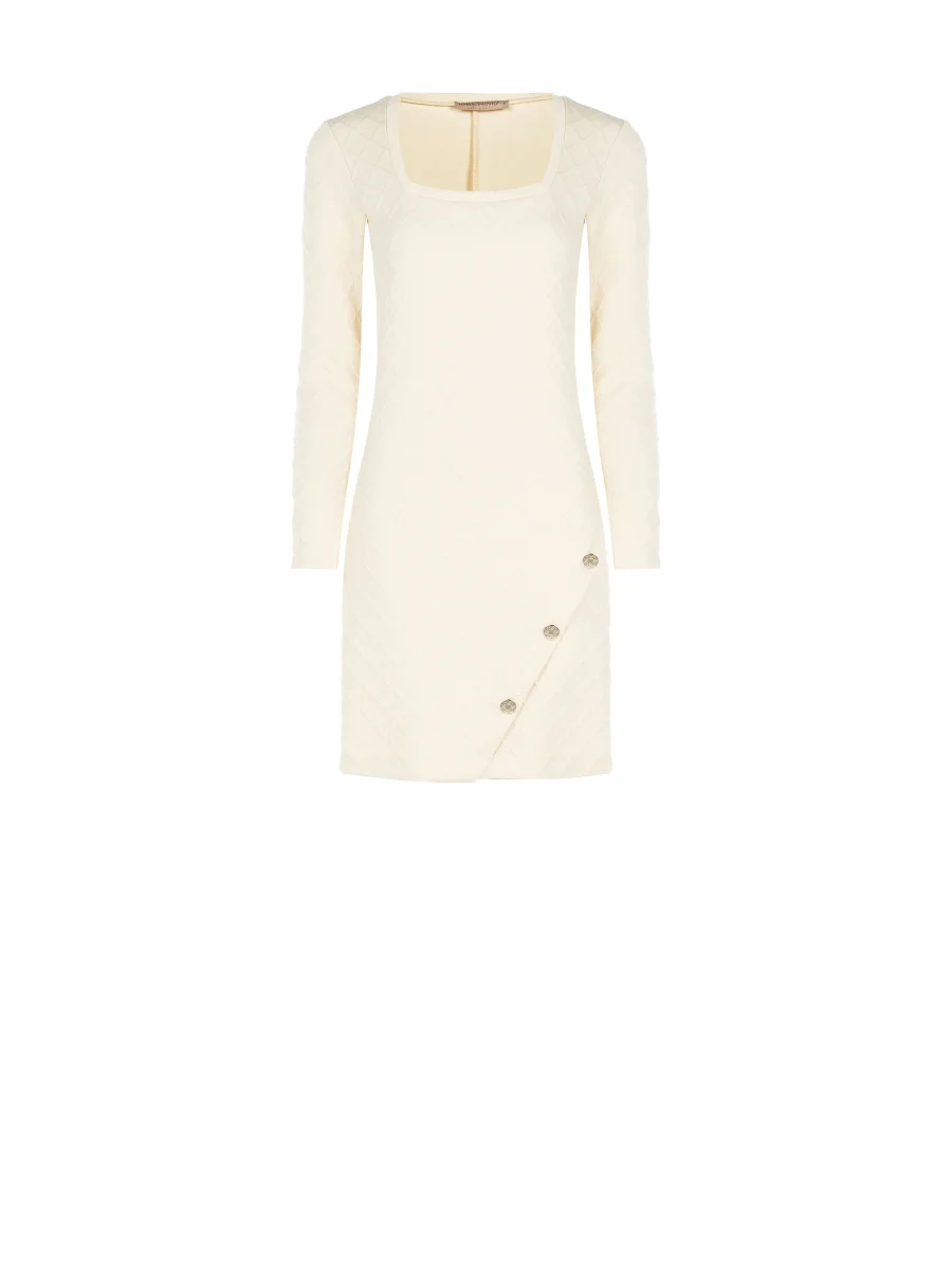 Abito modello tubino, realizzato in morbido jersey operato, con disegno rombi a rilievo. Il tubino ha lo scollo quadrato ed è decorato da una fila di bottoni decorativi apposta nella parte inferiore. L’abito bianco in tessuto operato è ideale per i mesi invernali, essendo realizzato in un tessuto caldo e morbido. Completa il tuo look personalizzando con un paio di anfibi, per un look casual, oppure un paio di stivali con tacco alto. Il capo è interamente made in Italy, la modella è alta 1.76 m ed indossa la taglia S/me. Il capo in taglia S corrisponde alle seguenti misure: lunghezza 89 cm, busto 40 cm, vita 40 cm.