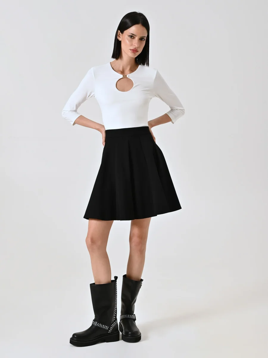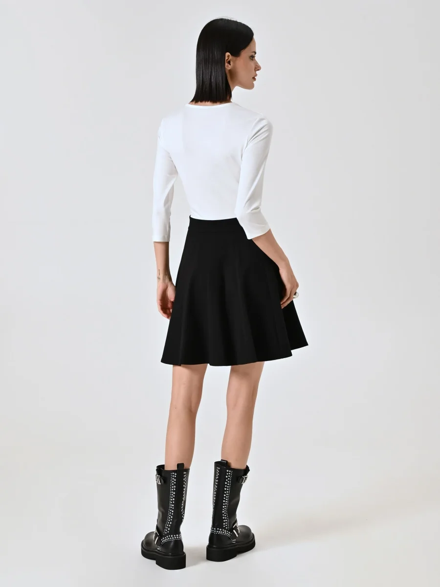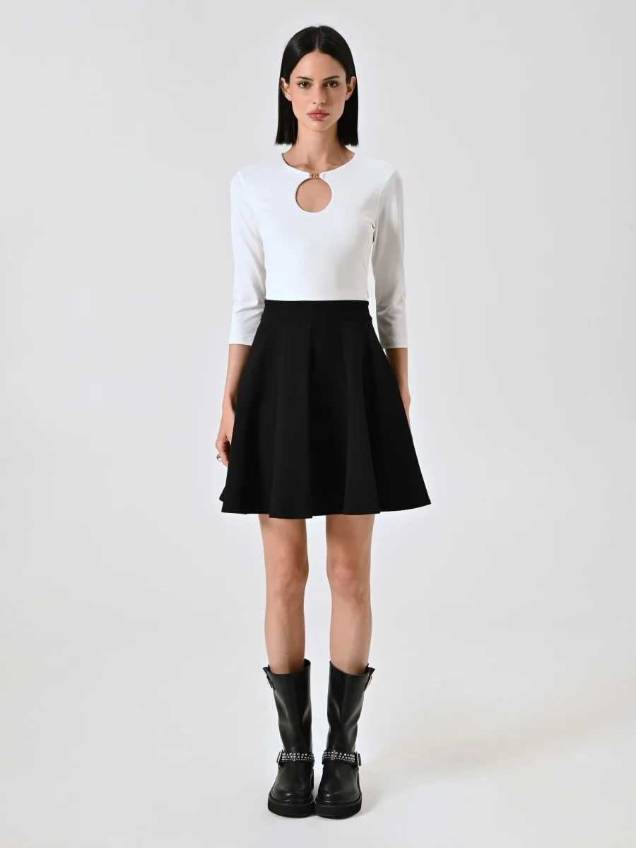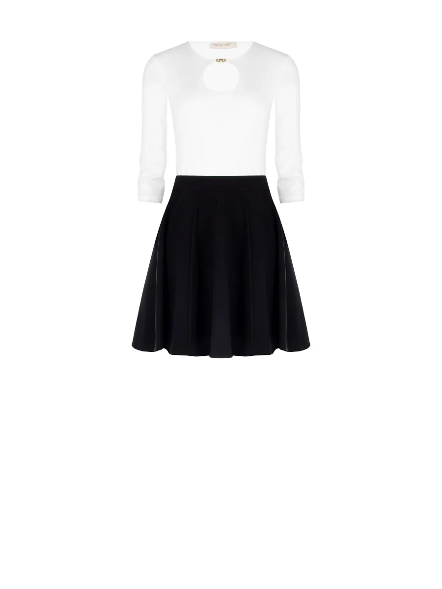 Realizzato con la gonna in punto milano e la blusa in jersey, l’Abito Bicolor a Ruota presenta una struttura armoniosa: la parte inferiore ampia e fluida si abbina alla parte superiore attillata, arricchita da uno scollo a goccia e dal dettaglio logo RR. La chiusura con zip laterale consente una vestibilità pratica e femminile.