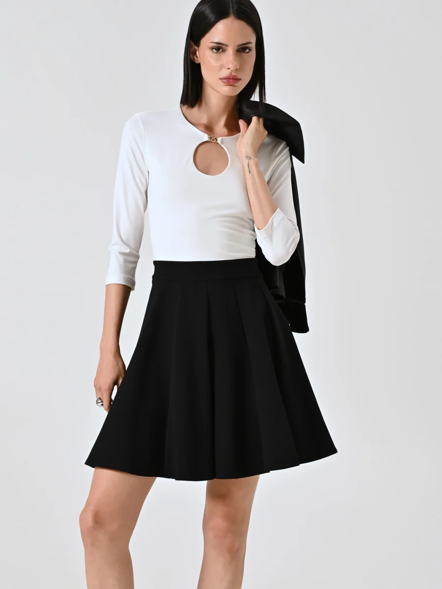 L’Abito Bicolor a Ruota è un modello dal fascino senza tempo, pensato per valorizzare la silhouette con un gioco di volumi e contrasti cromatici.