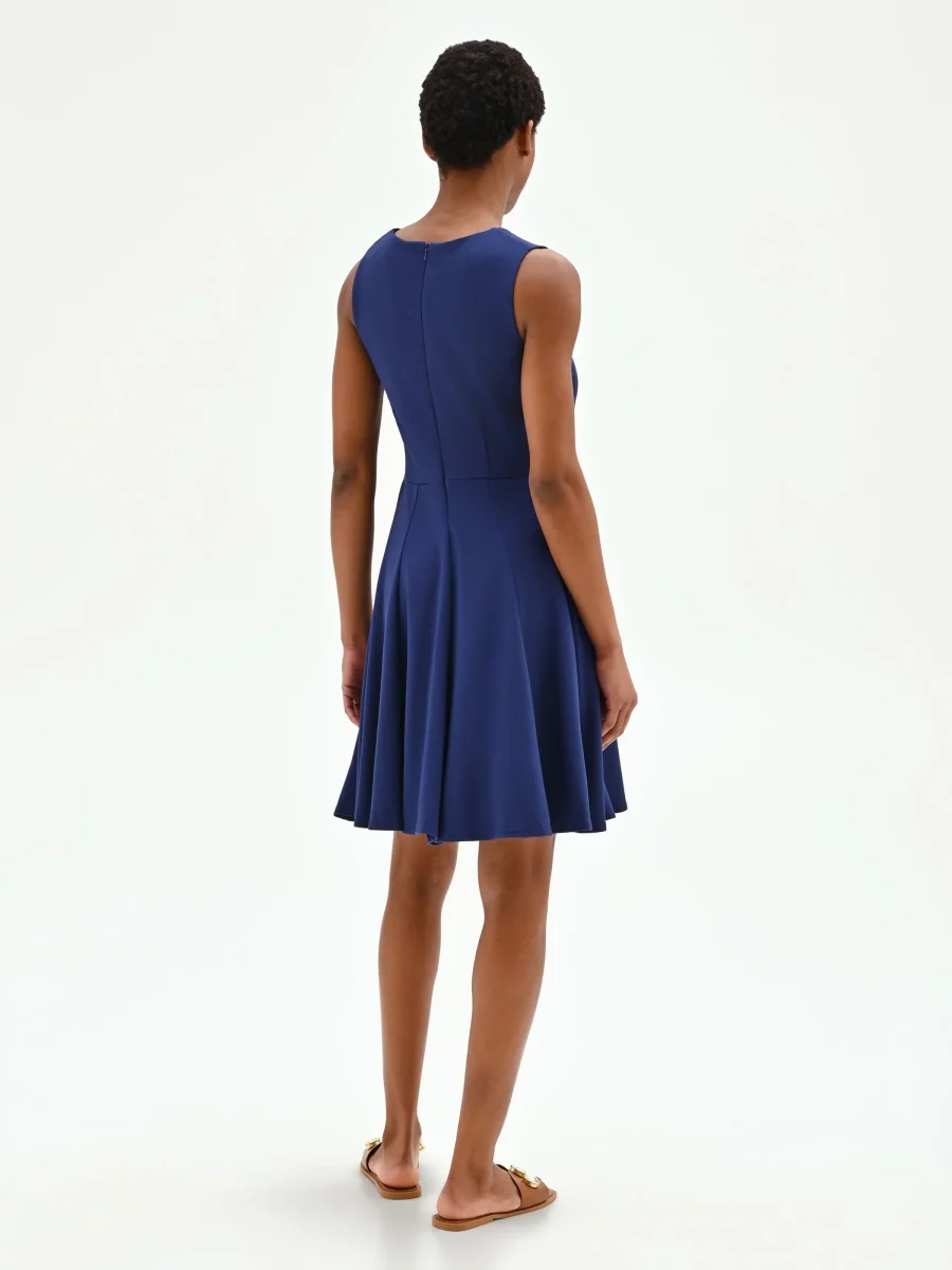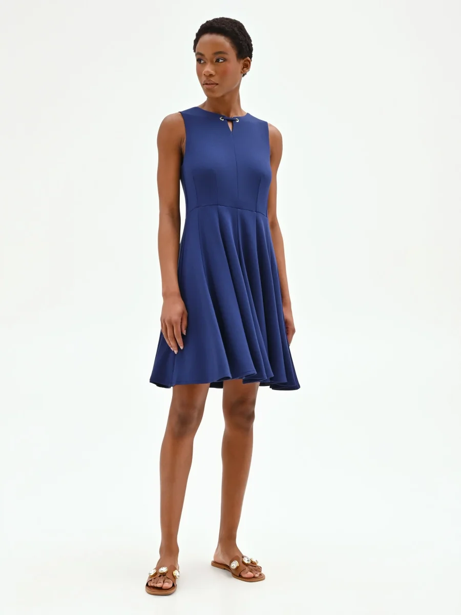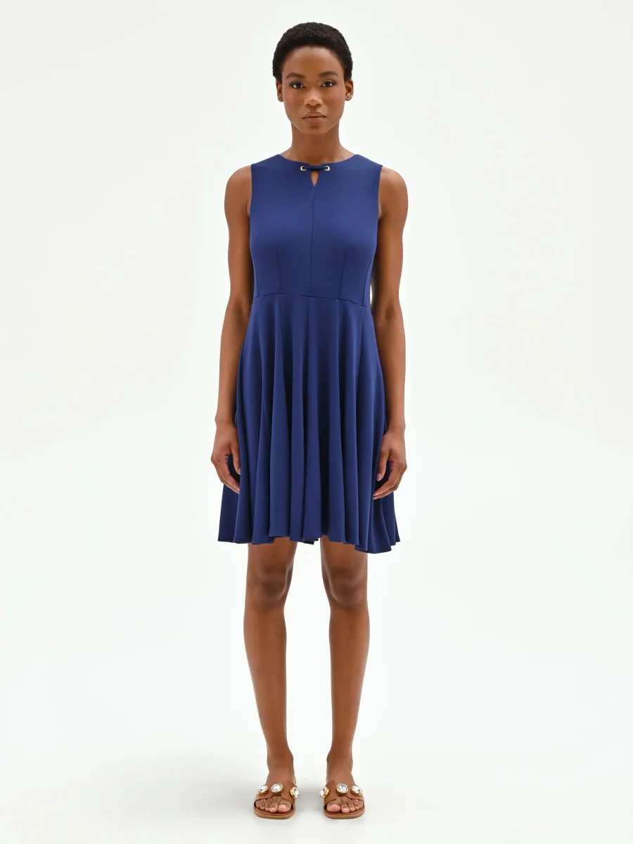 Un equilibrio perfetto tra comfort e femminilità definisce l’abito blu in punto milano, una proposta versatile pensata per accompagnare con stile i momenti della vita quotidiana. Il design gioca con la classica silhouette fit-and-flare, valorizzando la figura con un corpetto aderente, definito da cuciture verticali che slanciano il busto. Il punto vita è segnato con precisione, da cui si apre una gonna corta e svasata, animata da ampie pieghe che le conferiscono volume e un movimento fluido ad ogni passo. Il dettaglio che cattura l’attenzione è lo scollo rotondo, arricchito da una piccola apertura a goccia fermata da un elemento metallico color argento, un tocco di luce che illumina il viso. La texture del punto milano garantisce una vestibilità comoda e una linea sempre curata, rendendolo un capo pratico e facile da indossare. Ideale per un look da giorno curato, si abbina splendidamente a un blazer per l’ufficio o a un cardigan leggero per il tempo libero. Completa il tuo stile con le calzature e le borse della collezione per creare un total look adatto ad ogni impegno.