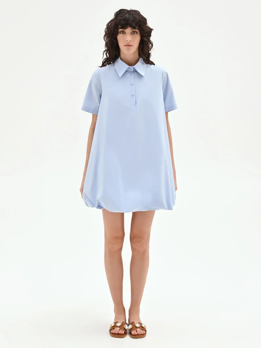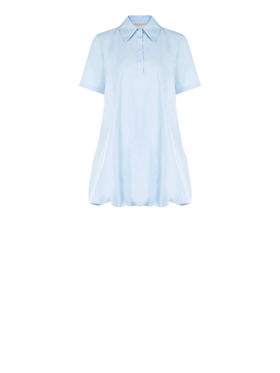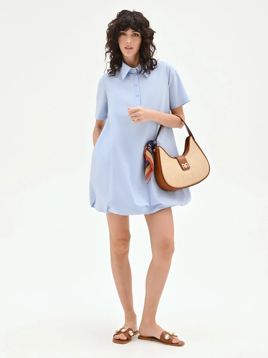 L’abito camicia azzurro reinterpreta un classico del guardaroba con un tocco di fresca contemporaneità, un invito a vivere la bella stagione con stile e leggerezza. Realizzato in un piacevole misto cotone, questo modello corto si distingue per la sua silhouette ampia e svasata, un design a trapezio che accarezza la figura garantendo massimo comfort e libertà di movimento. Il colletto classico dialoga con uno scollo a serafino, definito da una pratica abbottonatura parziale con bottoni in tinta. Le maniche, corte e dritte, contribuiscono a bilanciare le proporzioni, mentre l’originale orlo inferiore con finitura a palloncino dona al capo un volume dinamico e un fascino unico. Pensato per la quotidianità, questo abito è la scelta ideale per il tempo libero o per un appuntamento informale. Indossalo con accessori daily, come sandali bassi o una borsa a tracolla, per un look curato e spontaneo che esprime una femminilità rilassata.