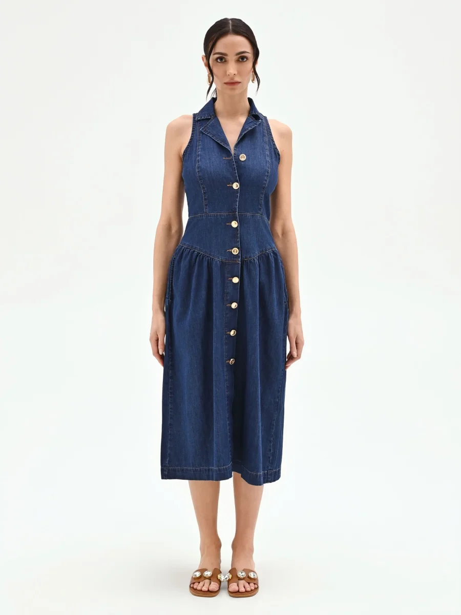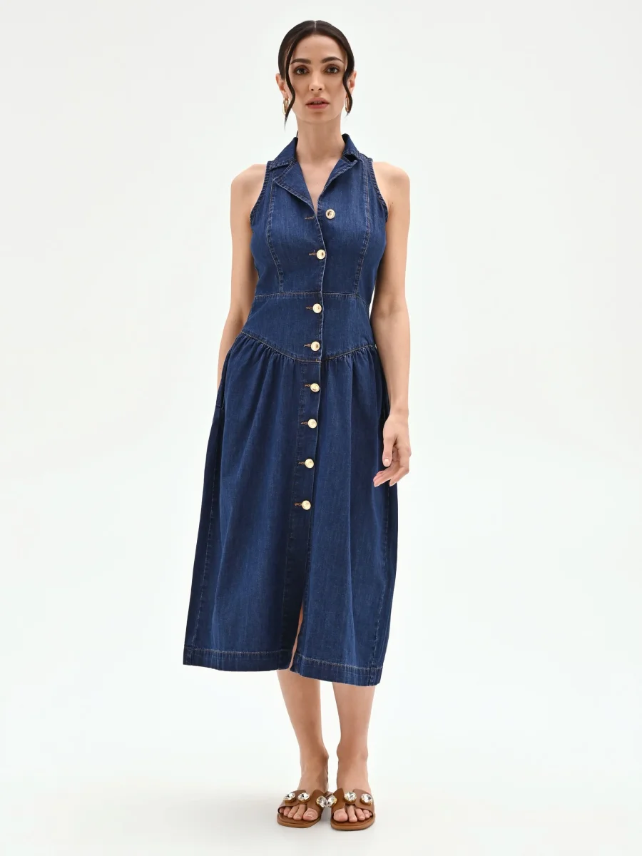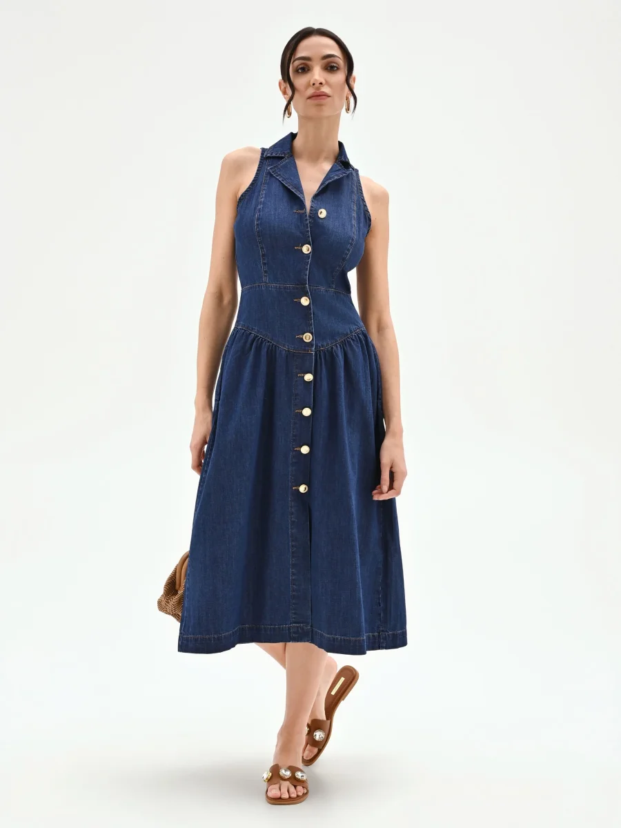 Il fascino intramontabile del denim incontra un design femminile e versatile in questo abito chemisier, una proposta fresca e contemporanea per la stagione. Realizzato in denim blu, il modello è pensato per chi cerca uno stile disinvolto senza rinunciare a un tocco di ricercatezza per le proprie occasioni quotidiane. Il corpetto sagomato disegna con cura la silhouette, valorizzata da un particolare scollo all’americana completato da un colletto a camicia che lascia elegantemente le spalle scoperte. La chiusura frontale, che percorre l’intera lunghezza del capo, è definita da luminosi bottoni metallici dorati che creano un piacevole contrasto con il tessuto. Il punto vita è sottolineato da un taglio netto, da cui si apre un’ampia e fluida gonna a ruota che dona movimento e leggerezza a ogni passo. Perfetto per un look casual ma sempre curato, questo abito si adatta con facilità dal tempo libero a un appuntamento in città. Abbinalo con sandali bassi per un’allure rilassata o con zeppe per slanciare la figura, completando l’outfit con una borsa a tracolla di collezione.