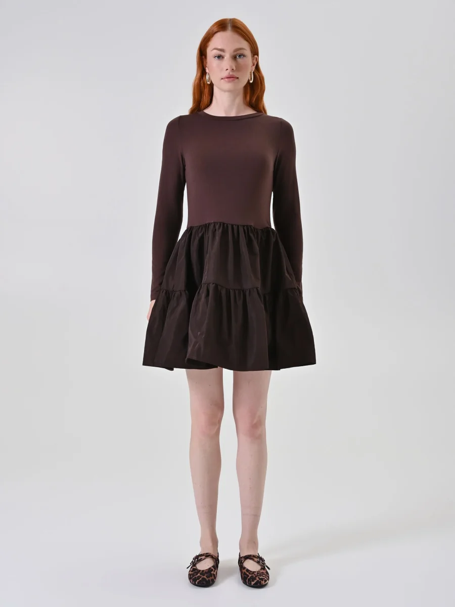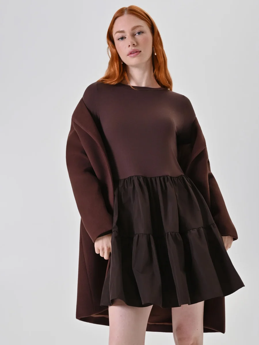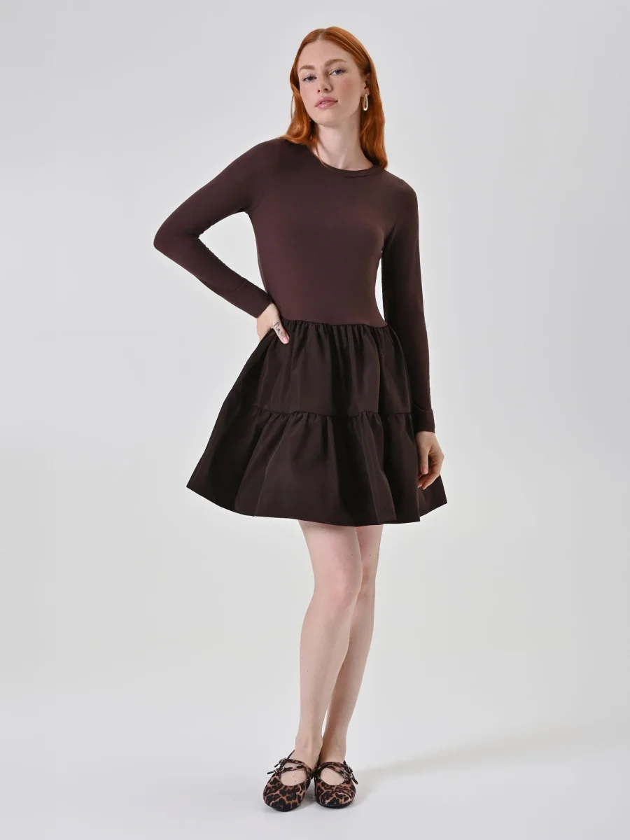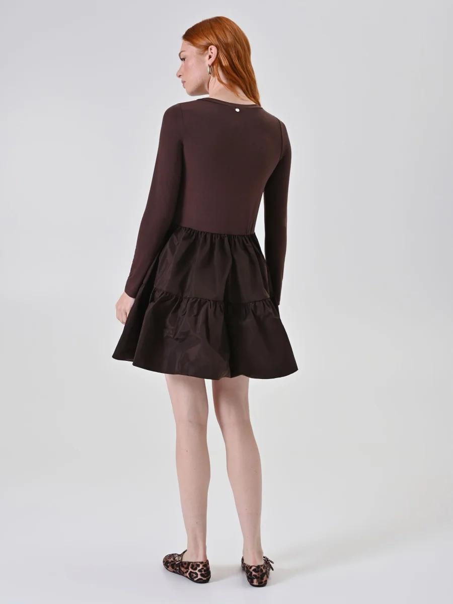 Abito cioccolato bi-materico con gonna a balze
