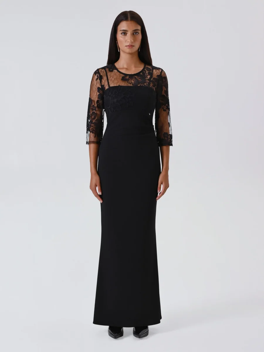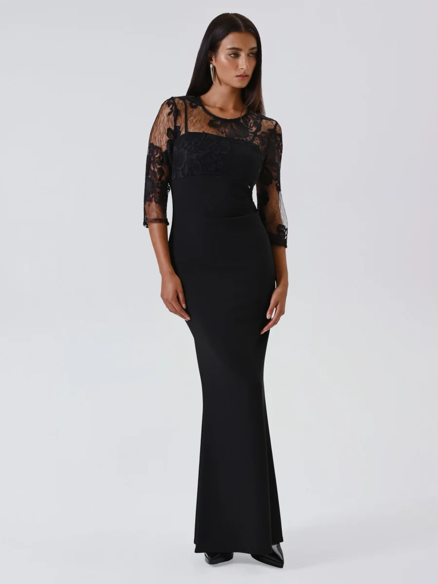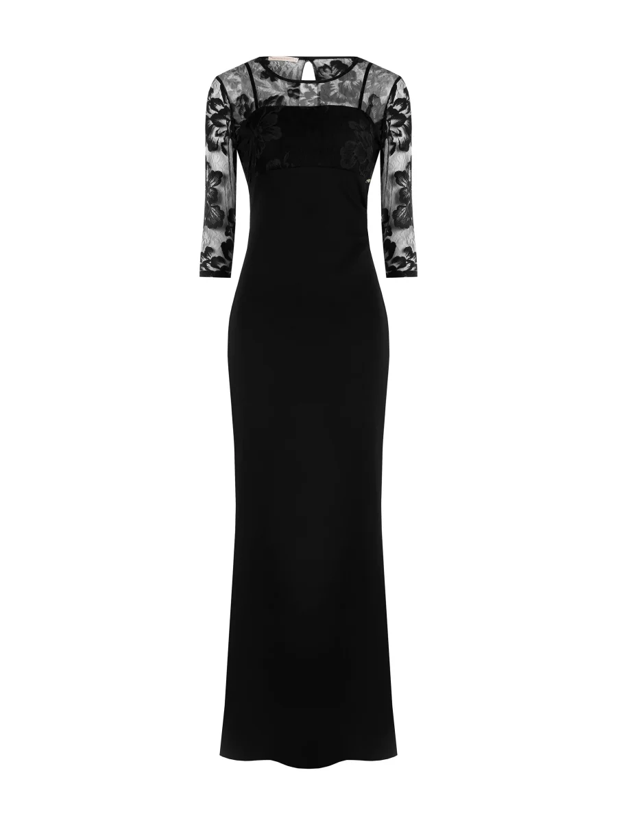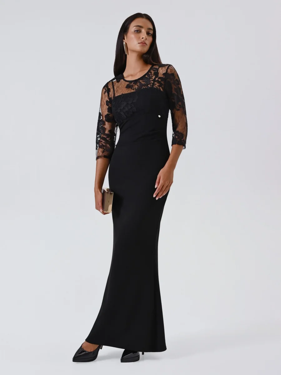 Realizzato in scuba crepe con una raffinata blusa in pizzo rebrodé che sormonta l’abito con spalline sottili, unisce comfort e stile in un’unica soluzione. La chiusura con zip posteriore e piccolo bottoncino assicura praticità e una vestibilità impeccabile, mentre il contrasto tra il tessuto fluido e la leggerezza del pizzo crea un effetto visivo armonioso e di grande impatto.