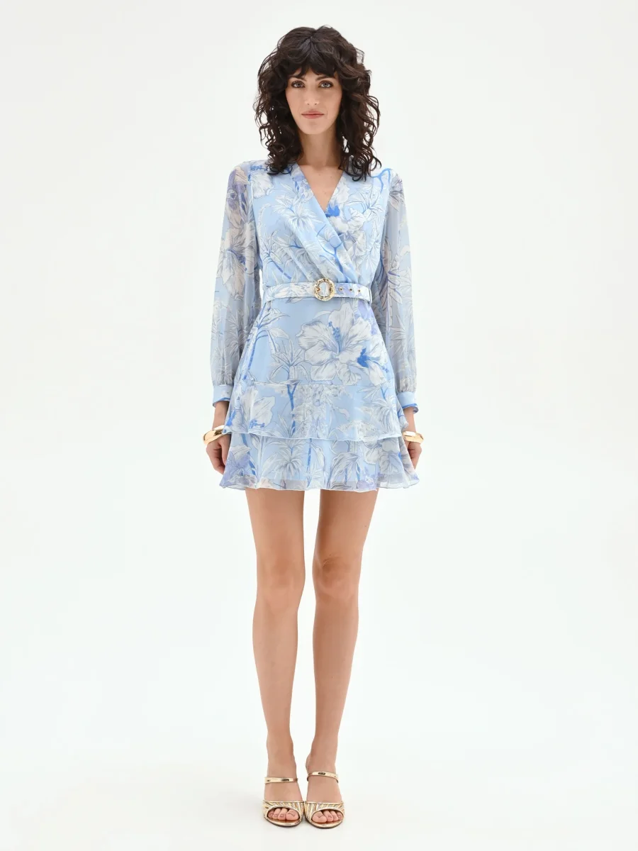 Un delicato motivo floreale sui toni del celeste e del bianco anima questo abito corto, una proposta fresca e femminile per i look da giorno. Realizzato in raso leggero, il suo design fluido accarezza la silhouette con grazia. Il modello si distingue per lo scollo a V a incrocio, che valorizza il décolleté, e per le maniche lunghe leggermente a sbuffo, rifinite da un comodo polsino elasticizzato. La silhouette ad A, sempre attuale, è enfatizzata in vita da una cintura abbinata, impreziosita da una fibbia tonda dorata che aggiunge un punto luce. La gonna corta e svasata acquista un movimento dinamico e romantico grazie alla doppia balza sovrapposta che ne decora l’orlo. La chiusura è affidata a una zip posteriore. Perfetto per un appuntamento informale o un evento diurno, questo abito si presta a diverse interpretazioni di stile, da completare con accessori e calzature di collezione per un outfit curato in ogni dettaglio.