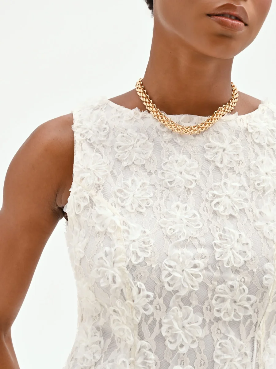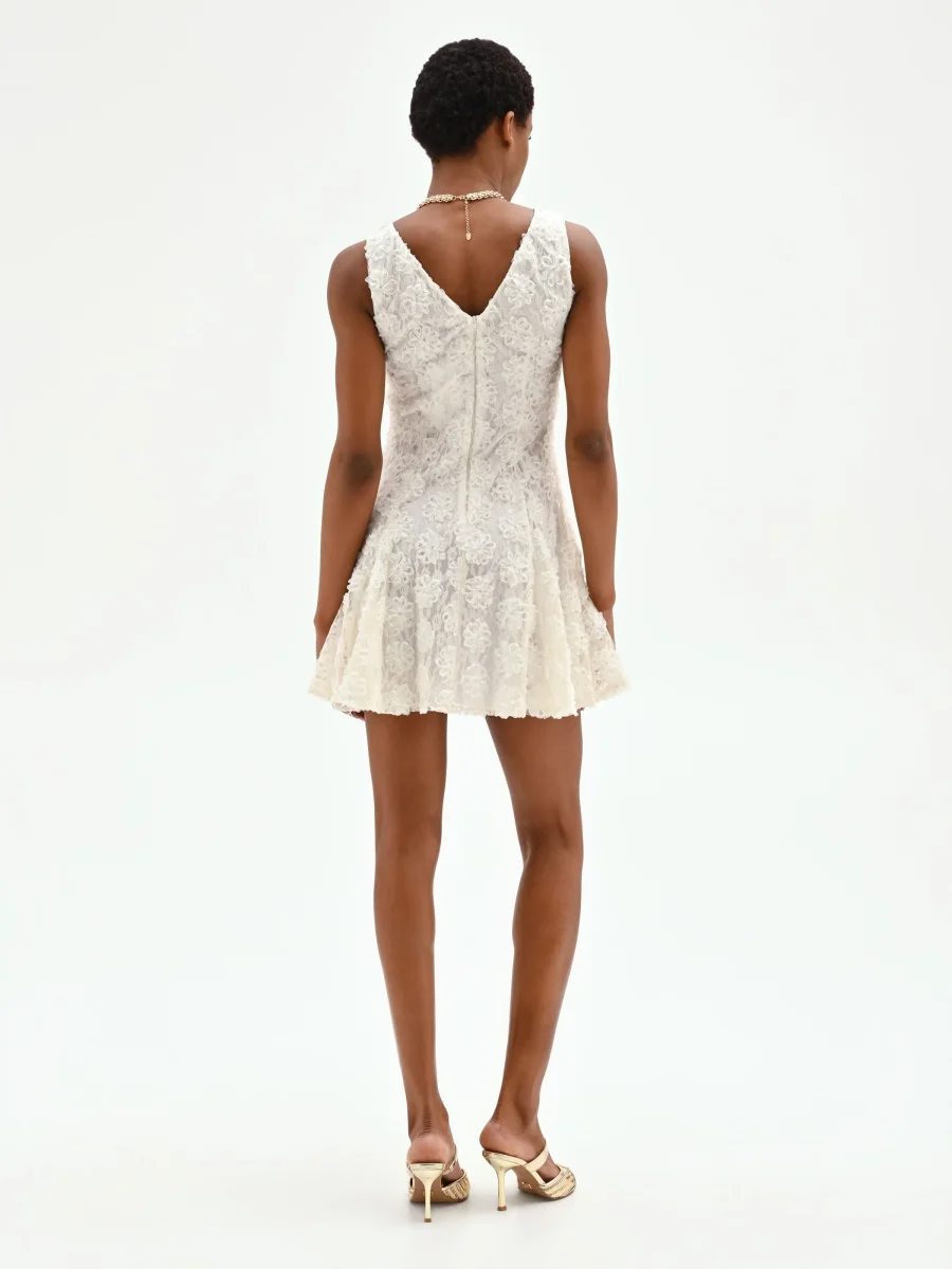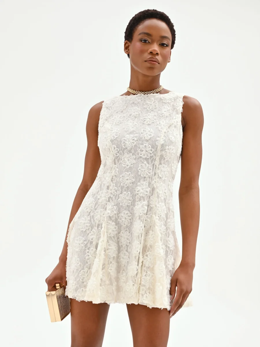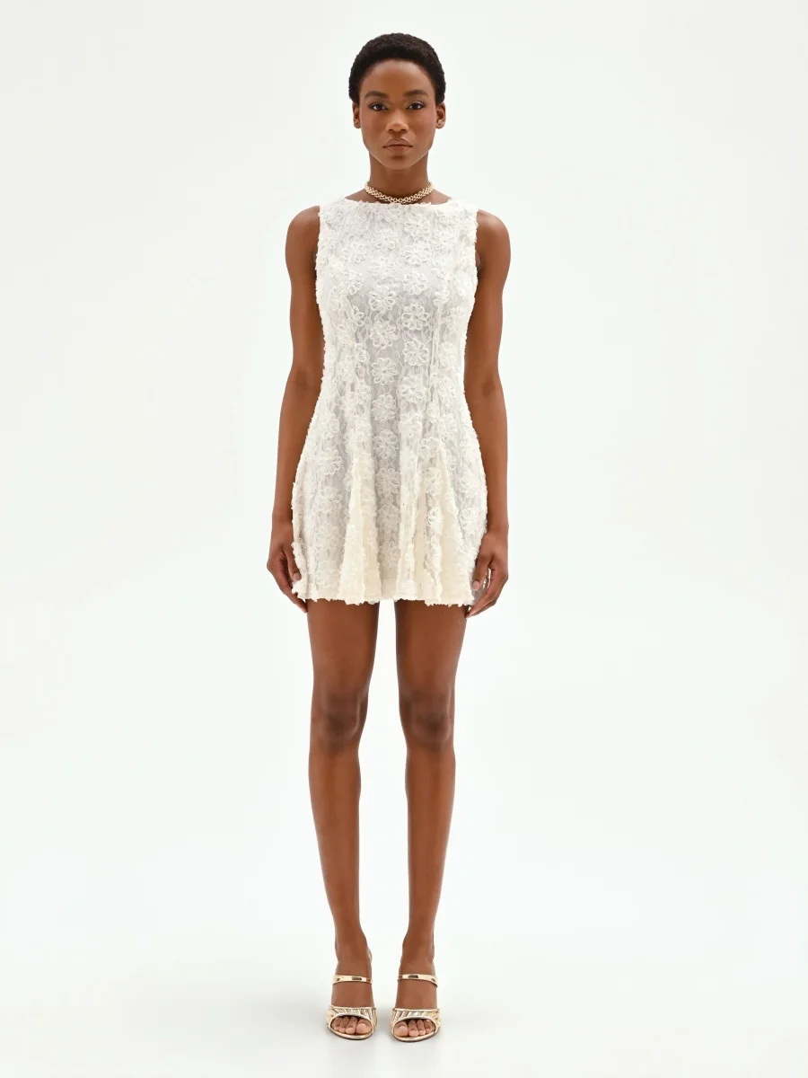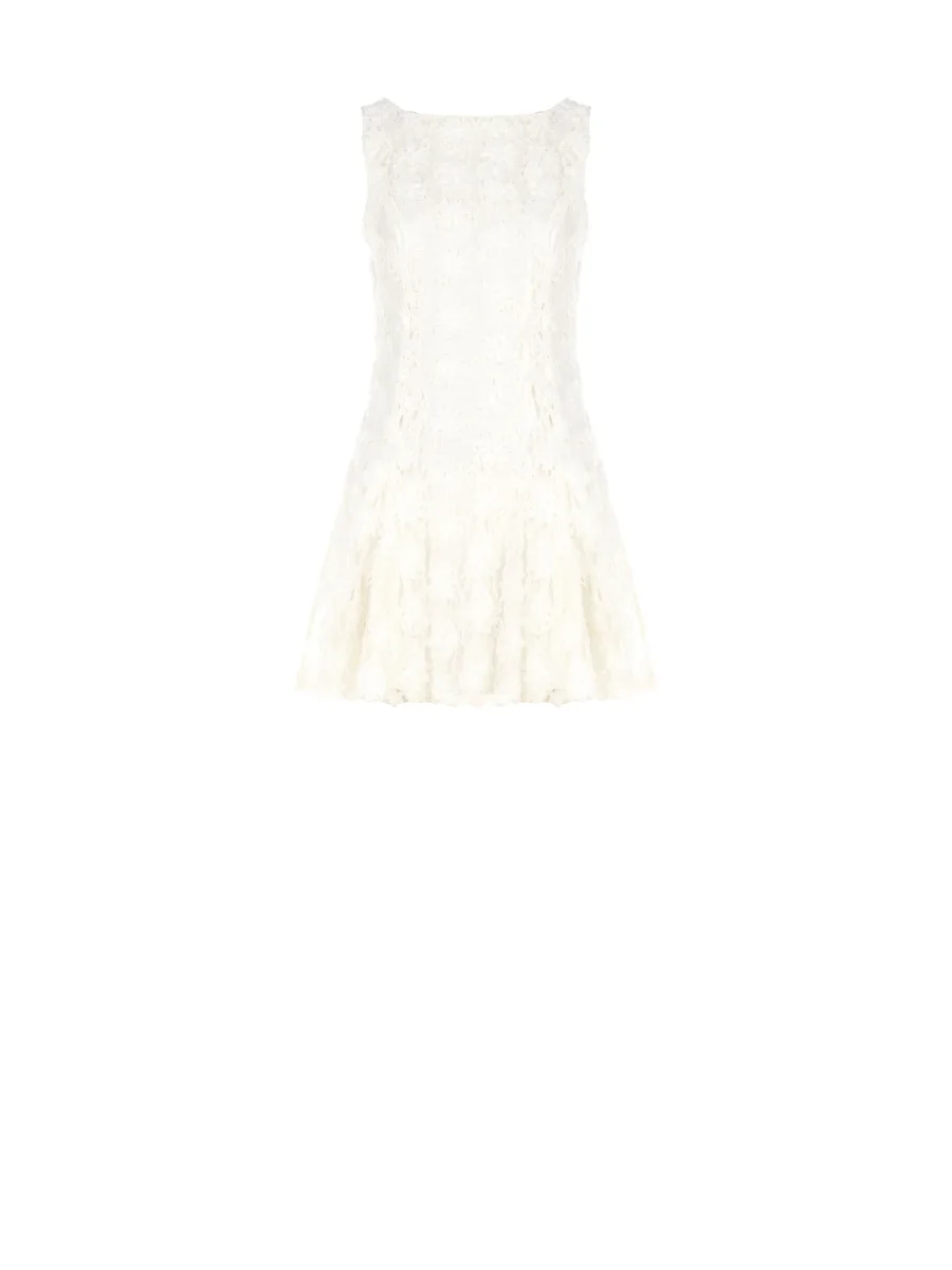 Una texture tridimensionale e romantica sboccia su questo mini abito bianco, un capo pensato per catturare la luce e l’attenzione con un’eleganza contemporanea. La sua unicità risiede nelle raffinate applicazioni floreali all-over, create su una base impalpabile di pizzo e tulle che crea un delicato gioco di trasparenze e matericità. Ogni dettaglio è studiato per esaltare la lavorazione del tessuto, rendendo il capo protagonista di ogni look. Il design smanicato con scollo a girocollo segue una linea pulita e leggermente svasata, mentre le cuciture verticali frontali definiscono e slanciano la figura con grazia. La pratica chiusura con zip sul retro si integra perfettamente nella struttura, assicurando una vestibilità ottimale. Perfetto per un cocktail party estivo, una cerimonia di giorno o un evento che richiede un look ricercato e originale. Per un outfit di carattere, abbinalo ad accessori bold: un sandalo con tacco alto o una mini bag a contrasto creeranno un equilibrio stilistico di grande impatto, esaltando la femminilità del vestito.