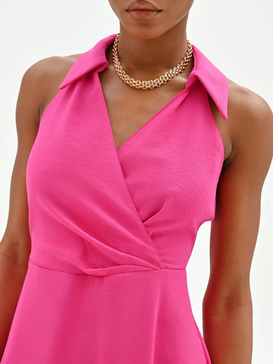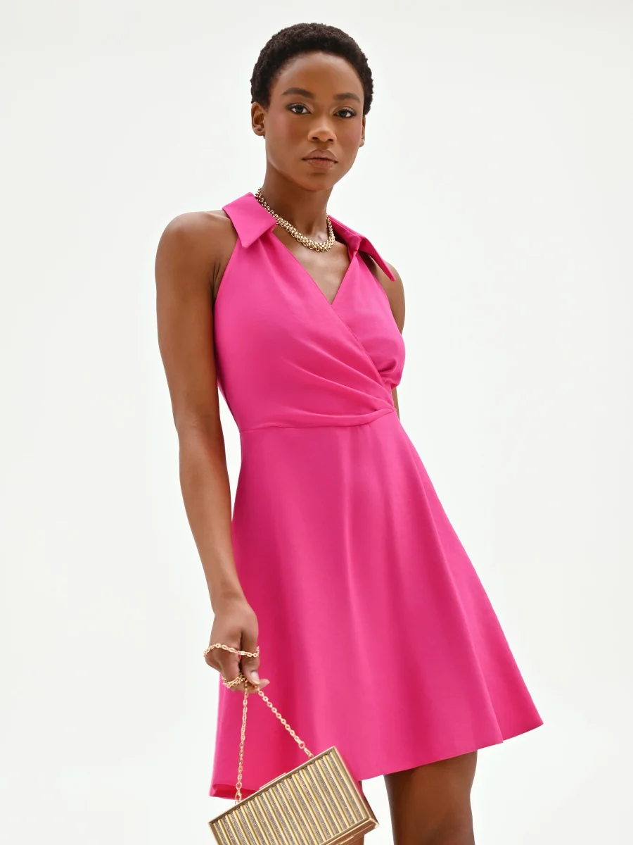 Il fucsia incontra un design fresco e contemporaneo in questo abito corto, una scelta di stile vibrante e femminile per la bella stagione. Realizzato in poliviscosa fluida e leggera, il capo si distingue per l’originale scollo all’americana rifinito da un colletto a camicia, un dettaglio che aggiunge un tocco ricercato e inaspettato al look. La parte superiore è disegnata con un motivo a portafoglio che crea un delicato incrocio sul davanti, delineando una scollatura a V che valorizza il décolleté. La gonna, dalla linea svasata e morbida, scende fluida sopra il ginocchio, garantendo comfort e un movimento aggraziato. La chiusura con zip posteriore è discreta e assicura una vestibilità perfetta. Grazie alla sua anima versatile, questo abito si presta a interpretare look diversi: abbinalo ad accessori daily per un’occasione informale, oppure trasformalo per la sera con un sandalo alto e una pochette per un aperitivo o una night out.