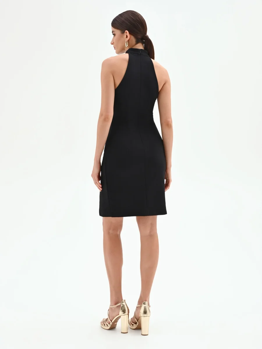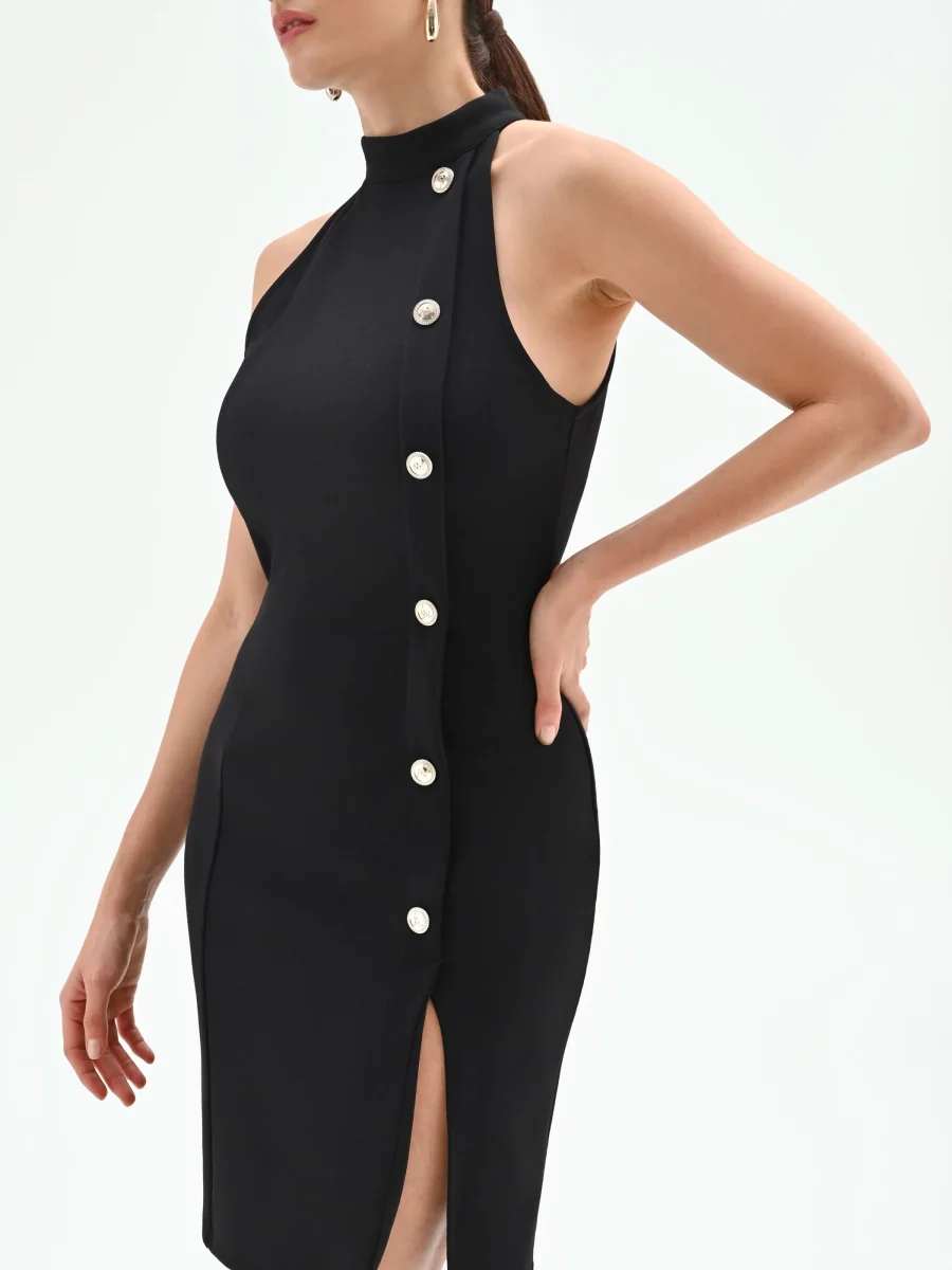 Realizzato in tessuto scuba stretch, questo abito corto nero si distingue per la sua vestibilità aderente che valorizza le forme. Lo scollo all’americana lascia le spalle scoperte, introducendo un dettaglio di raffinata sensualità. L’elemento che cattura l’attenzione è l’originale abbottonatura asimmetrica, definita da una fila di maxi bottoni metallici color argento che corrono lungo un lato del capo. Un profondo spacco laterale aggiunge un tocco di dinamismo e femminilità al design. La chiusura è con zip posteriore.