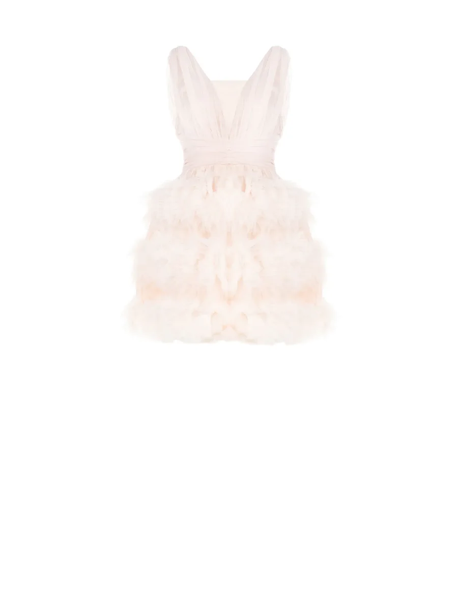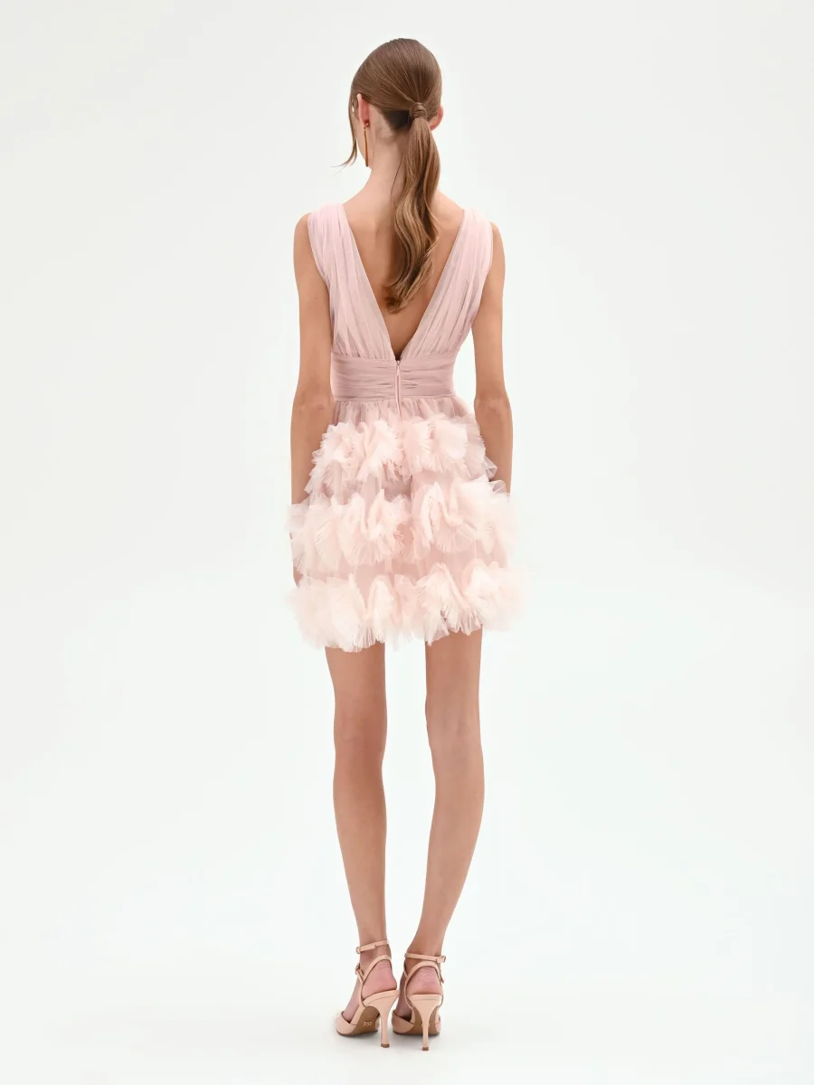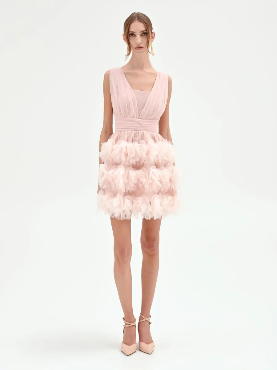 Un’allure romantica e audace si fonde nel mini abito rosa cipria, un capo pensato per catturare gli sguardi nelle serate più glamour. Il design gioca con elementi iper-femminili: il corpetto senza maniche presenta un profondo scollo a V, velato da un raffinato inserto in tulle plumetis che aggiunge un tocco di malizia. La silhouette è valorizzata da un fitto drappeggio verticale e da un’alta fascia arricciata che segna il punto vita, creando un piacevole contrasto con l’ampiezza della gonna.