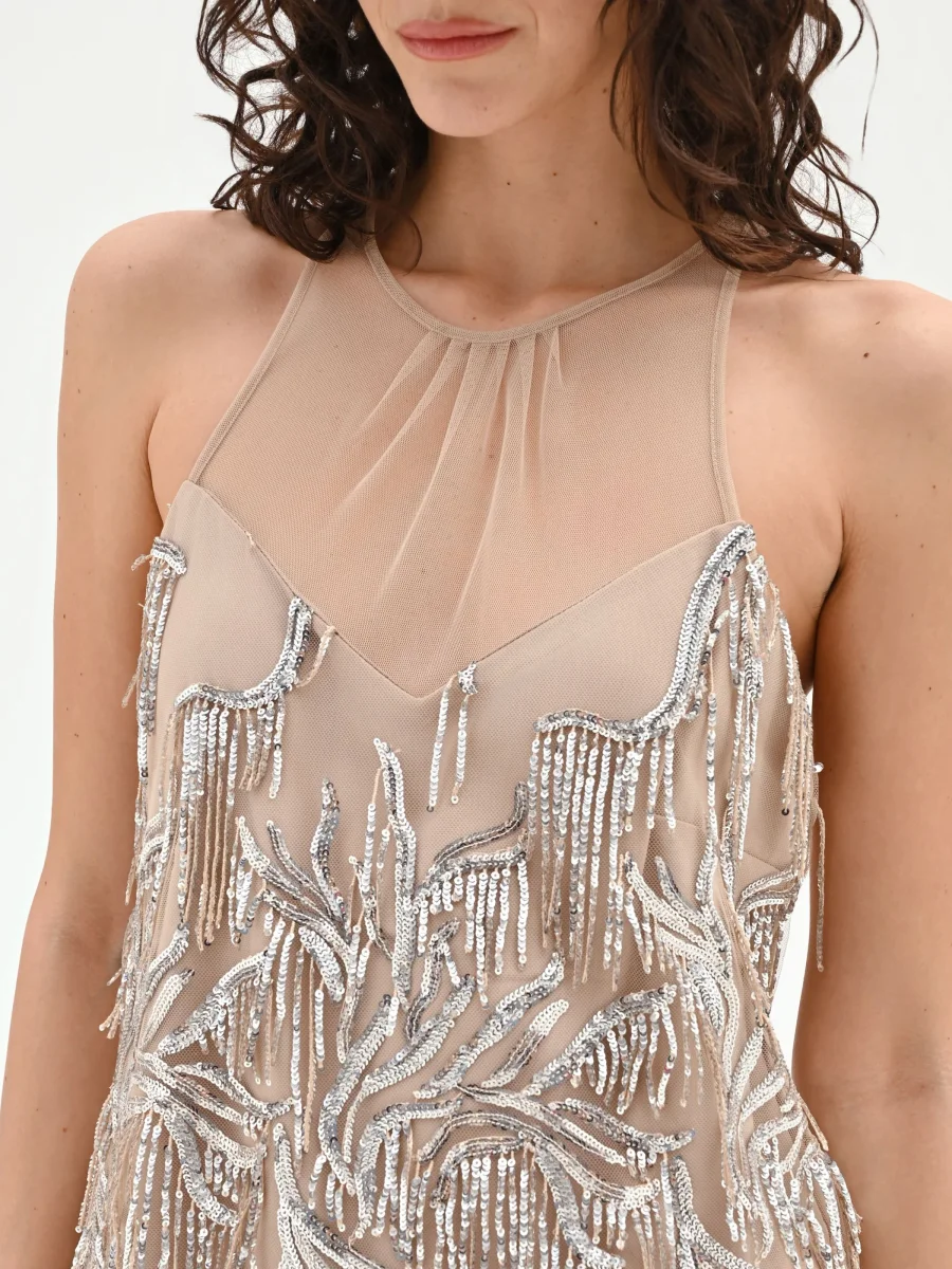 Un ricamo di luce e movimento definisce l’abito corto color tortora, un capo pensato per illuminare le occasioni più glamour. La sua intera superficie è un trionfo di paillettes e perline argentate, finemente ricamate per disegnare un motivo astratto che si conclude con un dinamico effetto a frange pendenti, pronte a seguire ogni passo con riflessi cangianti. La silhouette, dritta e smanicata, valorizza la figura, mentre il design si concentra sulla parte alta: lo scollo all’americana, con una delicata arricciatura, è caratterizzato da un carré in tulle trasparente che crea un sofisticato gioco di vedo-non-vedo, svelando il femminile corpino a cuore sottostante. La pratica chiusura posteriore completa il capo mantenendo la pulizia delle linee. Ideale per un cocktail party o una serata esclusiva, si abbina ad accessori brillanti e calzature alte per un look che non passerà inosservato.