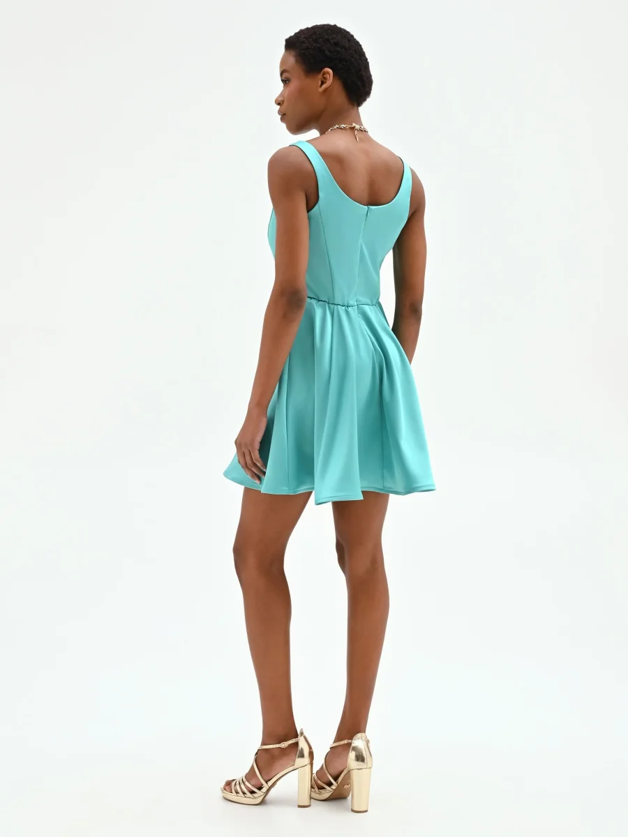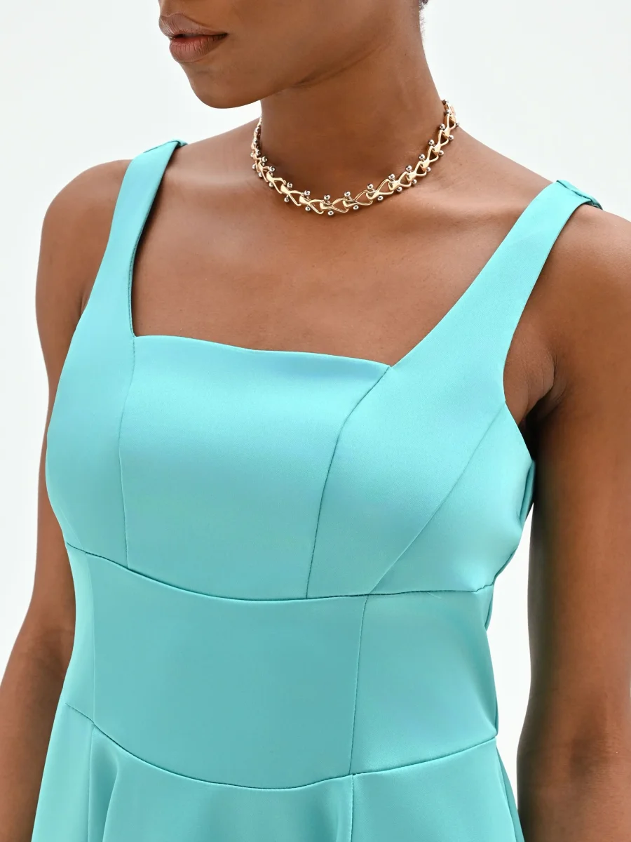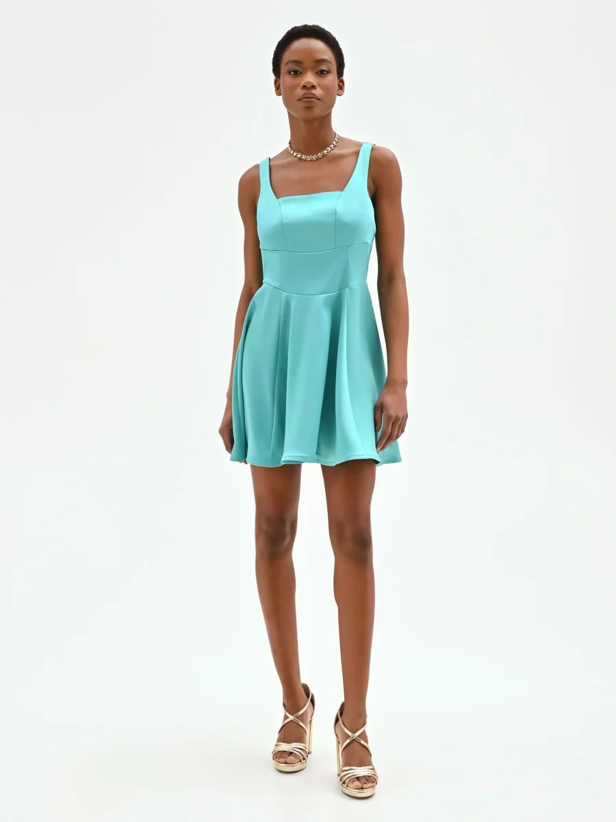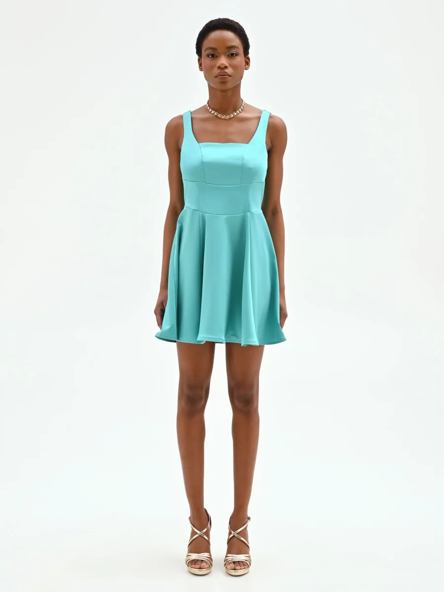 Abito corto turchese azzurro con scollo quadrato