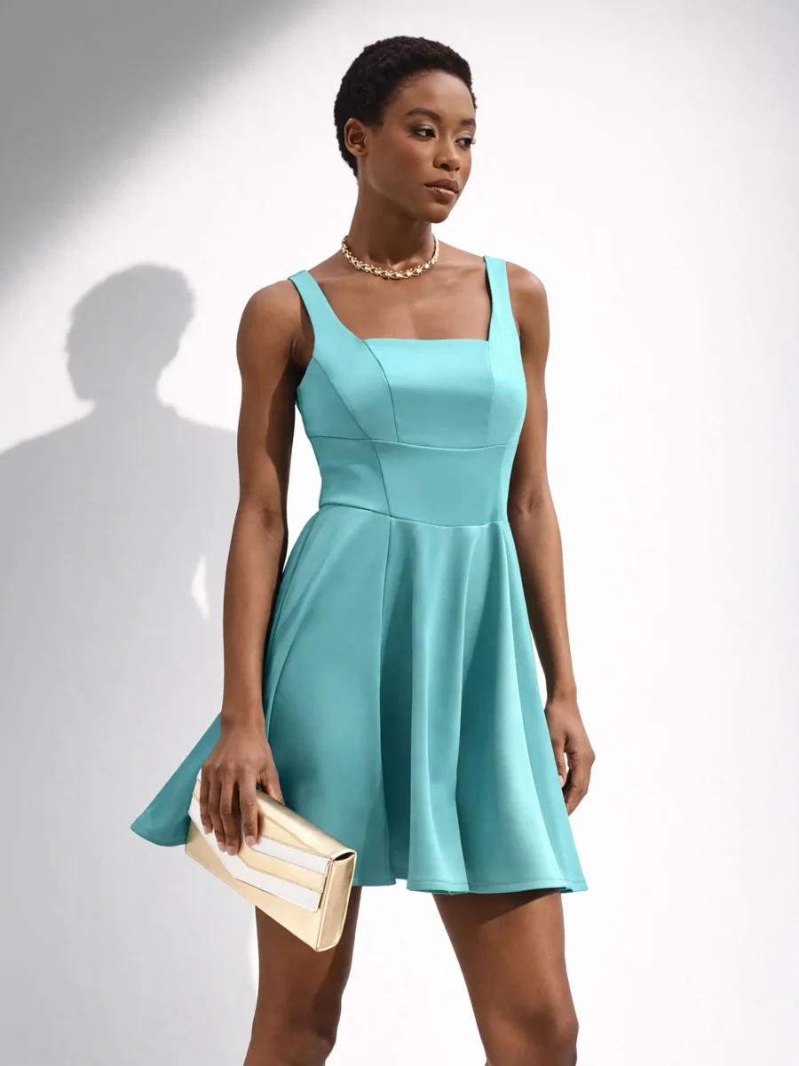 Linee essenziali e un colore vibrante definiscono l’abito corto turchese azzurro, un capo che celebra una femminilità moderna e decisa. Realizzato in raso liscio, la sua finitura luminosa cattura la luce ad ogni movimento, esaltando la brillantezza della nuance. Il design presenta uno scollo quadrato che incornicia con grazia il décolleté, sostenuto da spalline larghe per un comfort ideale. Il corpetto aderente, disegnato da precisi tagli verticali, valorizza il punto vita e accompagna le forme con armonia, aprendosi poi in una gonna corta e svasata. La chiusura con zip posteriore completa il modello con discrezione. Perfetto per un cocktail, una cena speciale o una cerimonia estiva, si abbina a un blazer o a un coprispalle di collezione per completare l’outfit. Aggiungi sandali alti e accessori luminosi per un look dal fascino indimenticabile.