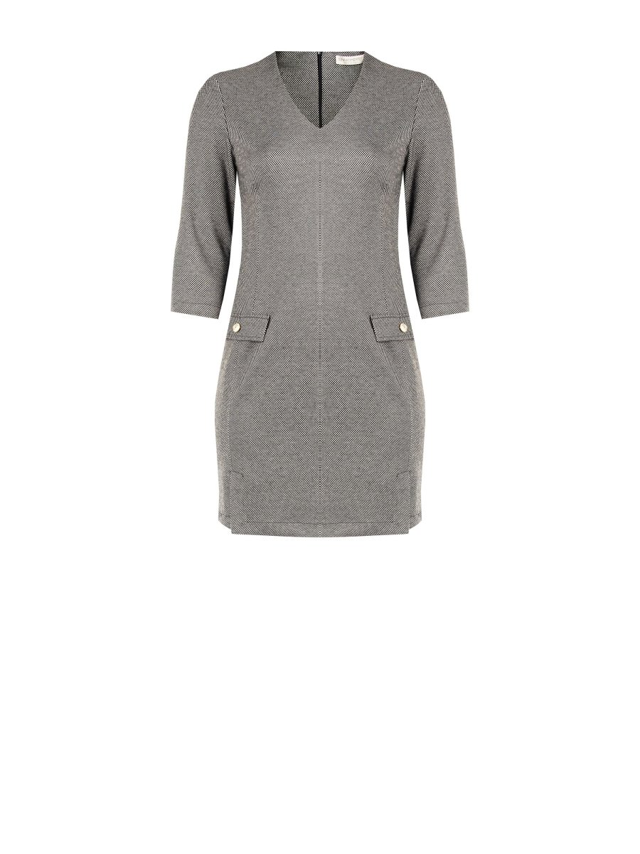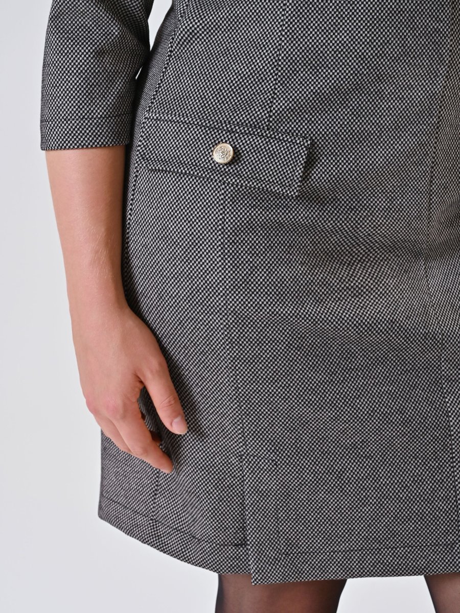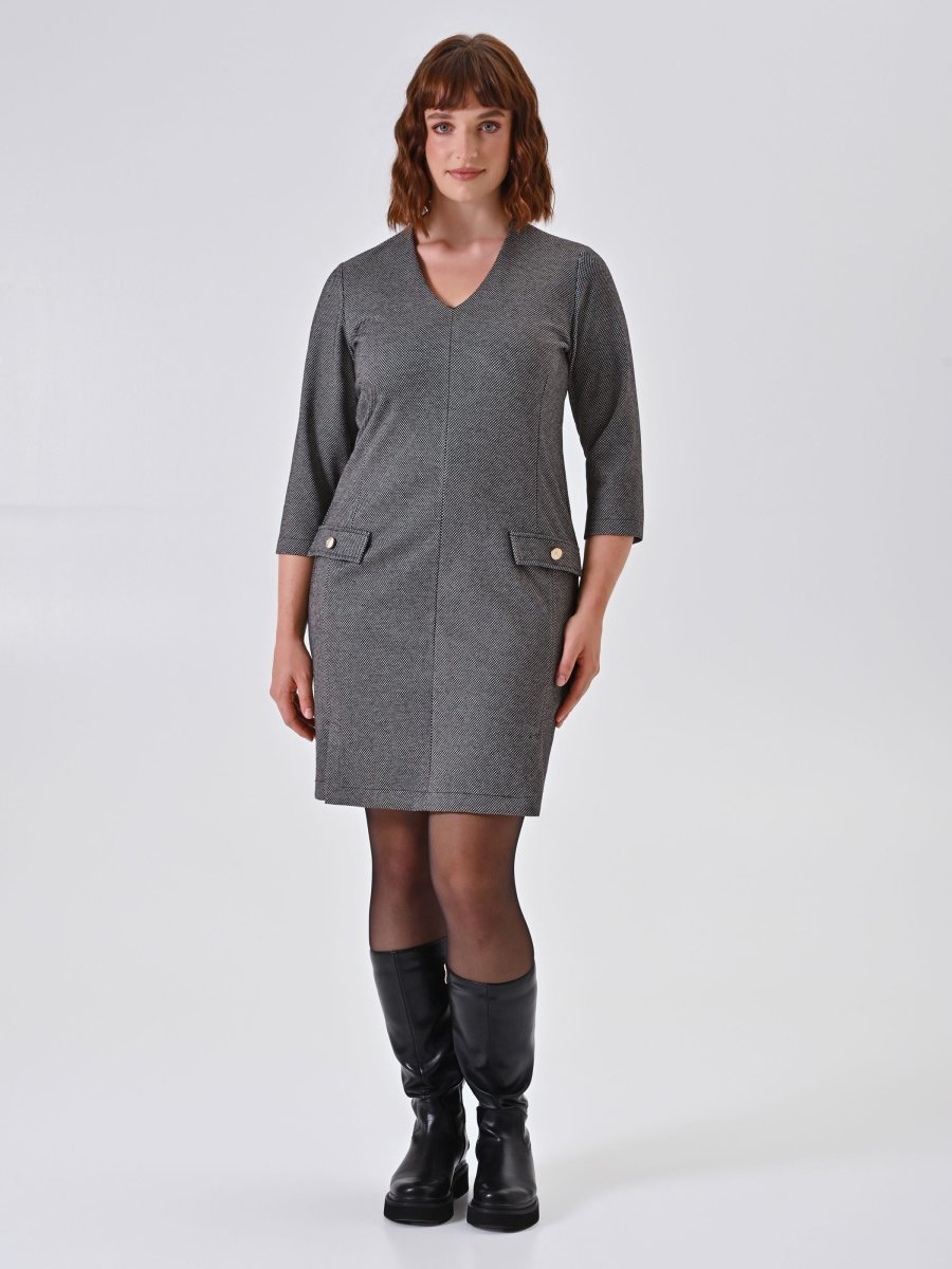 Realizzato in punto milano jacquard, l’Abito Curvy stampa Micro Geometrica unisce comfort e stile grazie alla sua struttura compatta che valorizza la silhouette. Lo scollo a V slancia la figura, mentre le patte effetto tasca aggiungono un dettaglio ricercato. La chiusura con zip posteriore assicura praticità e un design pulito.