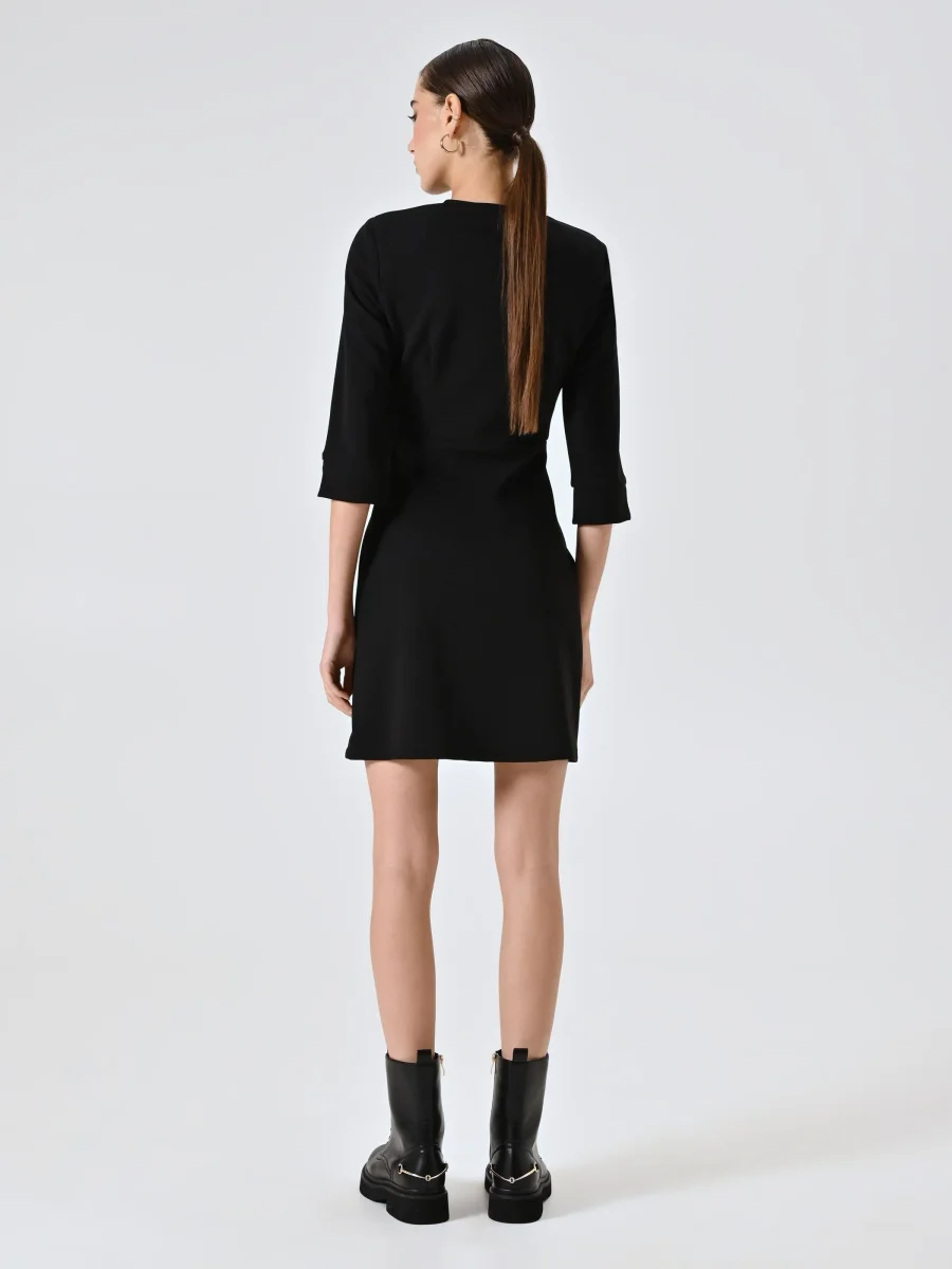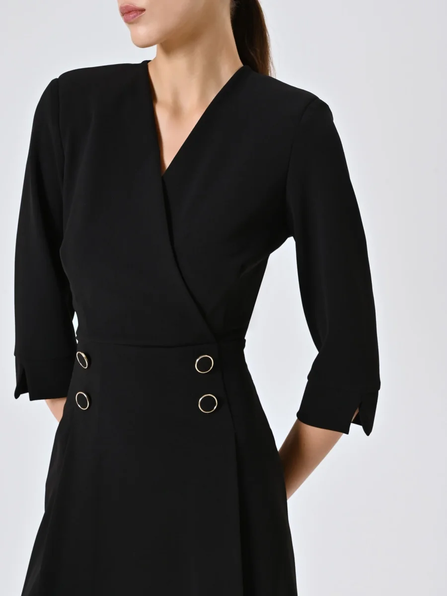 Realizzato in scuba mano crepe, l’Abito effetto Doppiopetto è caratterizzato da uno scollo incrociato, doppia fila di bottoni decorativi sul davanti e maniche 3/4 con spacchetto che donano movimento e stile. La chiusura con zip laterale assicura una vestibilità confortevole e lineare.