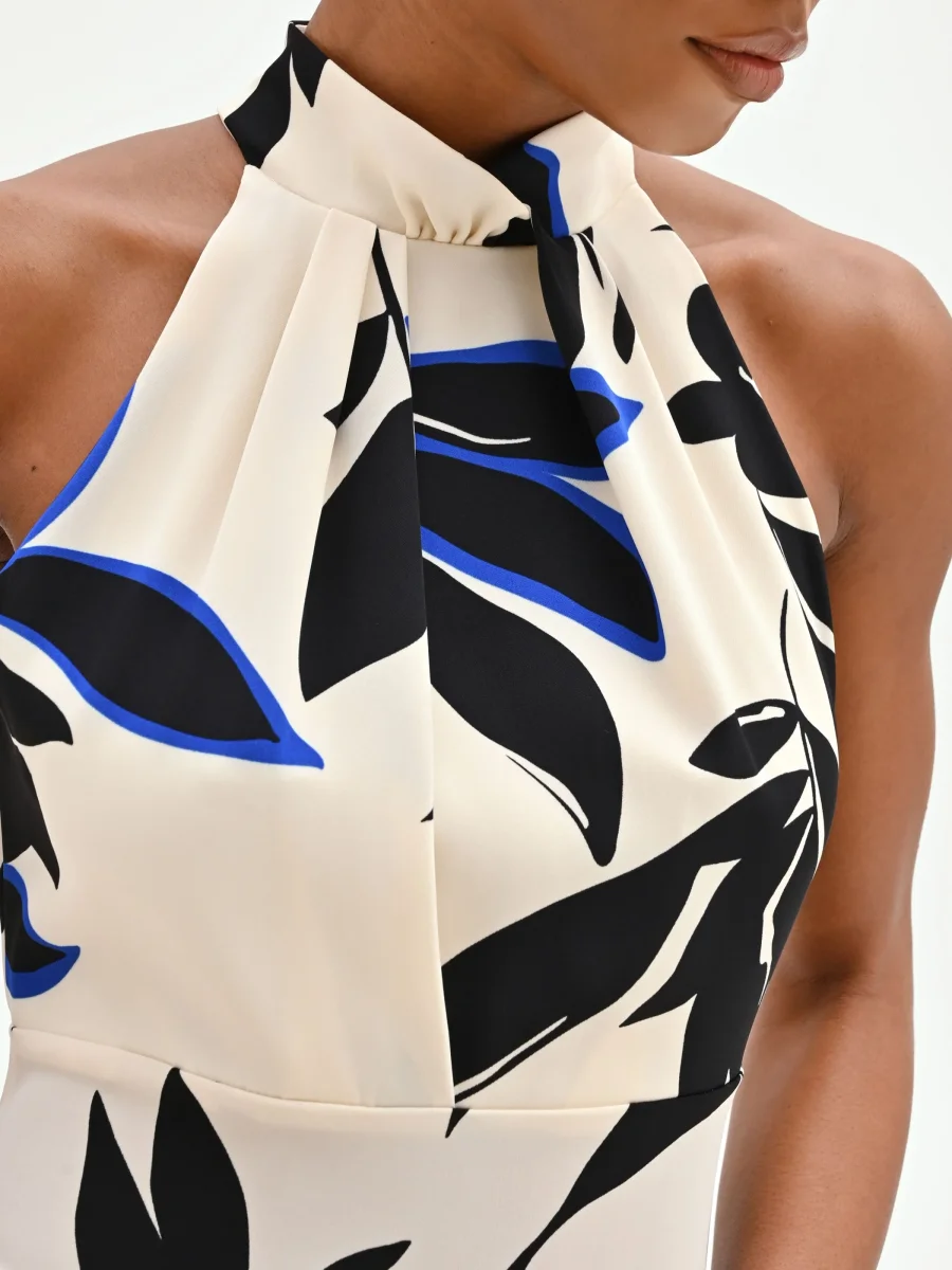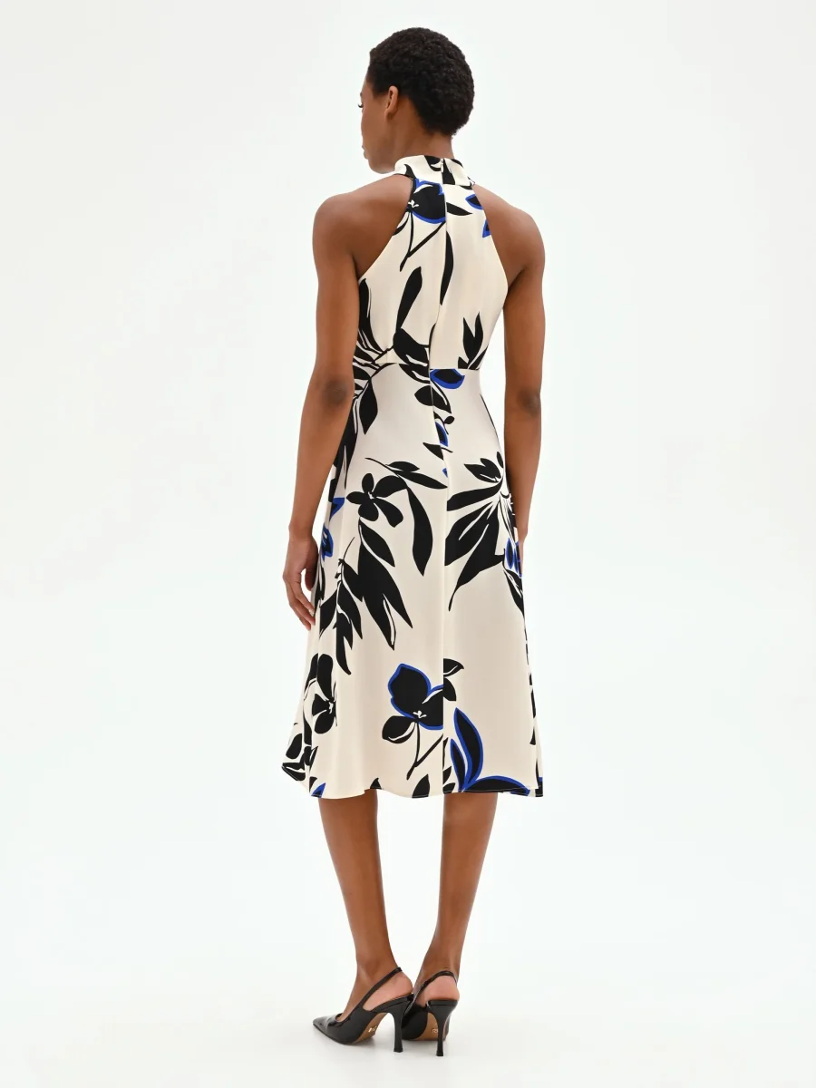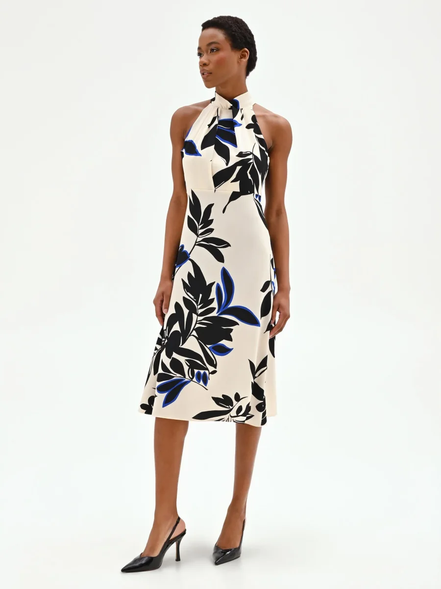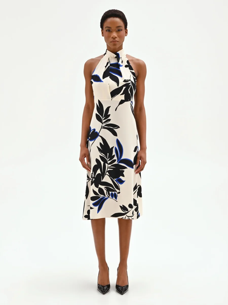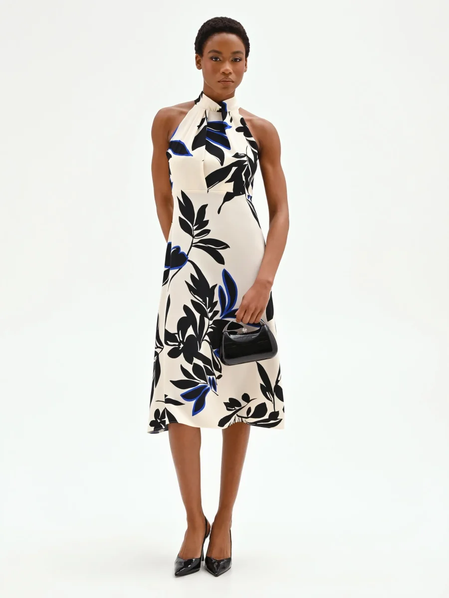 Un’interpretazione grafica del mondo botanico anima questo abito fluido blu cina, un capo pensato per chi ama distinguersi con uno stile ricercato e contemporaneo. La sua silhouette scivolata è esaltata dallo scollo all’americana, arricchito da un morbido drappeggio centrale che valorizza il décolleté e lascia le spalle scoperte con raffinata femminilità. Realizzato in cady dalla mano liscia e piacevole al tatto, il vestito si muove con leggerezza ad ogni passo. Il design si distingue per l’intrigante stampa stilizzata all-over, dove i contorni neri dei motivi floreali incontrano vivaci tocchi di blu cina su una base color panna, creando un contrasto visivo di grande effetto. La linea fluida accompagna la figura senza costringerla, terminando in una lunghezza midi perfetta per diverse occasioni d’uso. Una discreta chiusura con zip posteriore completa il capo in modo funzionale. Ideale per cerimonie diurne, cocktail o eventi speciali della bella stagione, questo abito si abbina perfettamente a capispalla e accessori nelle sfumature del blu cina per creare un total look armonioso.