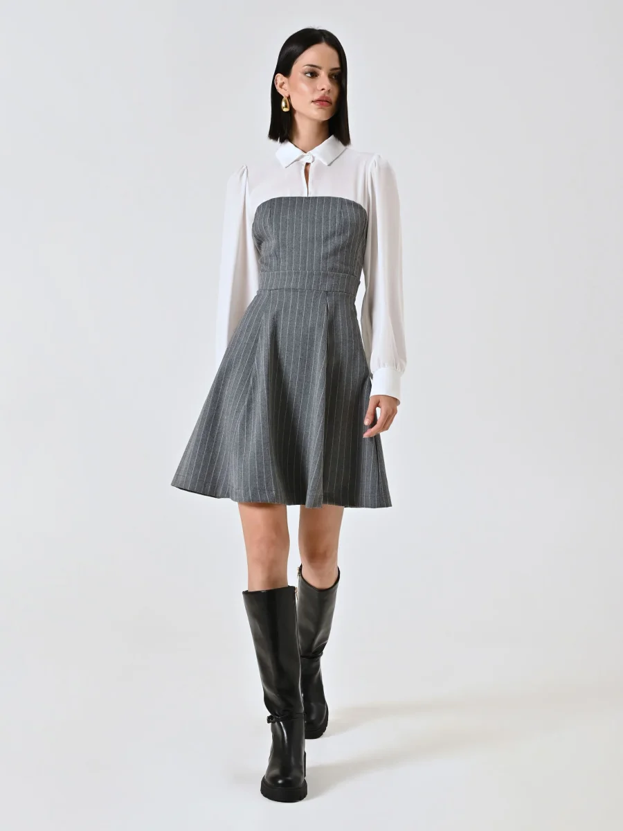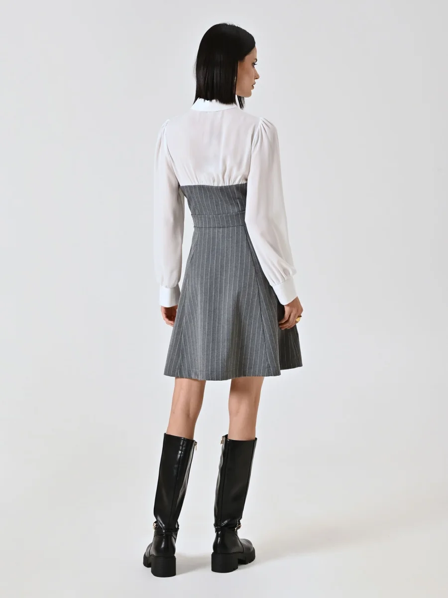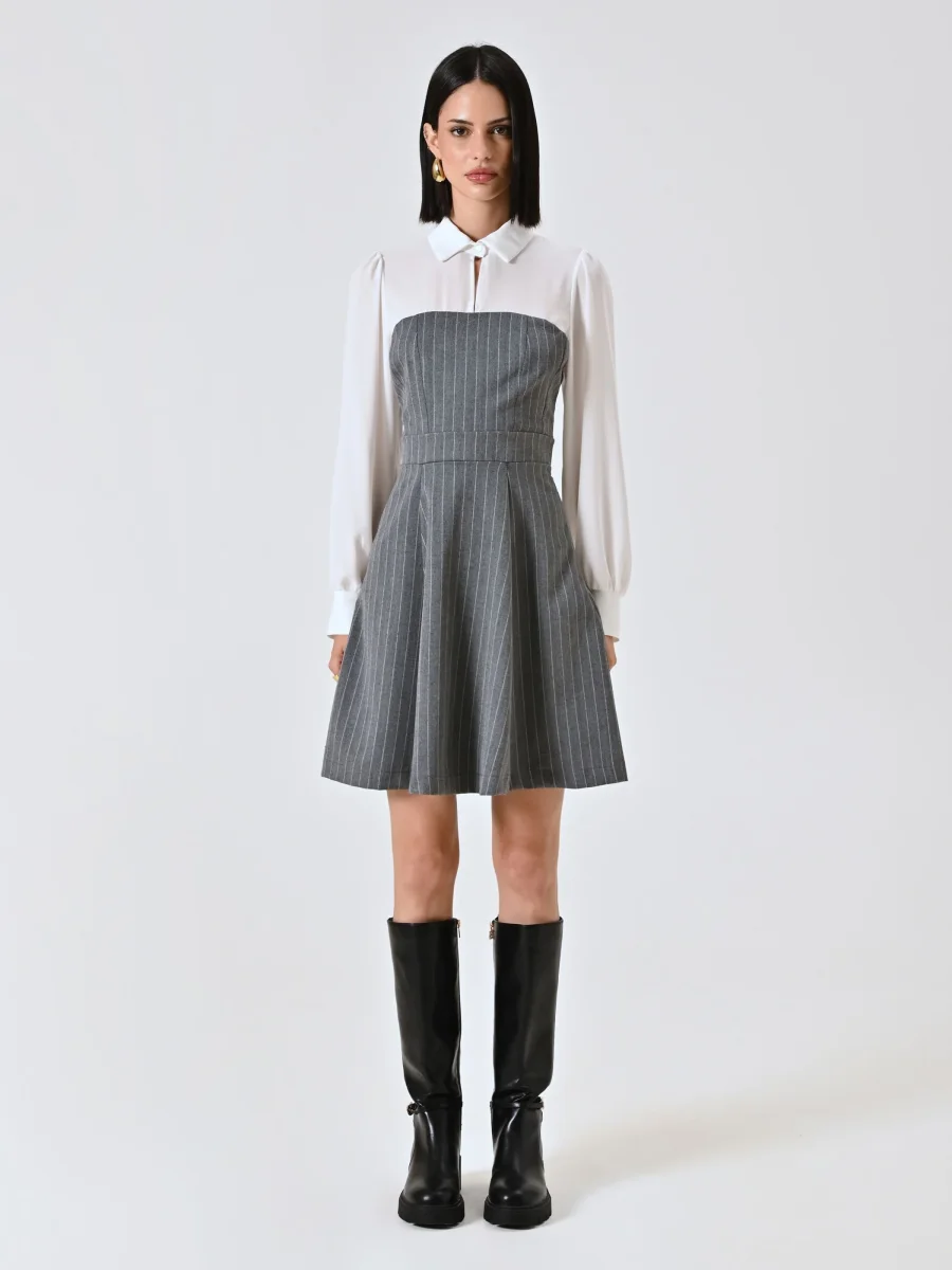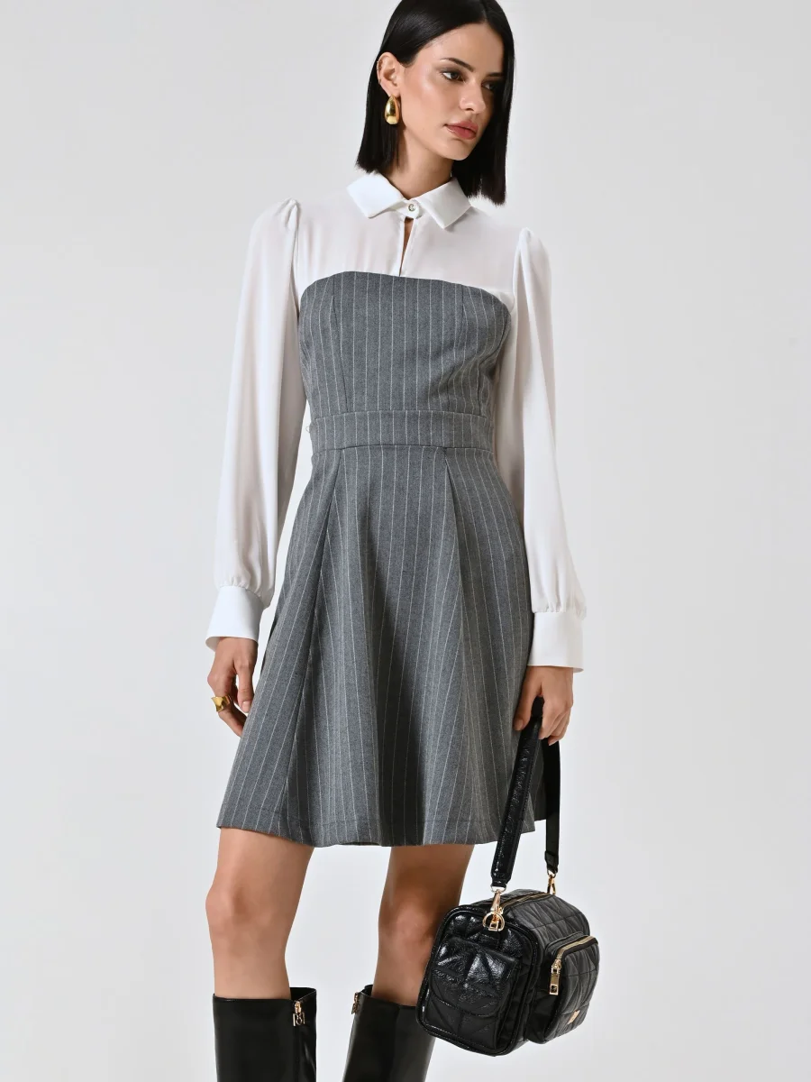 L’Abito Gessato con Blusa in Georgette è composto da un elegante abito effetto bustier in tessuto gessato, abbinato a una blusa in georgette con colletto e polsini, che dona un contrasto femminile e raffinato. La chiusura con zip laterale garantisce una linea pulita e una vestibilità confortevole.