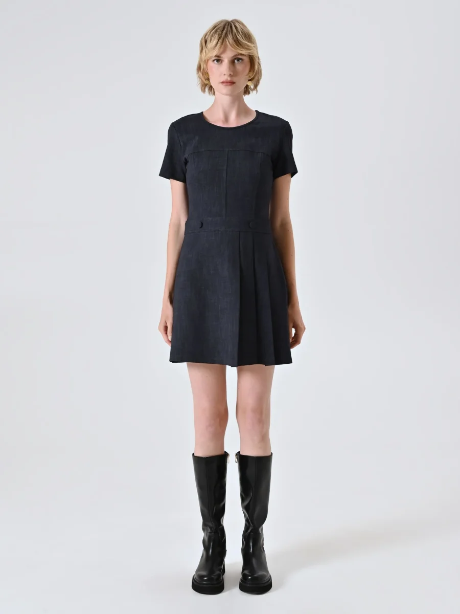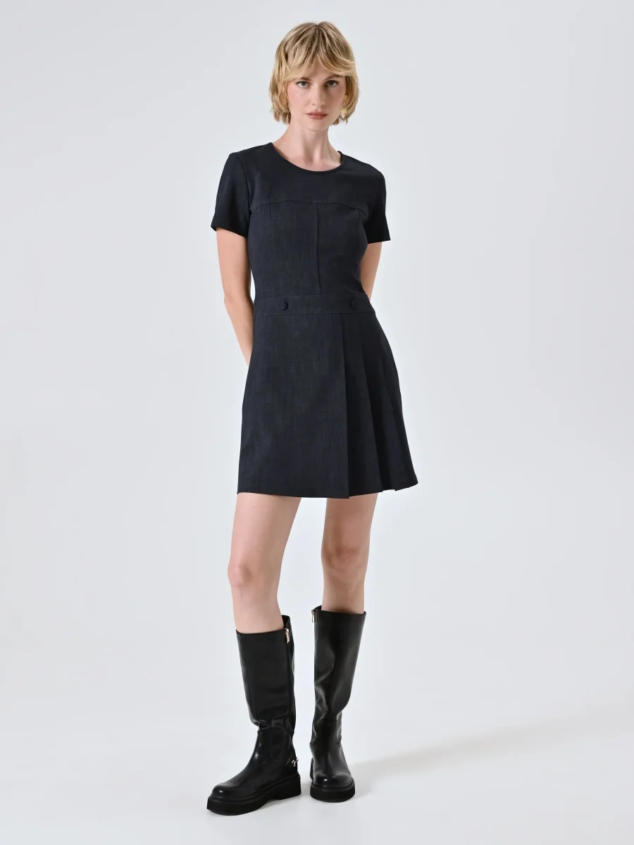 Look casual-chic con un tocco contemporaneo: l’abito corto in punto Milano effetto denim è la scelta ideale per i tuoi outfit quotidiani