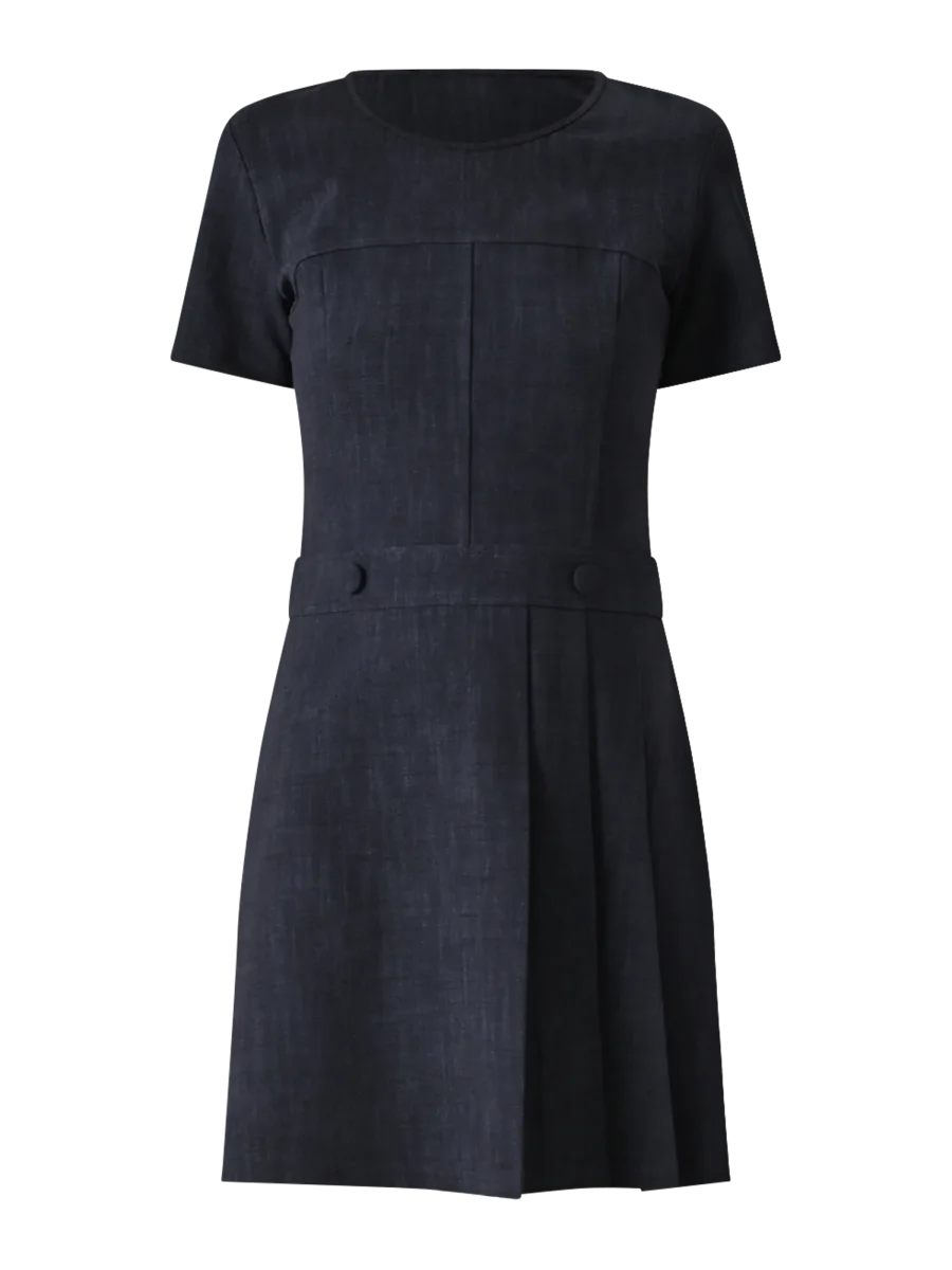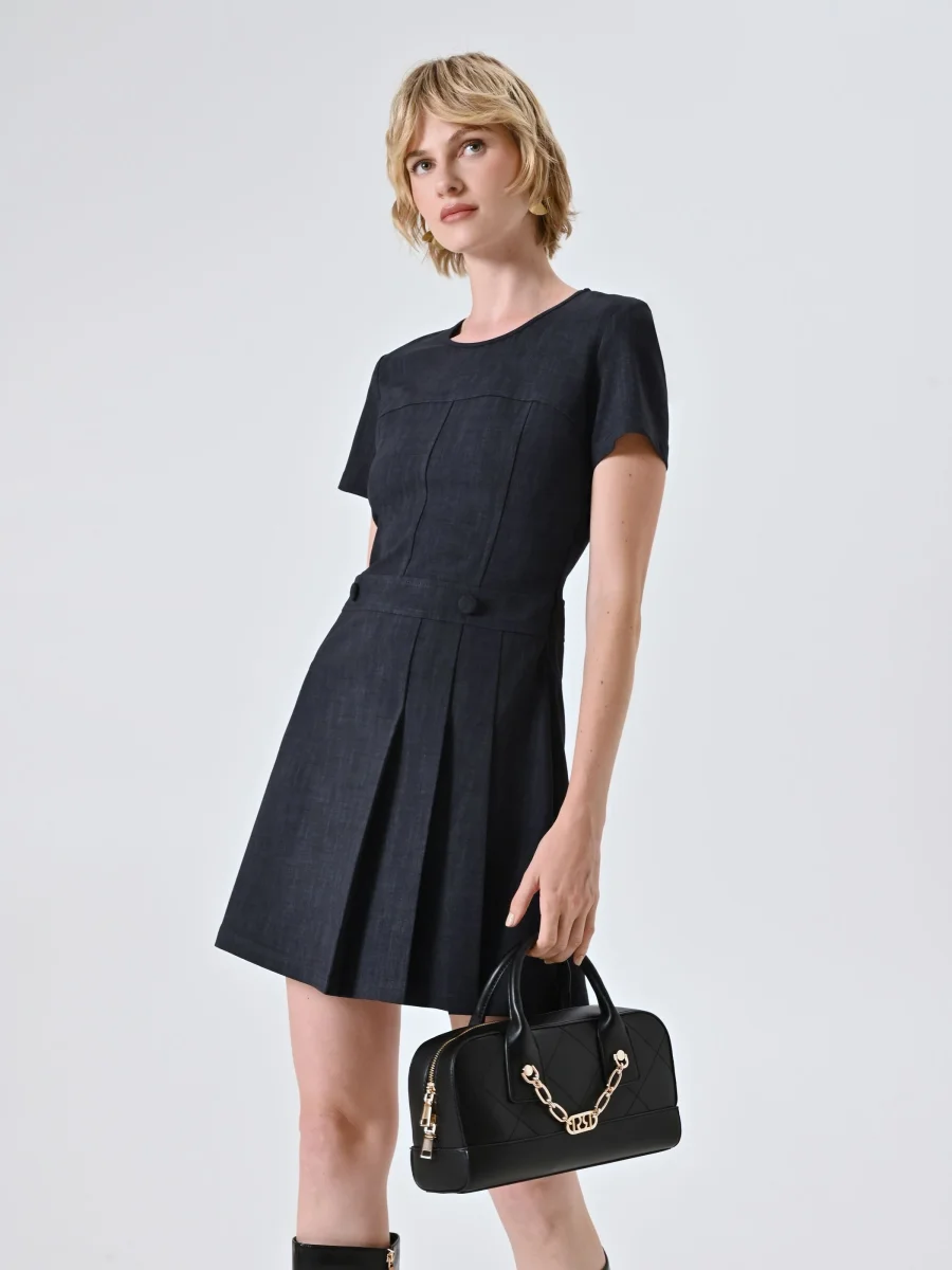 Realizzato in un tessuto fiammato stretch, è valorizzato da una linea svasata con piega sul davanti, maniche corte e bottoni decorativi in vita; la chiusura è con zip invisibile sul fianco