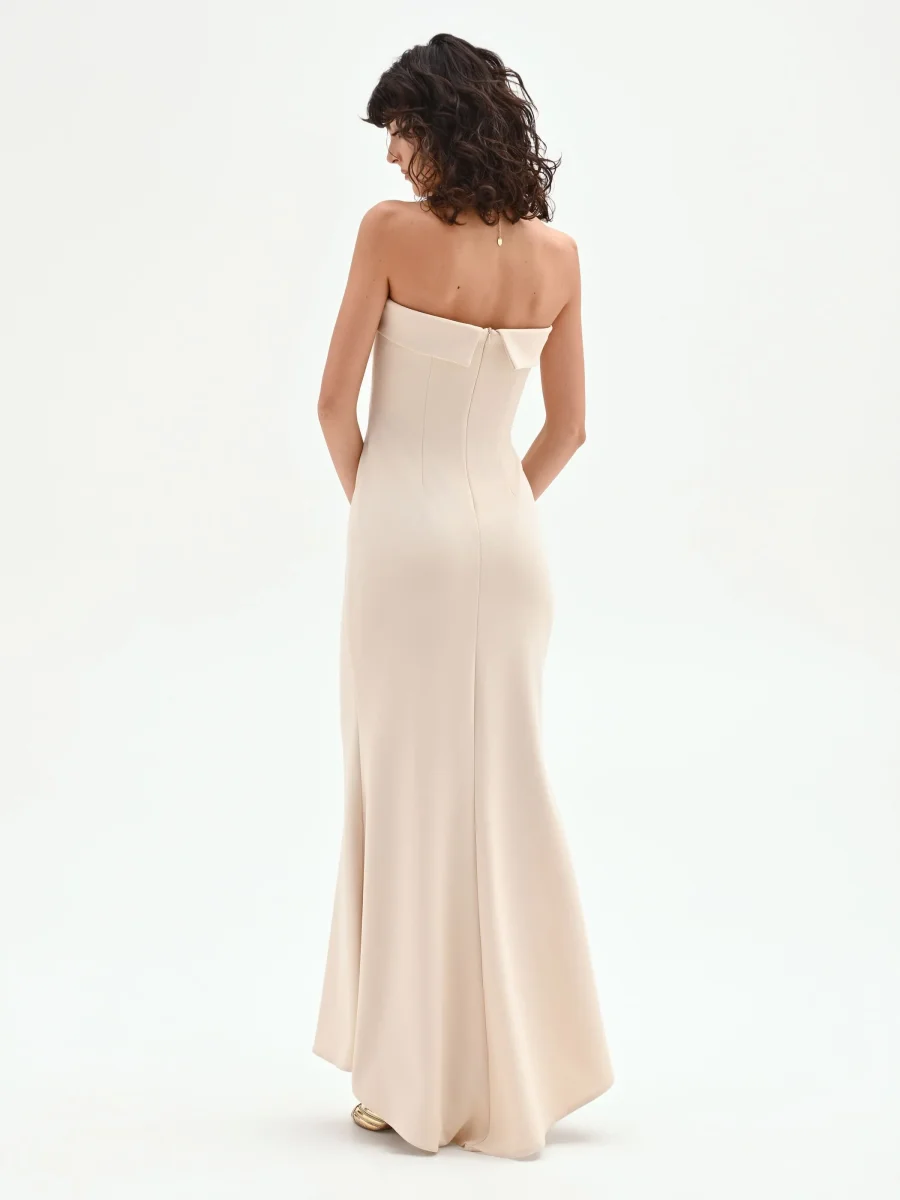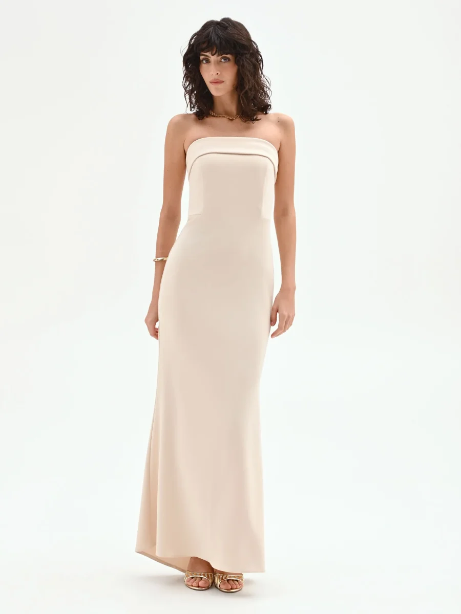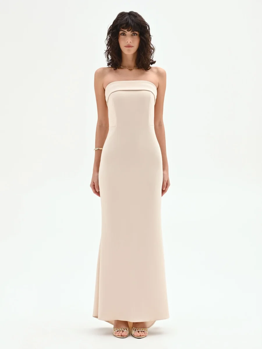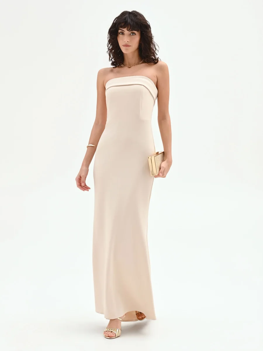 Soyez le premier à laisser votre avis sur “Abito lungo a colonna beige chiaro senza spalline”