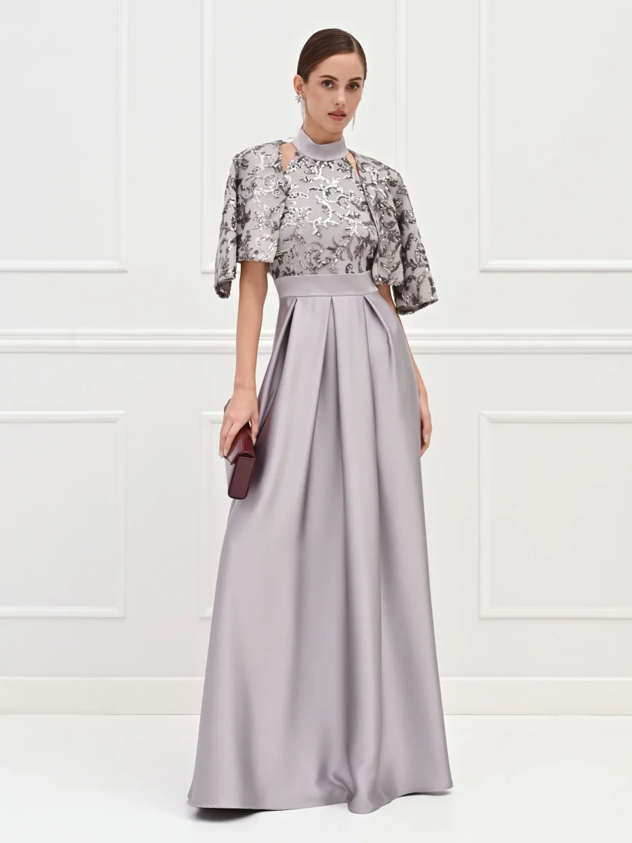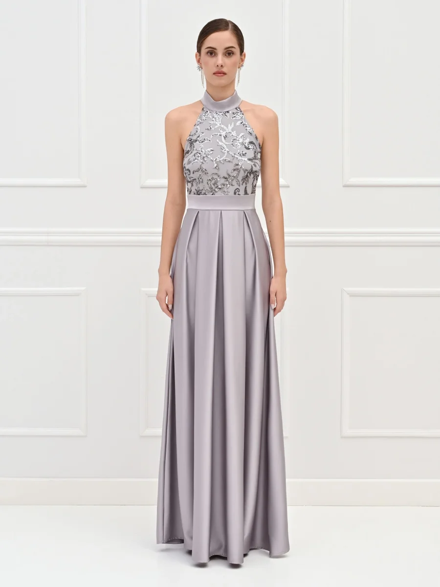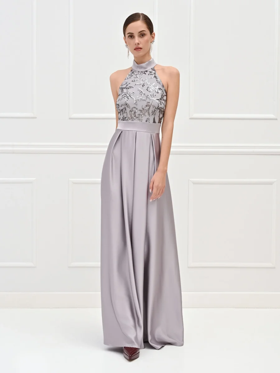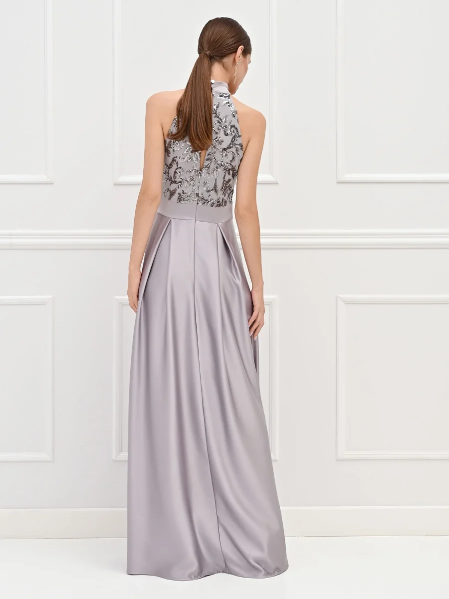 Un gioco di luce e texture preziose disegna la silhouette di questo abito lungo argento, un capo da sogno pensato per gli eventi più esclusivi. La sua eleganza nasce dal contrasto tra la fluidità del raso e lo scintillio delle paillettes.