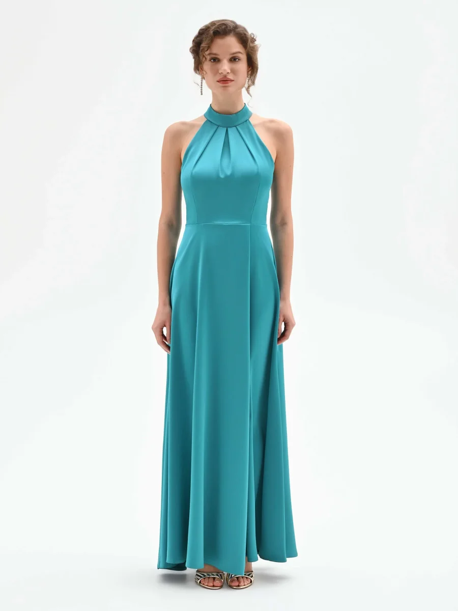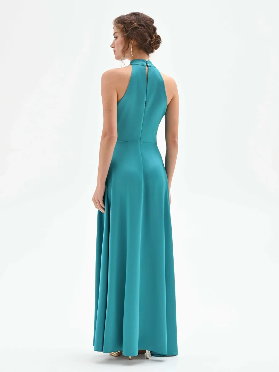 Realizzato in raso fluido che scivola sulla figura, il design si sviluppa a partire dal sofisticato scollo all’americana che lascia le spalle scoperte. Il colletto alto, che si chiude dietro la nuca con un piccolo bottoncino, dà origine a un morbido drappeggio che valorizza il décolleté con un movimento naturale. La vita è sapientemente sottolineata, introducendo la gonna lunga e svasata che fluttua leggera a ogni passo. La chiusura con zip posteriore invisibile assicura una vestibilità impeccabile, mantenendo pulita la linea del capo.
