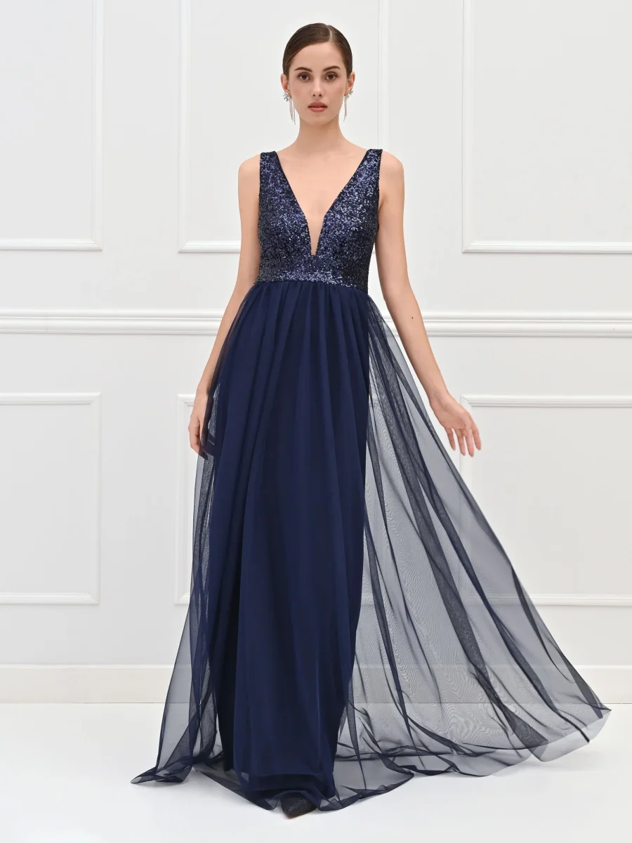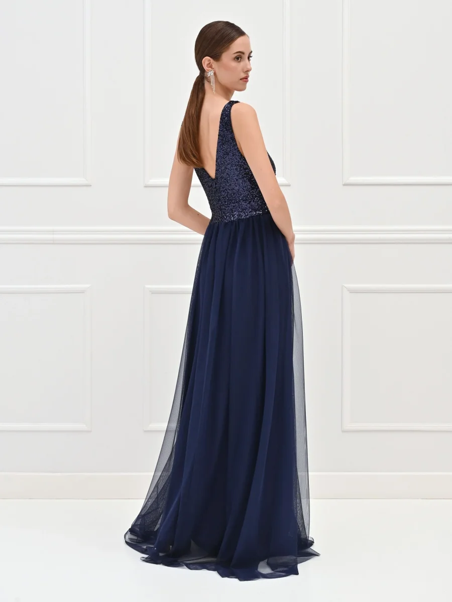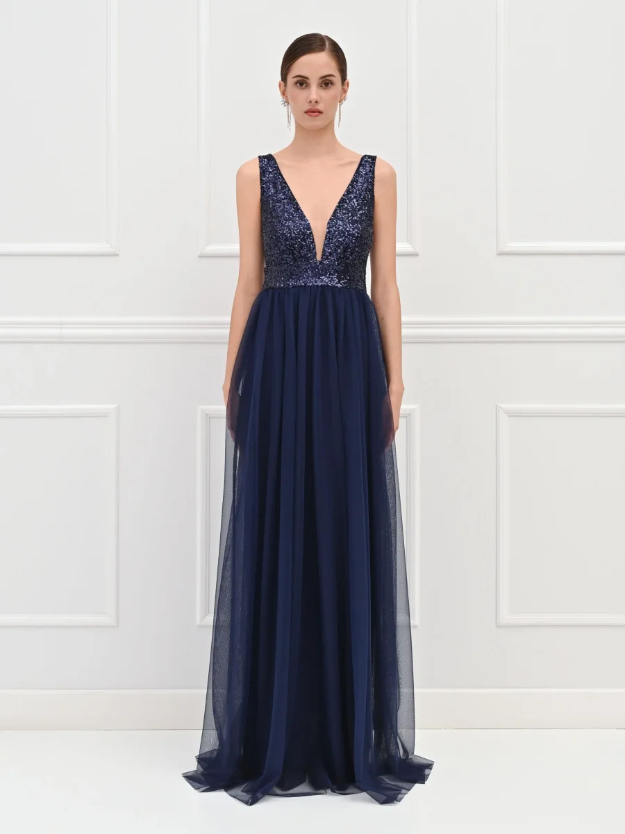 Questo abito lungo blu cattura lo sguardo e incanta con la sua eleganza. È un capo che unisce la preziosità della luce alla leggerezza del movimento, pensato per le serate di gala e gli eventi speciali. Il corpetto senza maniche, con un sensuale scollo a V, è interamente ricamato con paillettes tono su tono, creando un effetto scintillante che illumina la figura. Il punto vita segnato introduce la gonna ampia e fluida, realizzata in tulle leggero che scivola fino a terra con grazia. La chiusura con zip posteriore assicura una vestibilità impeccabile e discreta.