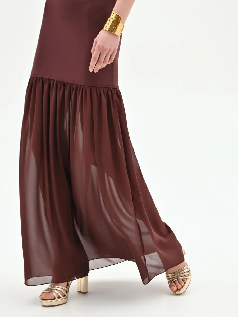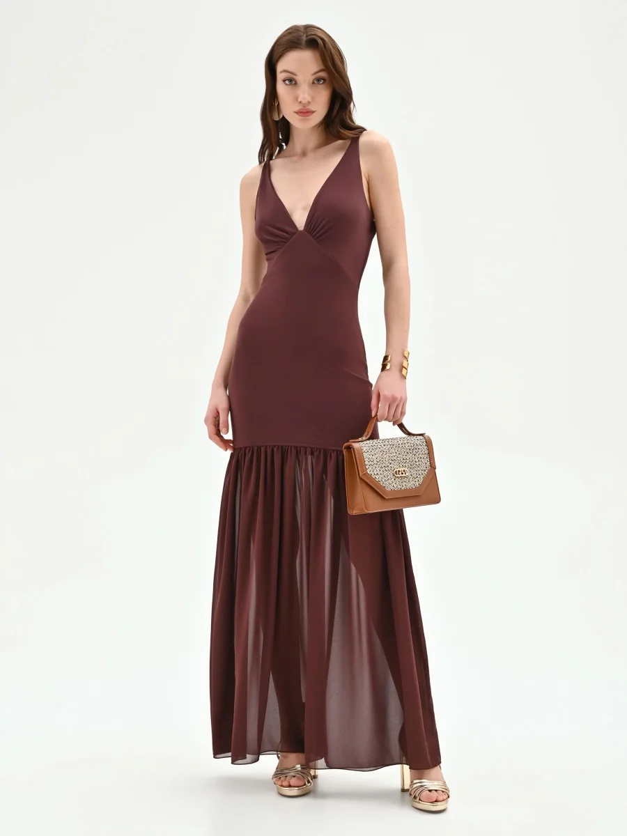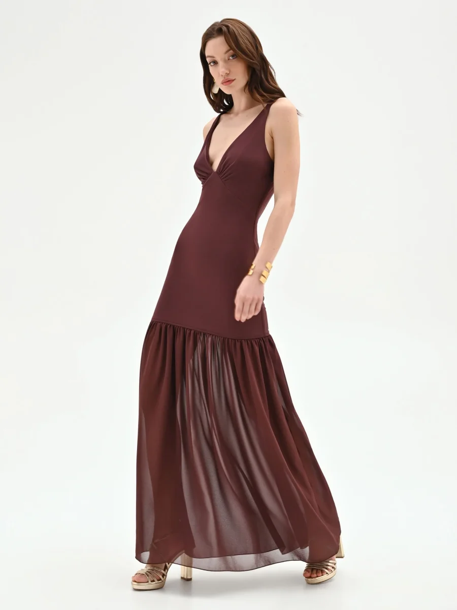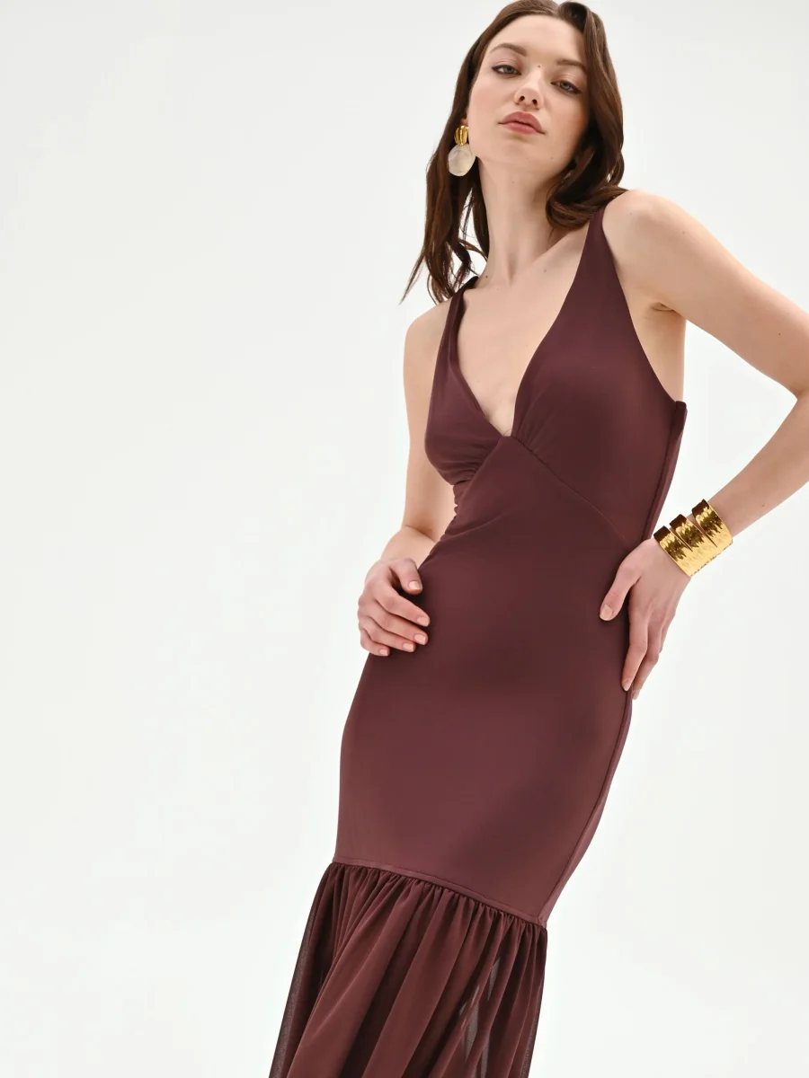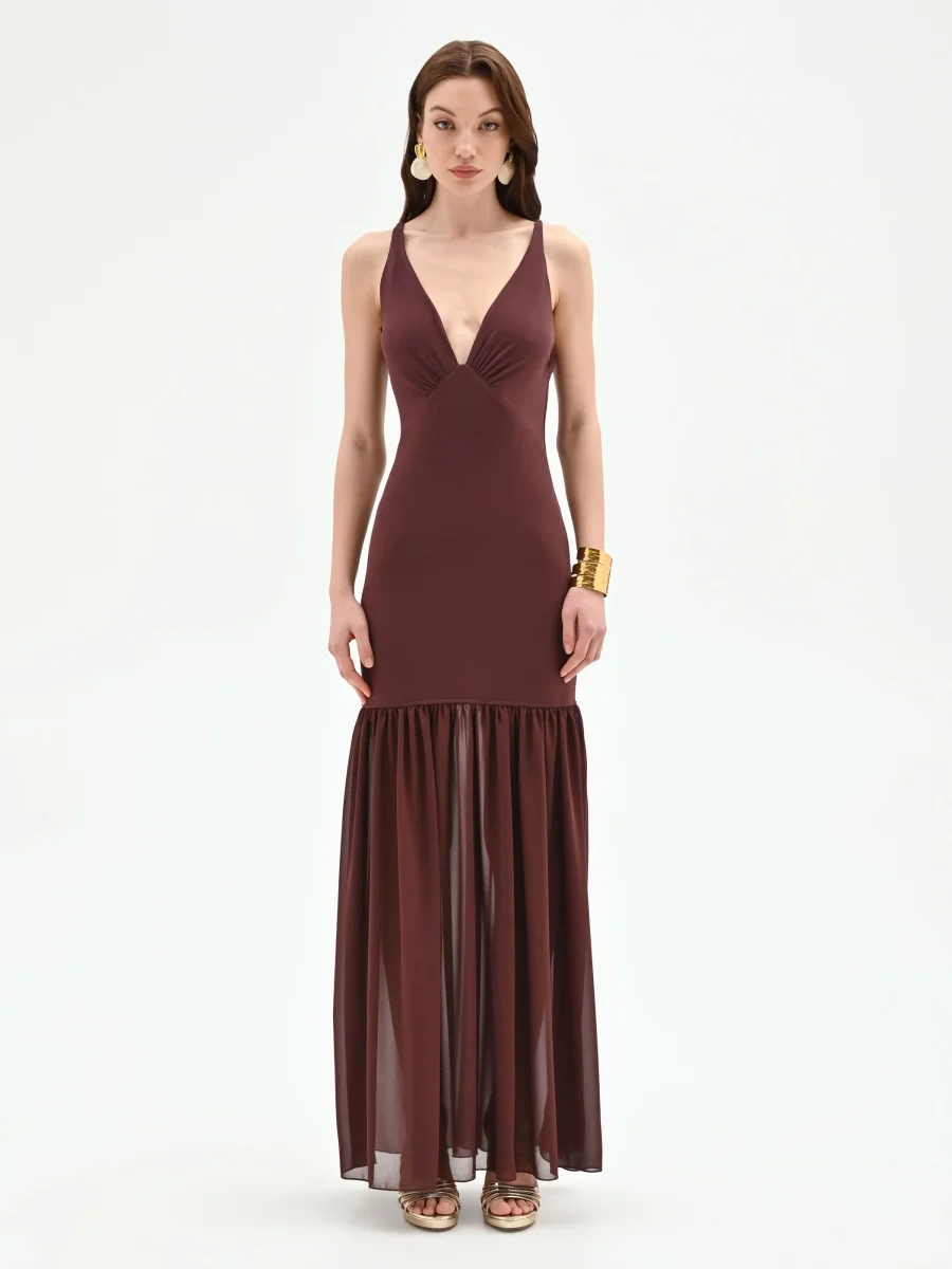 Una silhouette sinuosa che avvolge e definisce la figura, per un abito lungo color cioccolato pensato per le serate più memorabili.