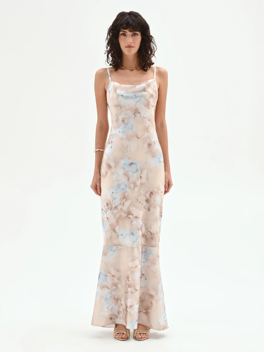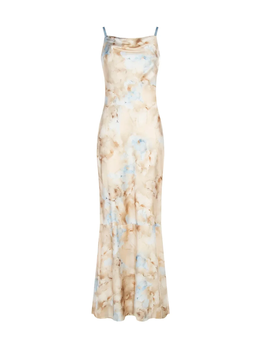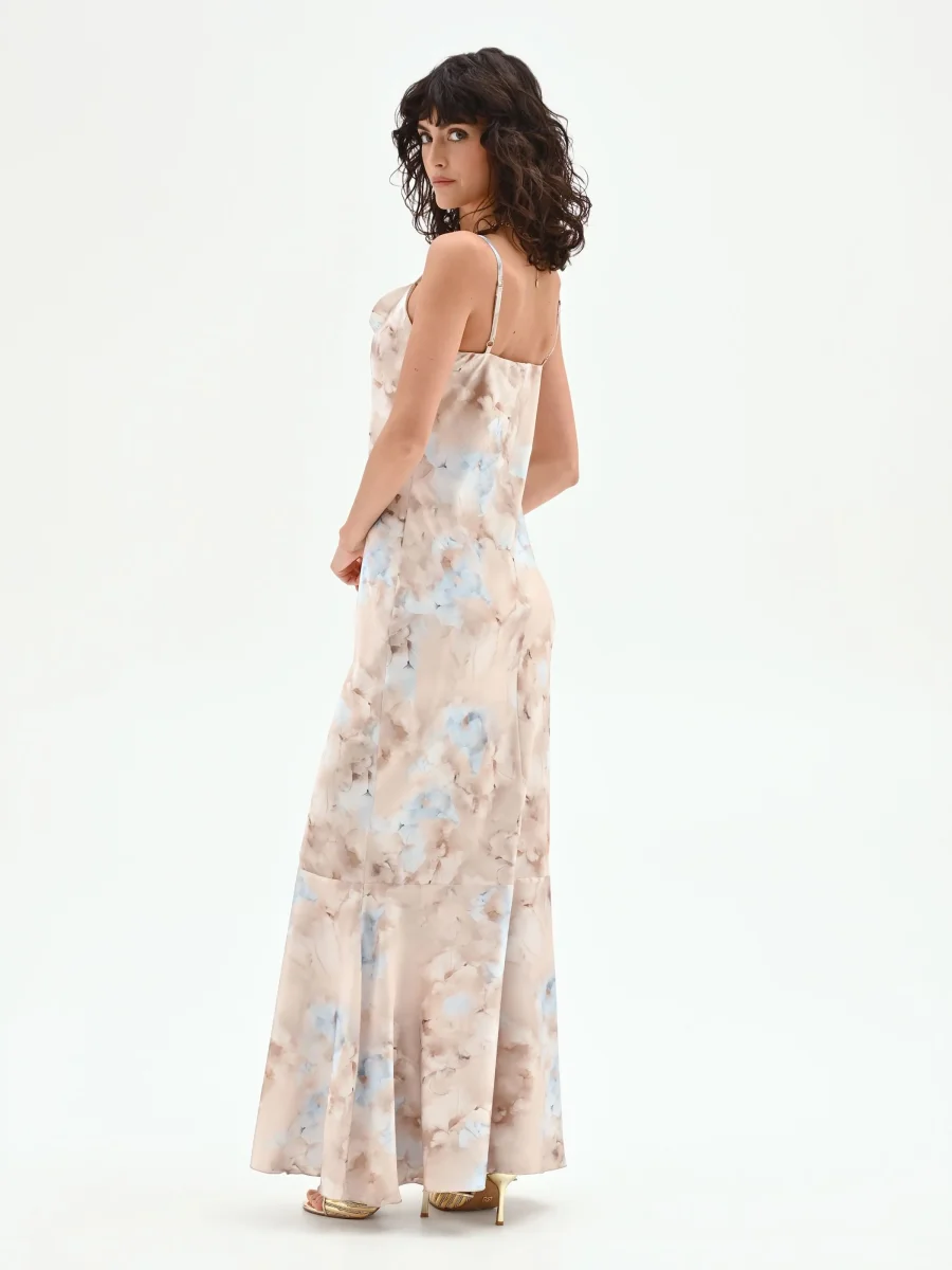 Una pennellata di colore eterea che disegna la silhouette: l’abito lungo modello sottoveste è una scelta di stile sofisticata, capace di unire fluidità e carattere. La sua linea scivolata è un invito alla femminilità più spontanea e contemporanea, perfetta per chi ama un’eleganza non costruita. Realizzato in raso dalla finitura lucida, il capo accarezza la figura con delicatezza, seguendone i movimenti con grazia. Lo scollo ad anello crea un drappeggio morbido e sensuale sul décolleté, sorretto da spalline sottili che lasciano le spalle scoperte. La stampa all-over, che evoca un acquerello astratto nei toni del cielo, del beige e del marrone, rende ogni abito un pezzo unico e distintivo. Il design pulito è definito da una vestibilità confortevole e da un fondo che si apre leggermente, conferendo ulteriore leggerezza all’insieme. Indossalo per un evento serale o una cerimonia informale, abbinandolo a sandali con tacco. Per un look più ricercato e di tendenza, provalo con un blazer over appoggiato sulle spalle, creando un affascinante gioco di contrasti.