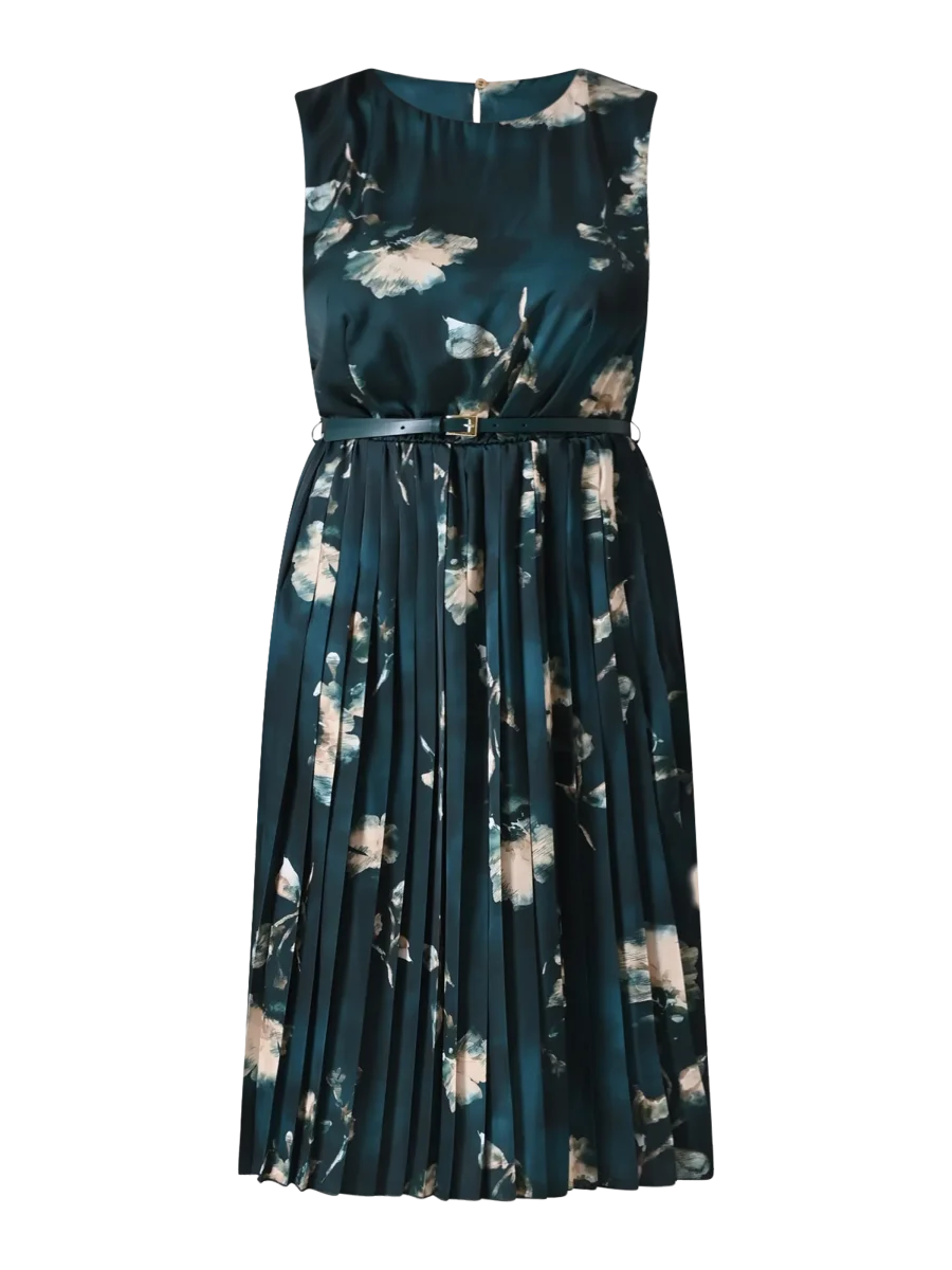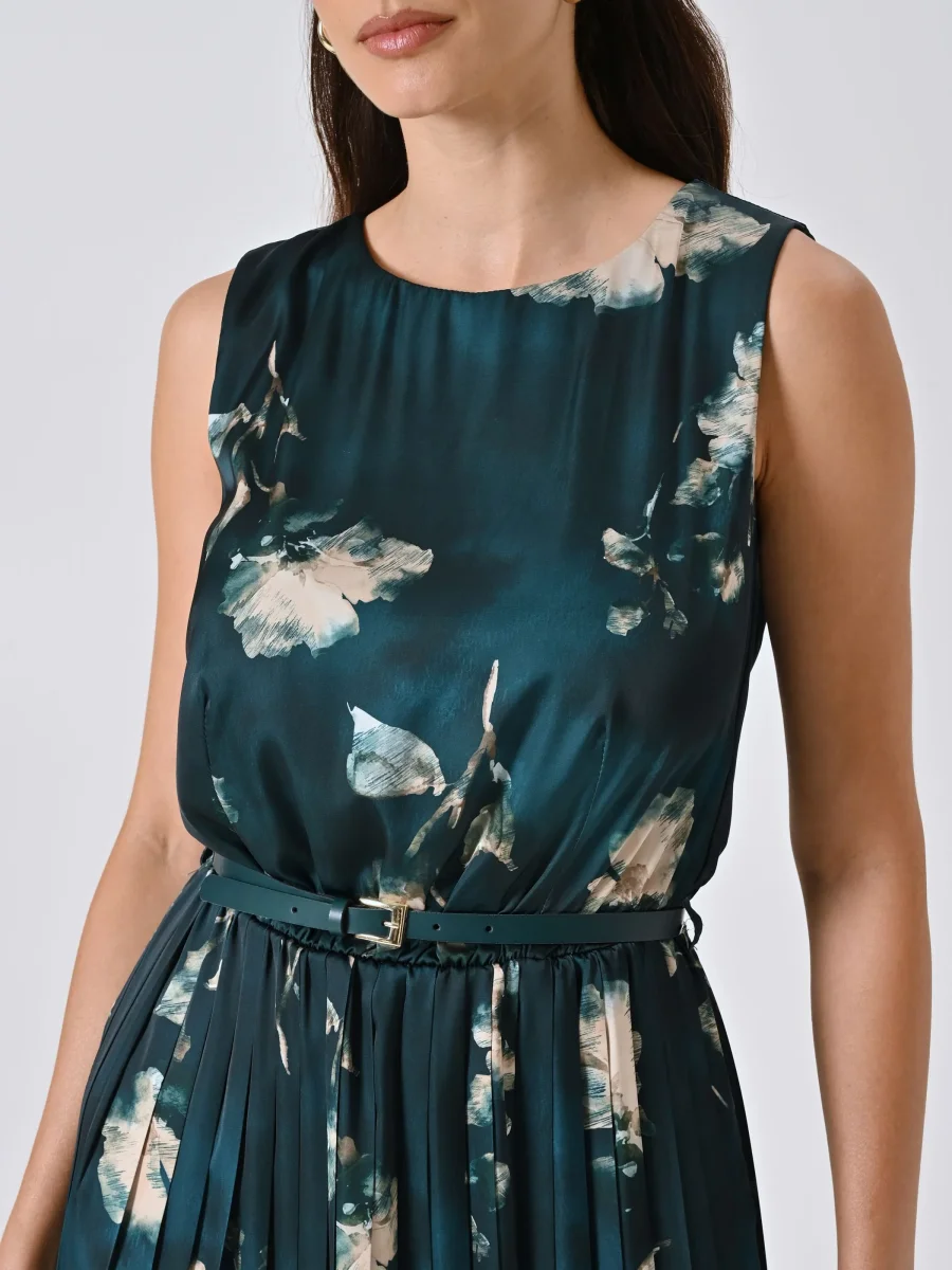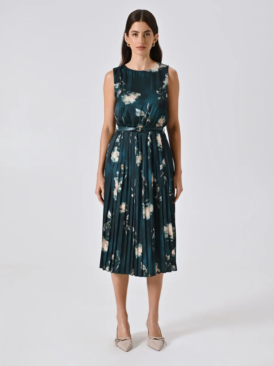 L’Abito Plissé Verde stampa Floreale è realizzato in raso fluido con una raffinata stampa floreale, ed è caratterizzato da un design smanicato, una gonna plissé che accompagna i movimenti e una cinturina in vita removibile con passanti, per definire la silhouette. Il bottoncino sul retro ne completa la chiusura con discrezione.