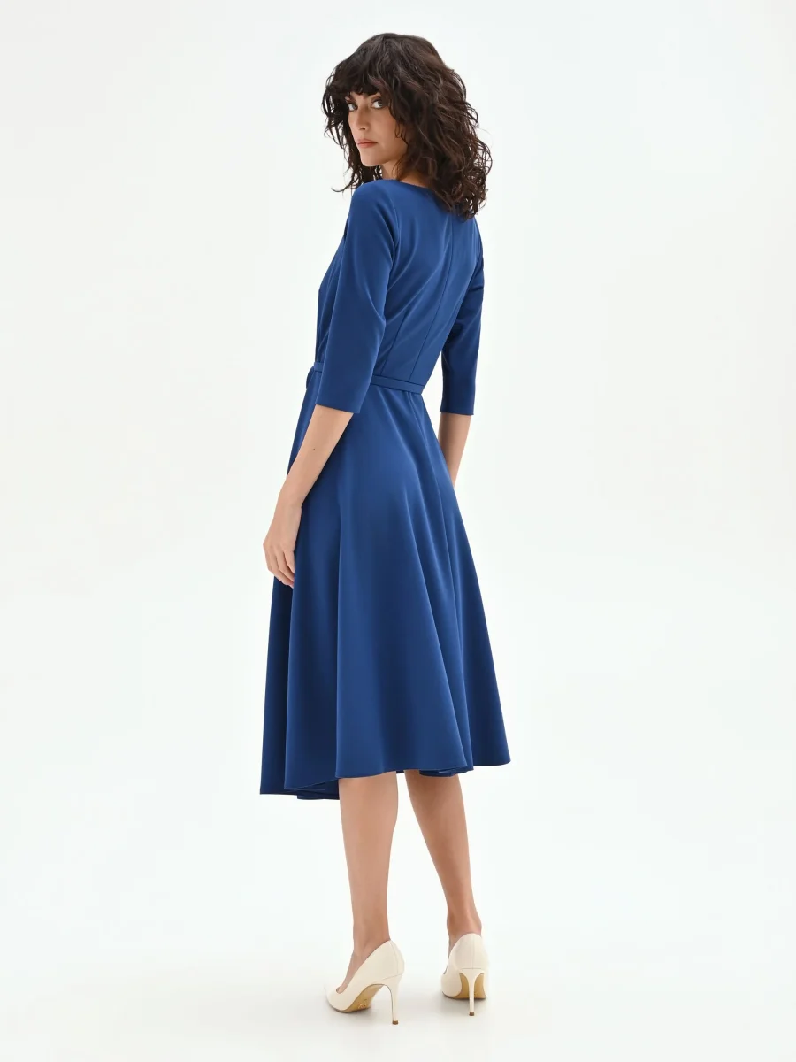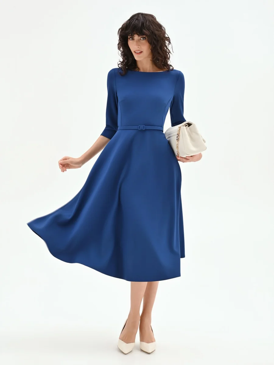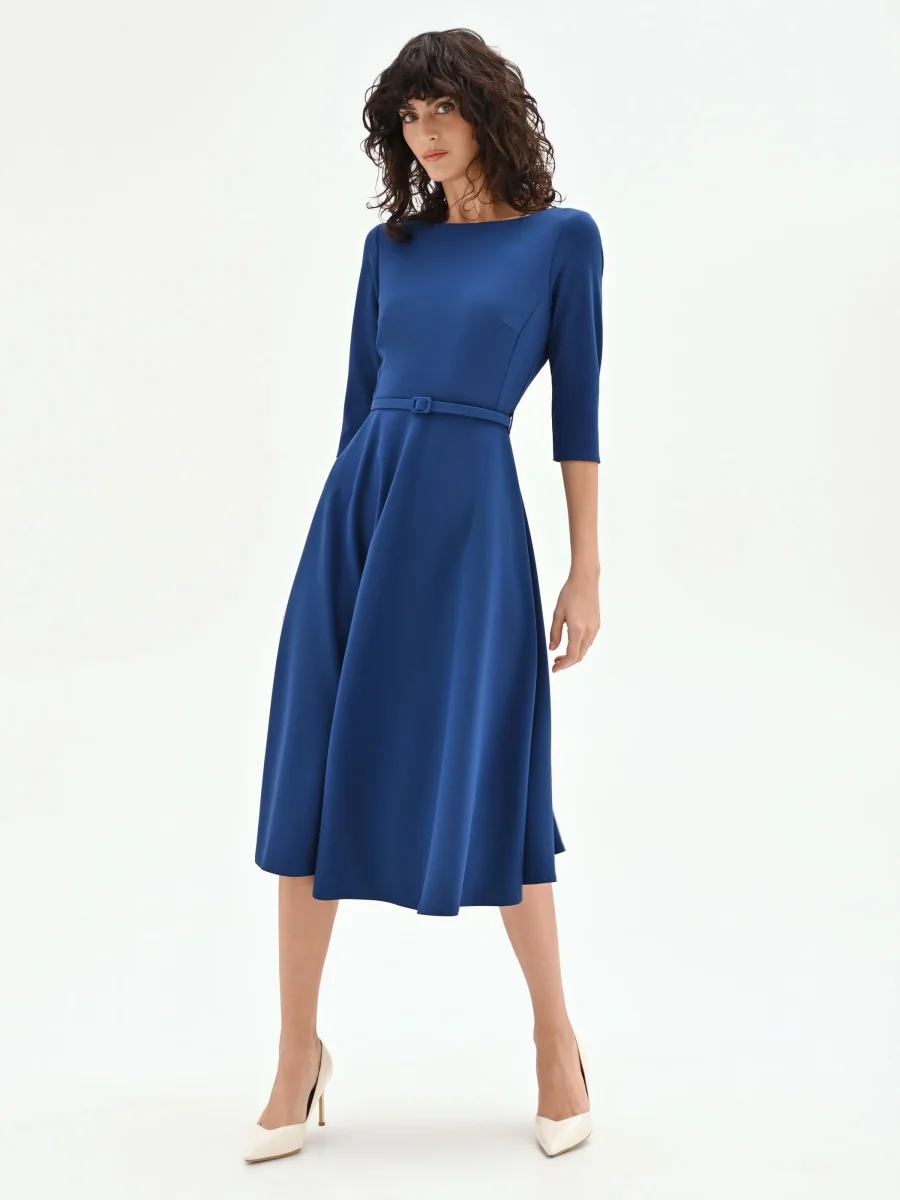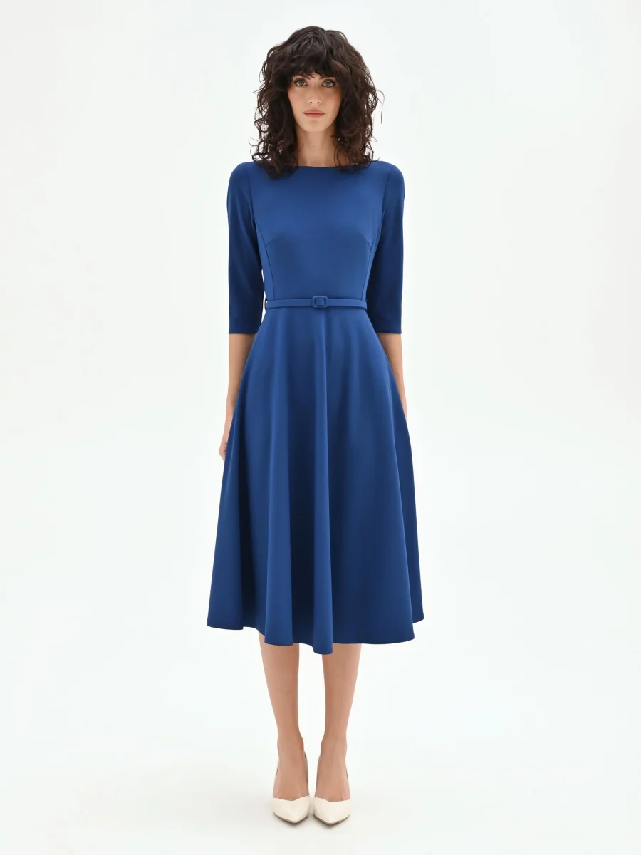 Realizzato in scuba crèpe, un tessuto che asseconda le forme con una vestibilità confortevole e definita, il modello presenta una linea svasata che si apre in un’ampia gonna fluida, il cui movimento è animato da pieghe morbide che arrivano fin sotto il ginocchio. Il corpetto è disegnato con precisione da uno scollo a barchetta e maniche a tre quarti, dettagli puliti che bilanciano l’ampiezza della parte inferiore. Il punto vita è il vero focus del design, messo in risalto da una sottile cintura tono su tono con fibbia rivestita, che aggiunge un tocco ricercato. La chiusura posteriore garantisce una vestibilità perfetta e una linea continua.