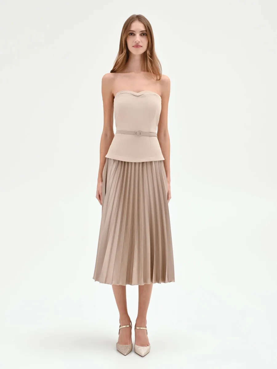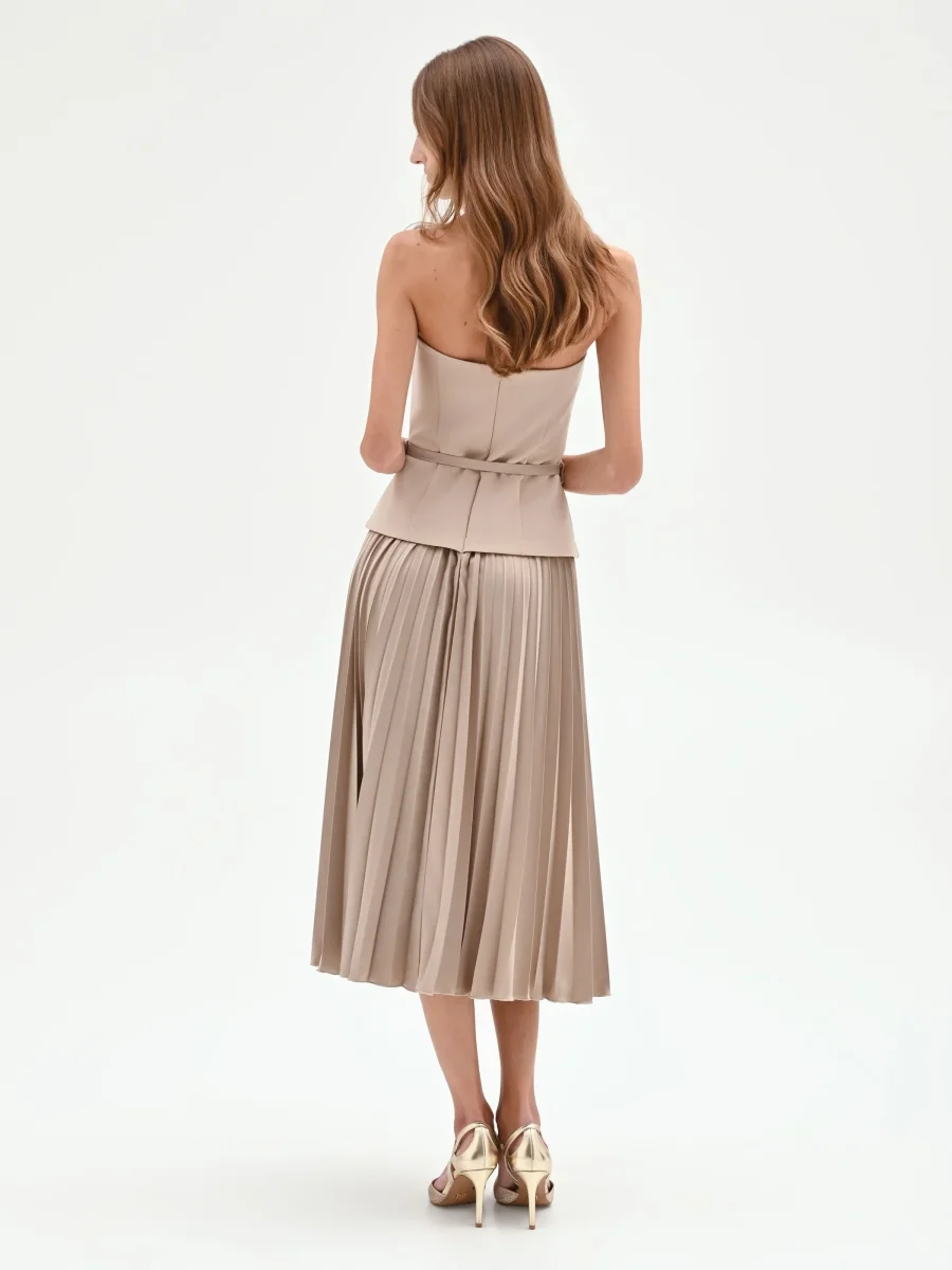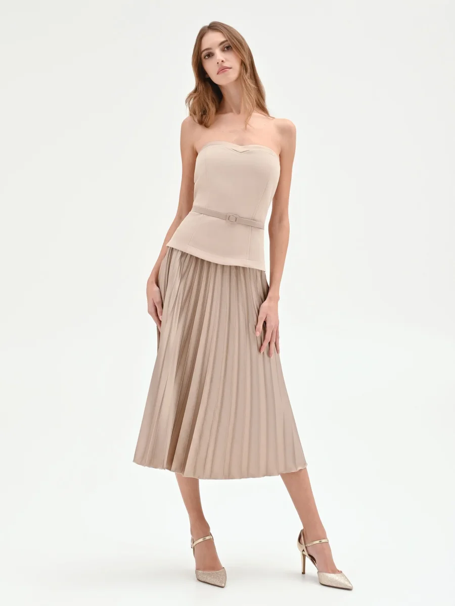 Il top senza spalline disegna la silhouette con un femminile scollo a cuore, definito da un piccolo intaglio a V e da una baschina svasata che crea un delicato movimento. La cintura abbinata con fibbia rettangolare sottolinea elegantemente il punto vita. Fluidità e raffinatezza caratterizzano la gonna midi, mossa da una fitta plissettatura verticale che bilancia la struttura del bustier. La pratica chiusura con zip assicura una vestibilità ottimale.