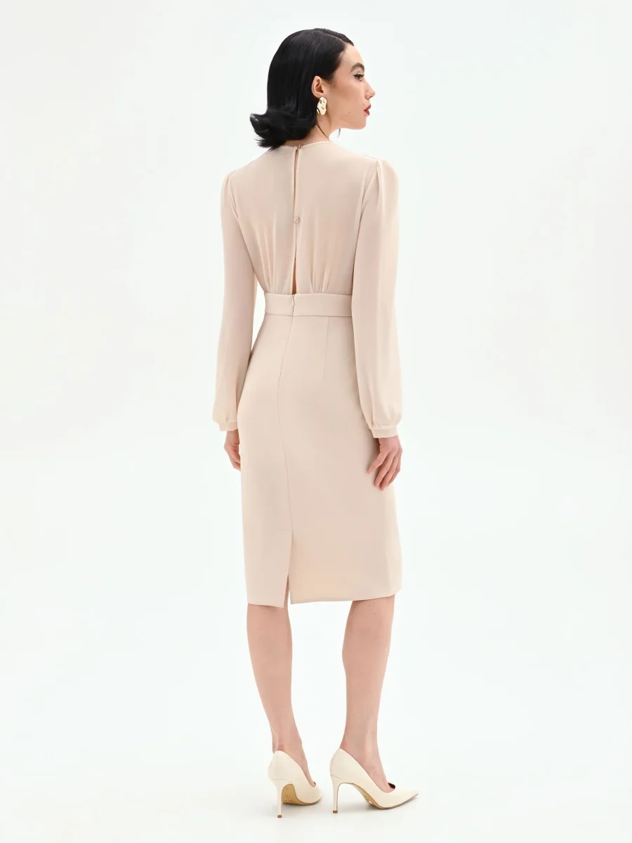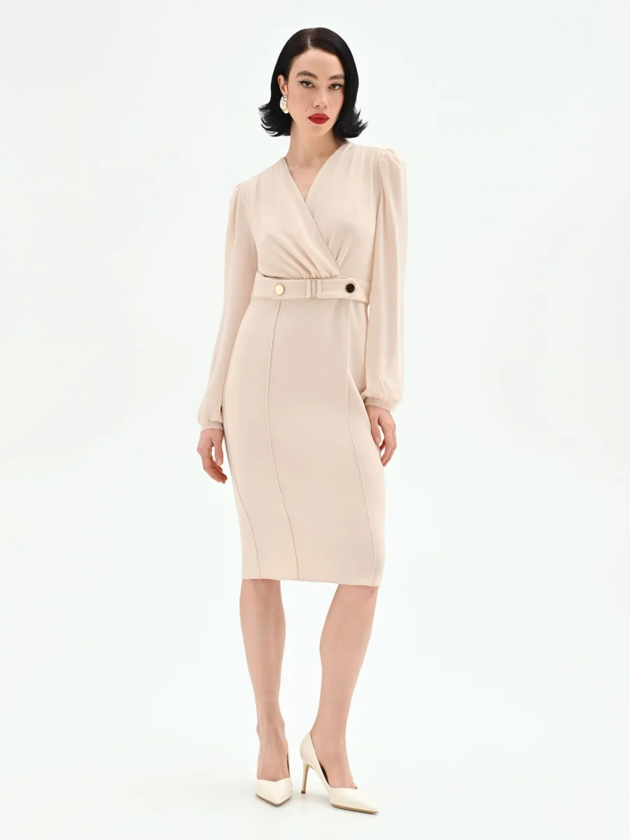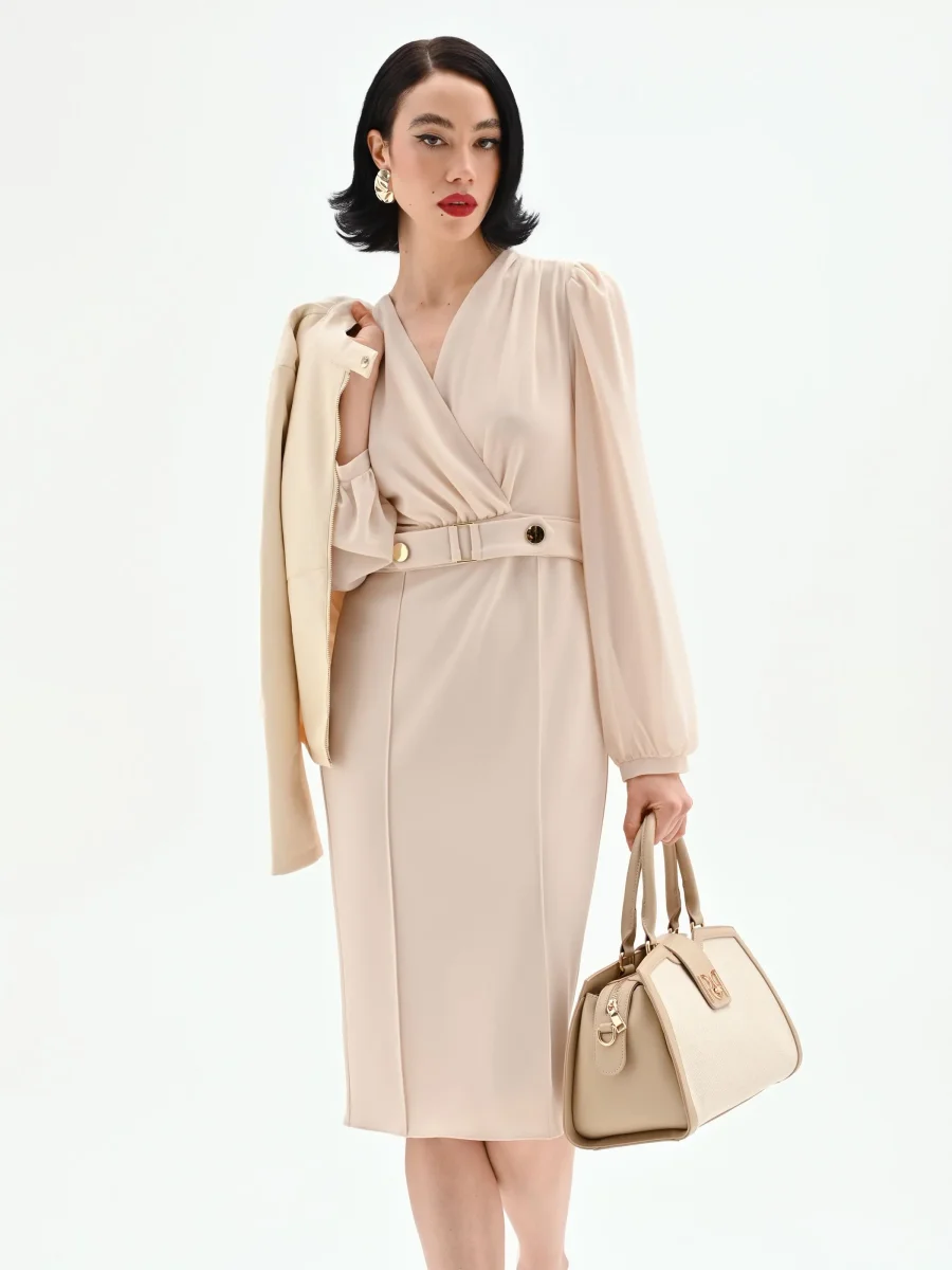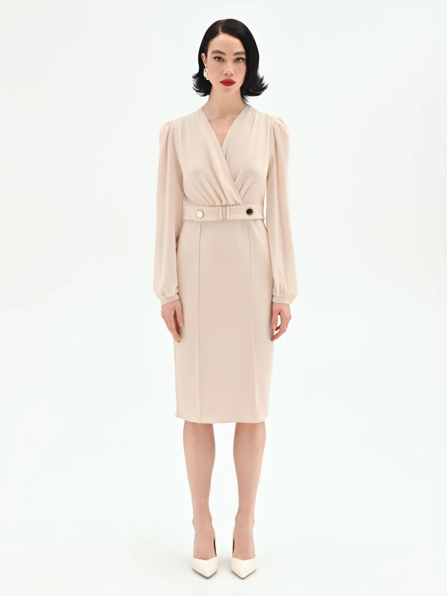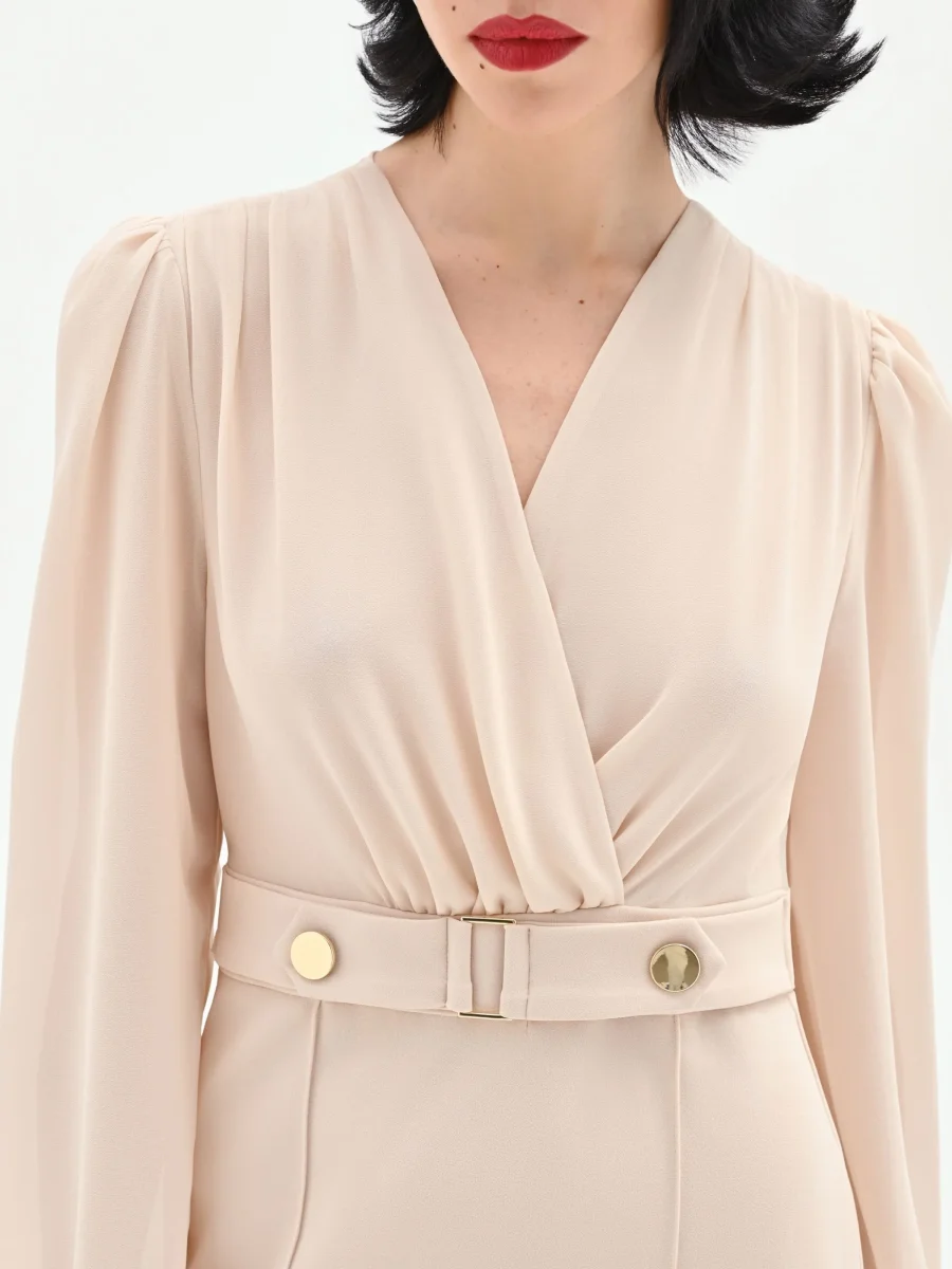 Un equilibrio di volumi e linee pulite definisce l’abito tubino beige chiaro, un capo versatile che unisce comfort e femminilità con un tocco contemporaneo. Realizzato in scuba crèpe, un tessuto che segue la figura con eleganza, presenta un corpetto morbido con scollo a V incrociato e maniche lunghe, caratterizzate da una leggera arricciatura sulle spalle e polsini elasticizzati che creano un volume discreto e attuale. Il punto vita è il fulcro del design, sottolineato da un’alta cintura nello stesso tessuto, impreziosita da una fibbia rettangolare e due bottoni in metallo dorato. La gonna longuette ha una linea dritta, definita da due cuciture verticali che slanciano la silhouette, mentre la chiusura posteriore con zip assicura una vestibilità perfetta. Ideale per l’ufficio o per occasioni formali come una laurea, questo abito si abbina a blazer e décolleté per un total look curato e sofisticato. Una scelta impeccabile per la donna che cerca un’eleganza funzionale e mai banale.