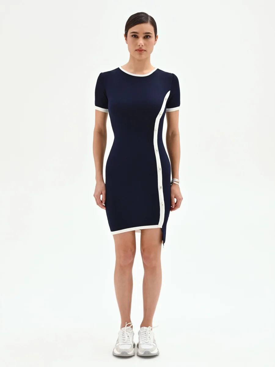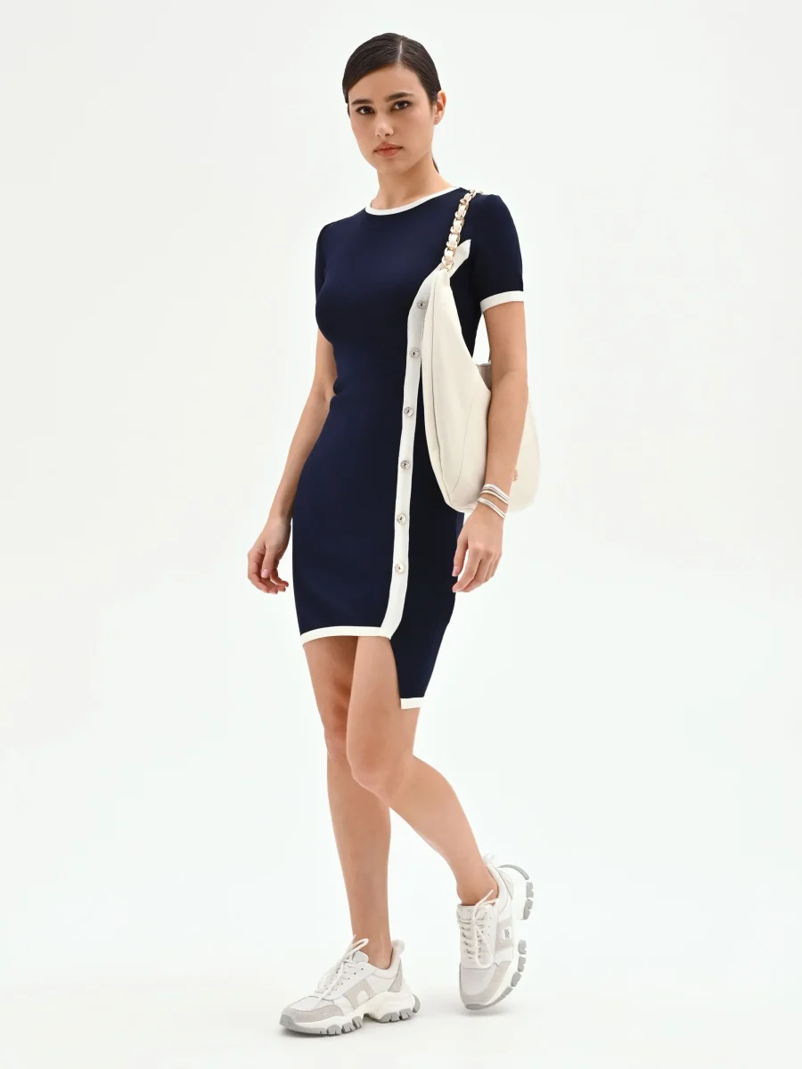 Un gioco di contrasti grafici definisce il design dell’abito tubino blu, un capo che interpreta un classico del guardaroba femminile con un tocco contemporaneo e distintivo. La sua linea aderente, realizzata in morbida maglia, è pensata per valorizzare la silhouette senza costrizioni, offrendo una vestibilità easy fit ideale per accompagnare la giornata con comfort e stile. Il modello presenta un pulito girocollo e maniche corte, entrambi delineati da profili bianchi a contrasto che illuminano la profonda tonalità di blu. A catturare l’attenzione è l’inserto verticale bianco che corre lungo il lato destro, arricchito da una fila di bottoni decorativi che guidano lo sguardo verso l’orlo asimmetrico. Un piccolo spacco laterale aggiunge un delicato movimento al design strutturato del capo. Questo abito tubino è un capo funzionale e versatile, perfetto da indossare in ufficio con un blazer o per un appuntamento di lavoro, dimostrando come stile e praticità possano convivere in un unico look ricercato. Si completa con décolleté o mocassini a seconda dell’occasione.