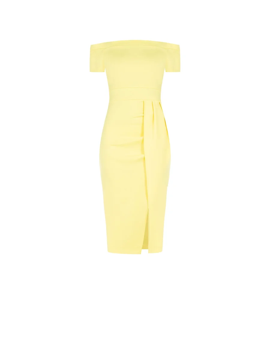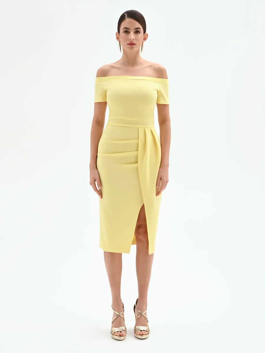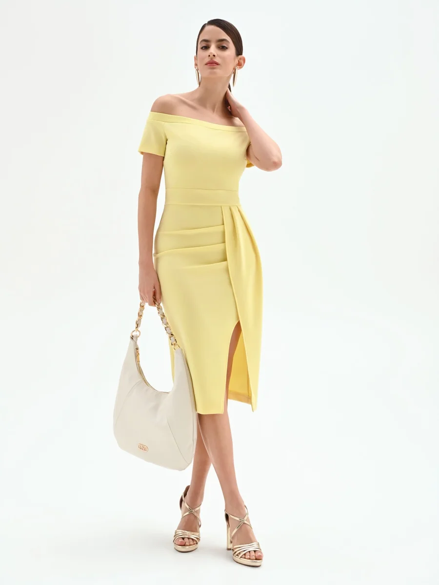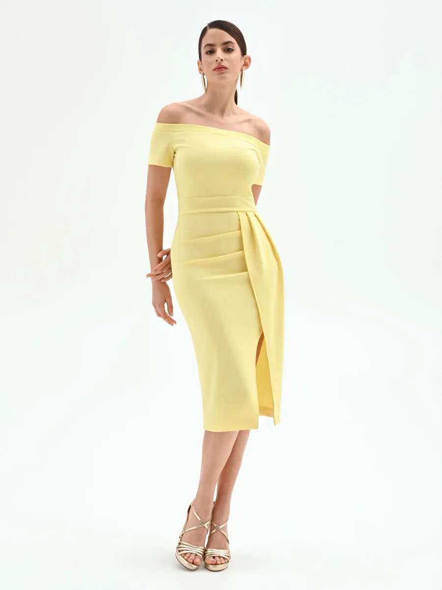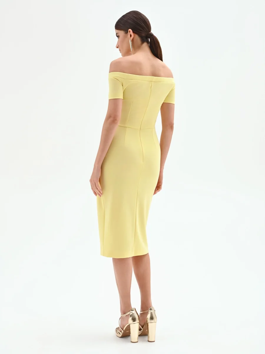 Un equilibrio perfetto tra struttura e fluidità definisce questo capo, studiato per vestire la donna contemporanea con un’eleganza solare e raffinata. Realizzato in tessuto stretch compatto e confortevole, l’abito tubino midi giallo chiaro scolpisce la silhouette seguendo le linee del corpo senza costringere. Il focus del design risiede nel seducente scollo che lascia le spalle scoperte, conferendo un tocco di intramontabile sensualità, mentre le maniche corte bilanciano armoniosamente la parte superiore.