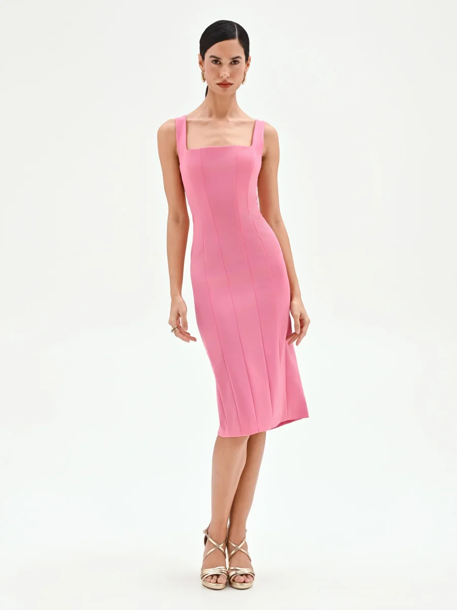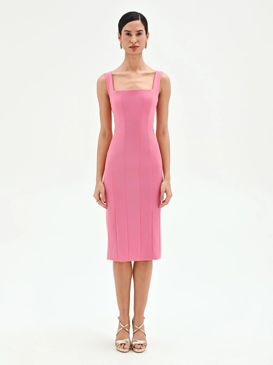 La silhouette si fa protagonista con l’abito tubino rosa, un capo che unisce una costruzione attenta e un’allure contemporanea. Realizzato in punto milano, questo modello disegna una figura slanciata grazie alle cuciture verticali che percorrono l’intera lunghezza, creando un dinamico effetto a pannelli. Lo scollo quadrato e le spalline larghe incorniciano il décolleté con un tocco moderno e ricercato, mentre la lunghezza midi aggiunge una nota di sofisticata compostezza. La chiusura con zip posteriore invisibile assicura una vestibilità perfetta e mantiene pulita la linea del capo. Un alleato di stile versatile, perfetto per l’ufficio se abbinato a un blazer, si trasforma per la sera con accessori grintosi per un look dal carattere deciso.
