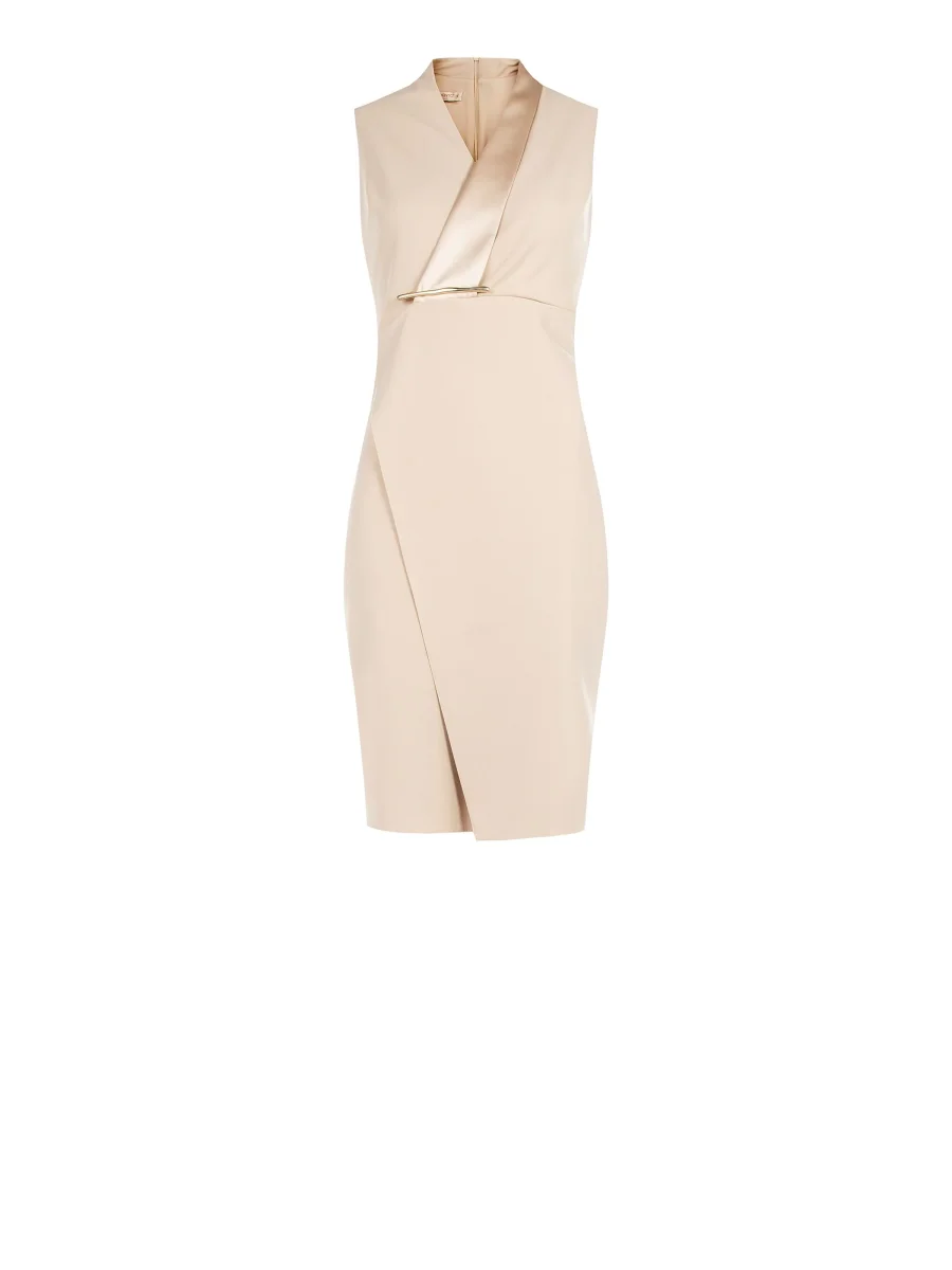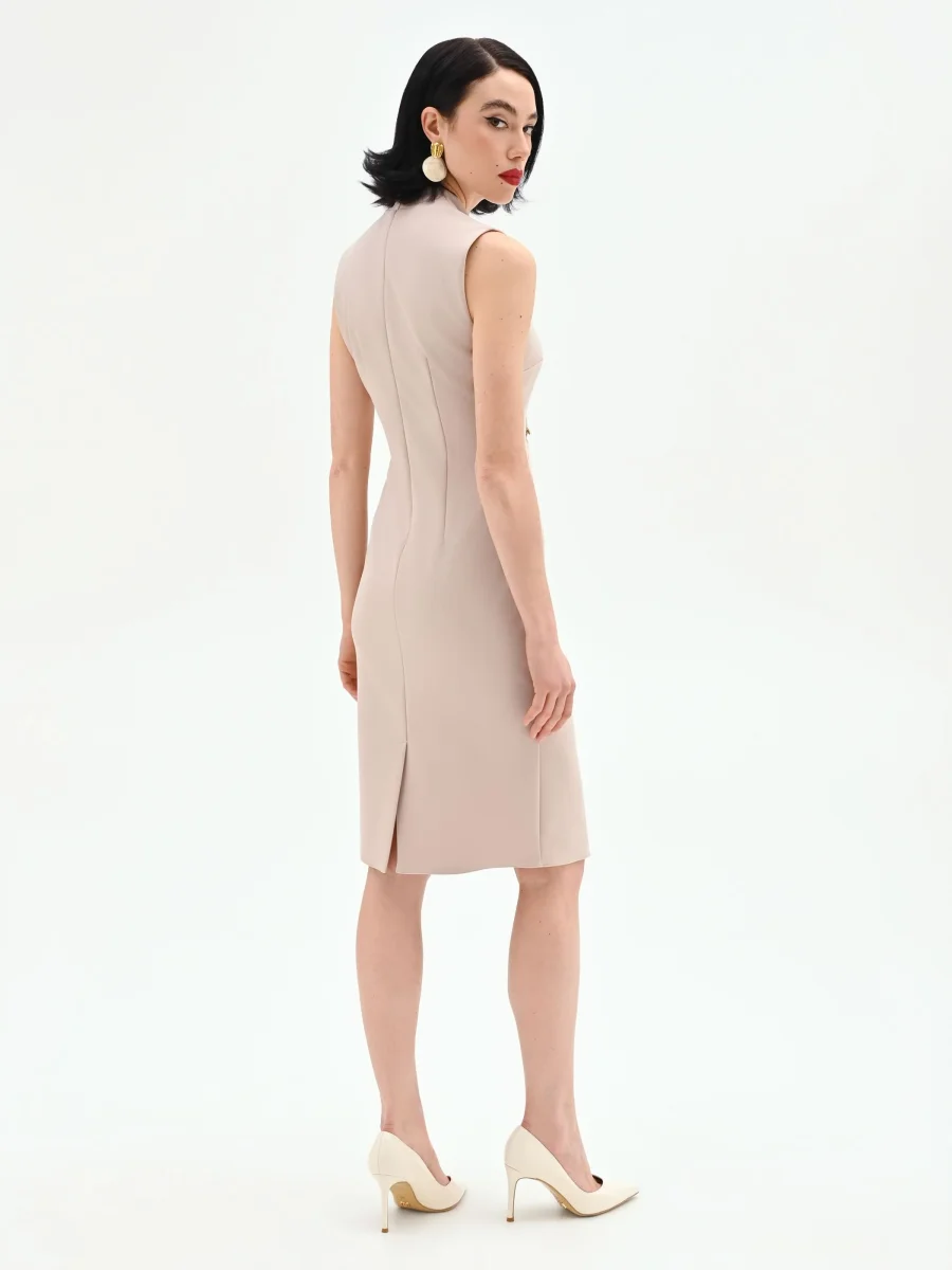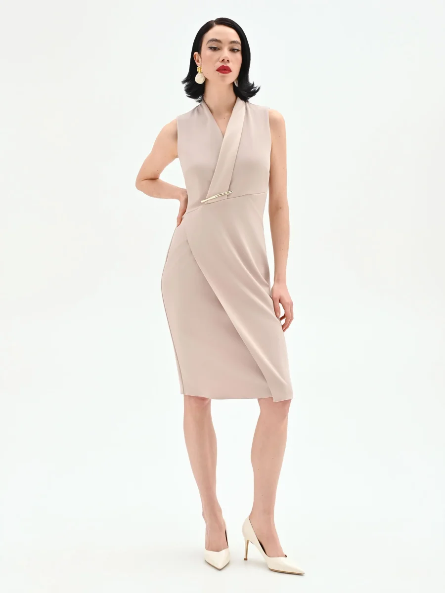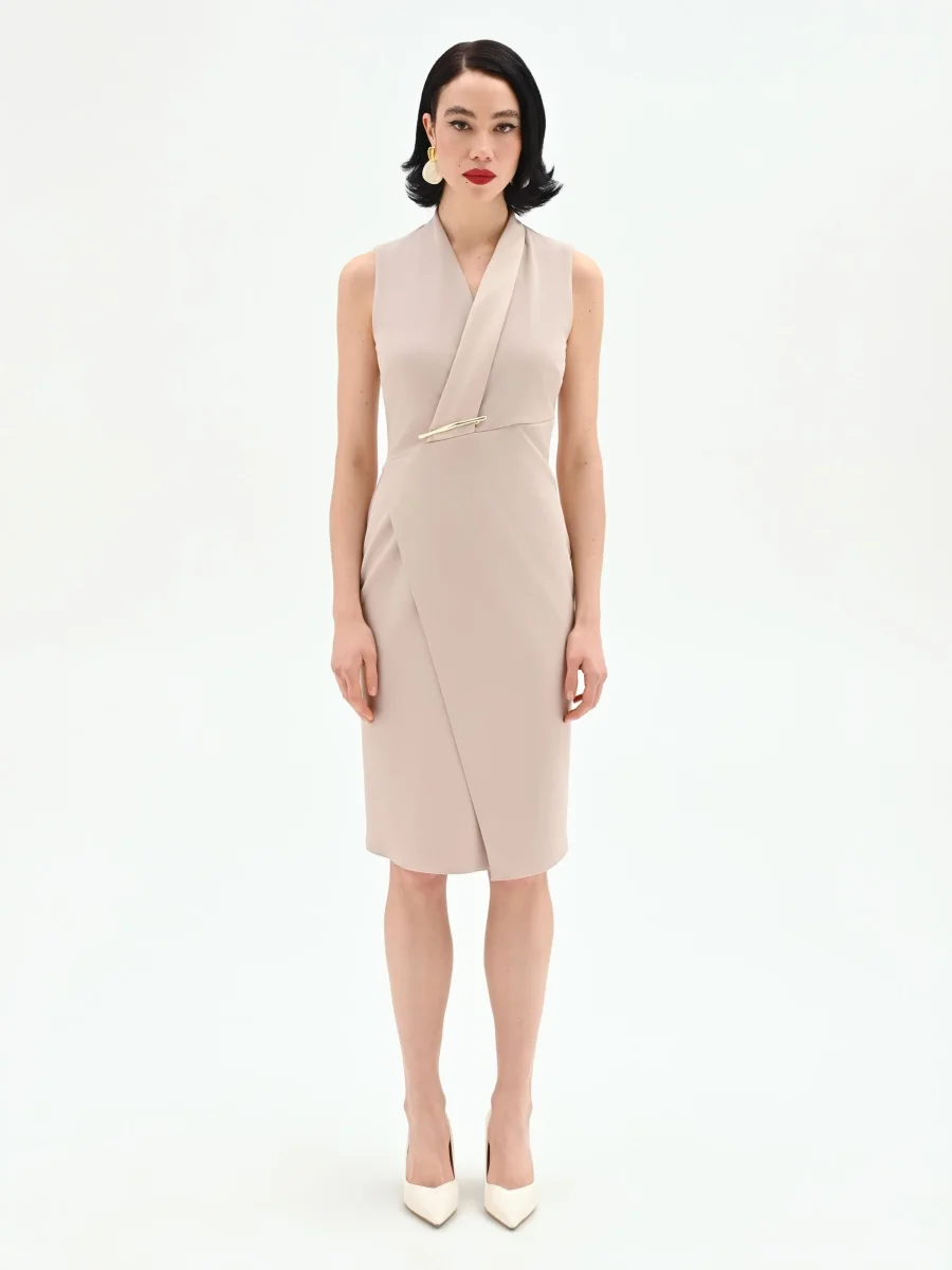 Un design architettonico che scolpisce la figura, l’abito tubino color tortora beige è un’espressione di femminilità contemporanea, capace di distinguersi con eleganza. Realizzato in scuba mano crepe, un tessuto che assicura una vestibilità definita e confortevole, il capo segue e valorizza la silhouette. Il punto focale del design è l’originale scollo a V asimmetrico, da cui parte un ampio rever drappeggiato che attraversa diagonalmente il busto, creando un movimento sofisticato. Un dettaglio in metallo dorato illumina il punto vita, fermando il drappeggio con un tocco di luce. La gonna, con il suo design a portafoglio, prosegue il gioco di sovrapposizioni e termina con un orlo asimmetrico che aggiunge dinamismo all’insieme. La chiusura con zip posteriore garantisce una linea pulita. Perfetto per cerimonie, lauree o eventi formali, questo abito si abbina ad accessori eleganti per un total look ricercato.