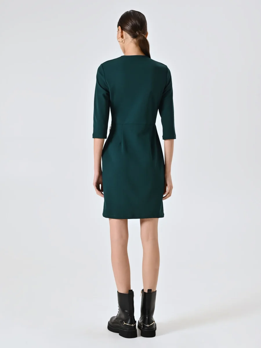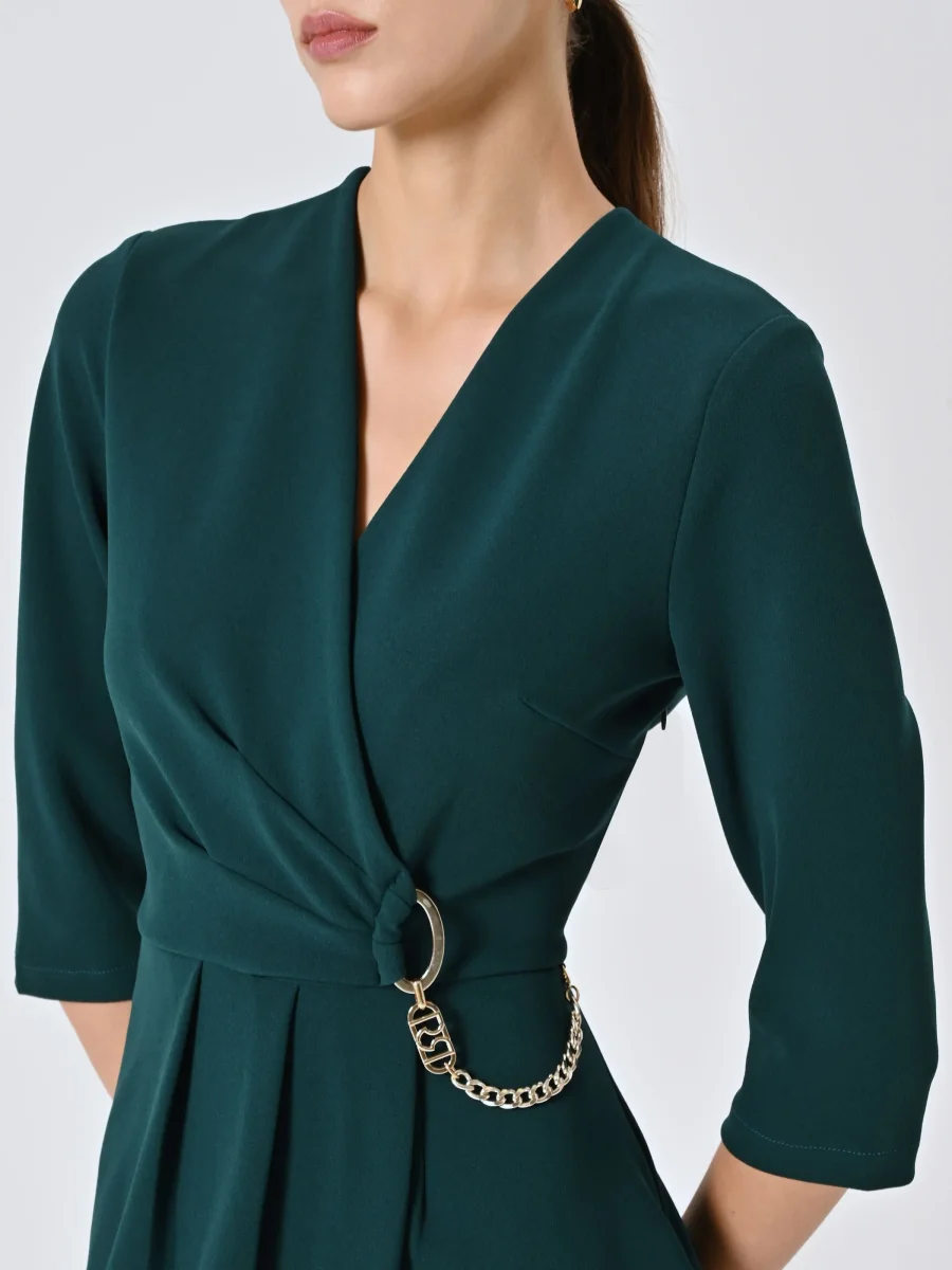 Realizzato in scuba mano crepe parzialmente riciclato, l’Abito a Portafoglio presenta maniche lunghe, uno scollo incrociato con raffinato drappeggio e un decoro gioiello che illumina il punto vita. La chiusura con zip laterale mantiene la linea fluida e pulita del capo.