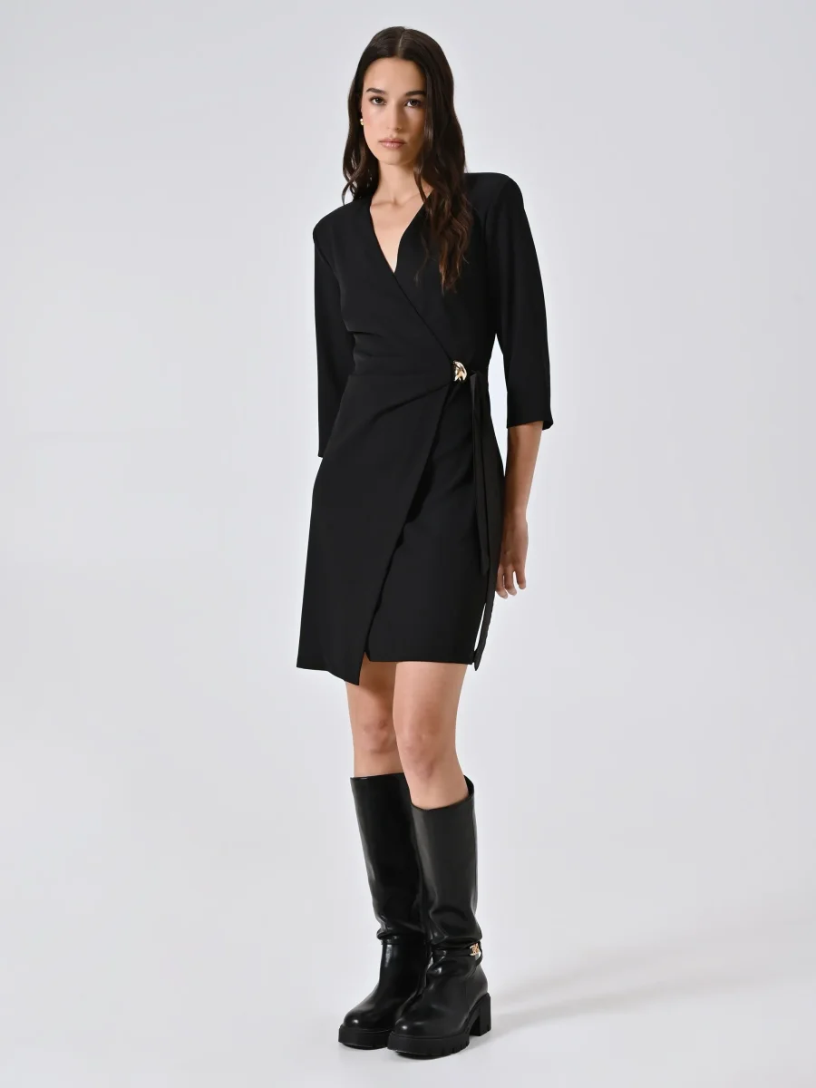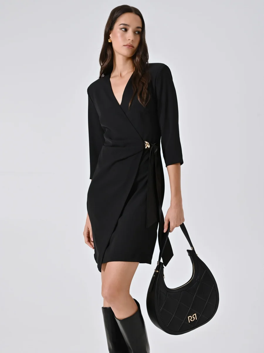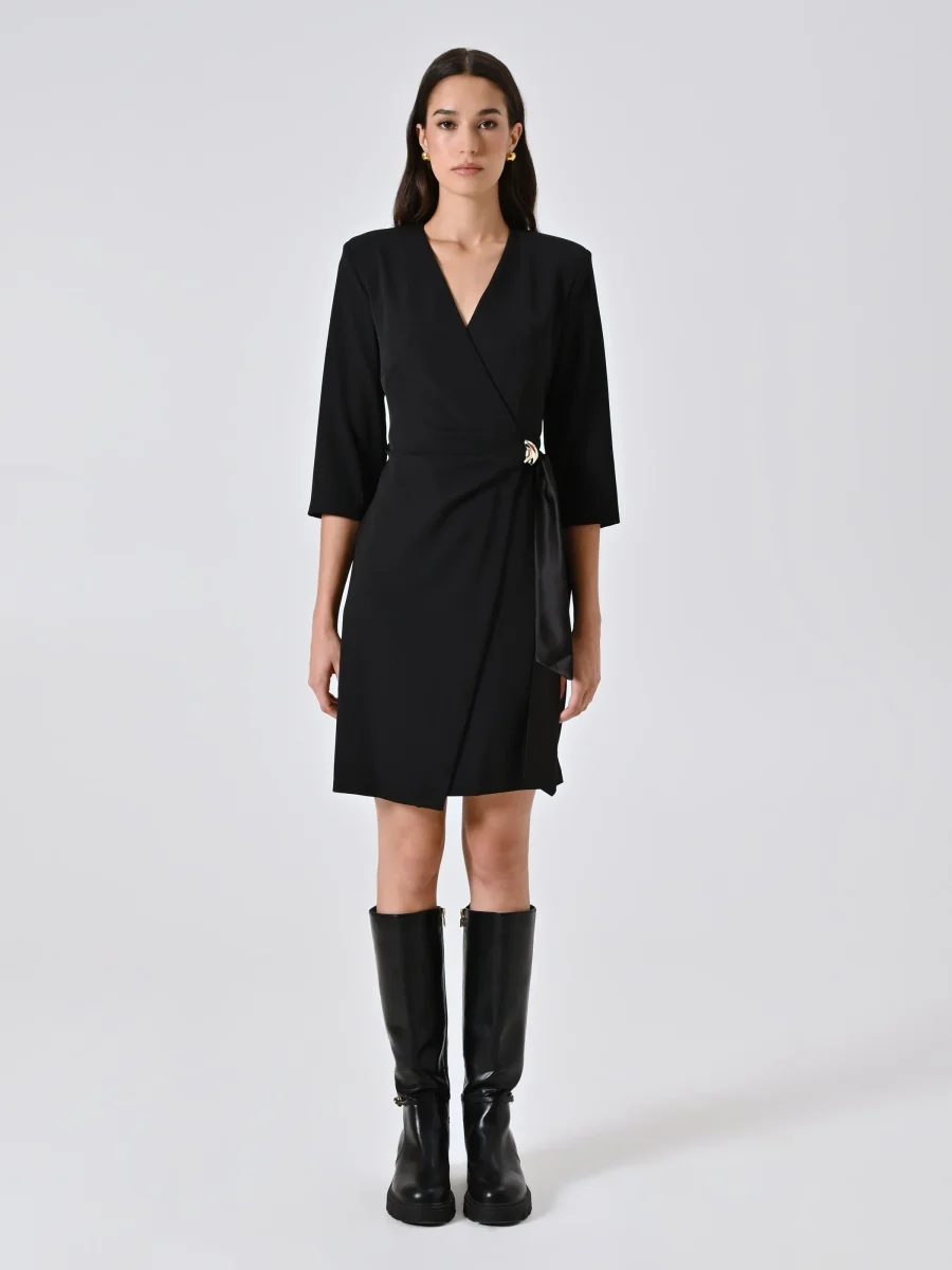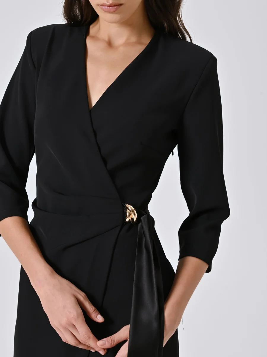 L’Abito Wrap con Nastri in Raso e decoro Gioiello è una proposta elegante e raffinata, perfetta per valorizzare la femminilità in ogni occasione speciale.