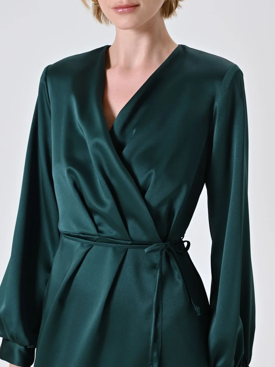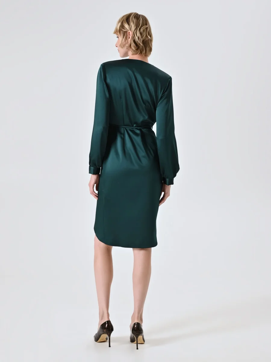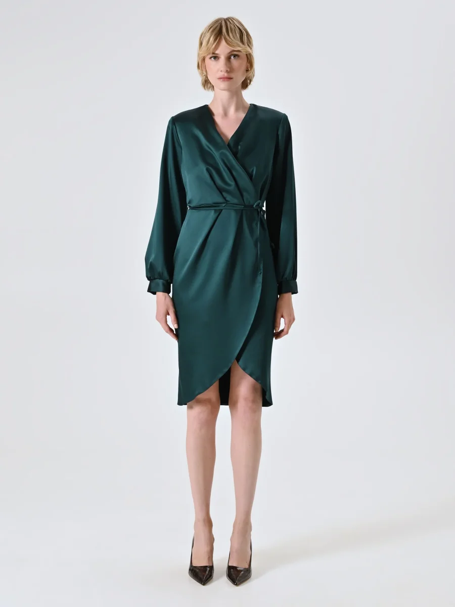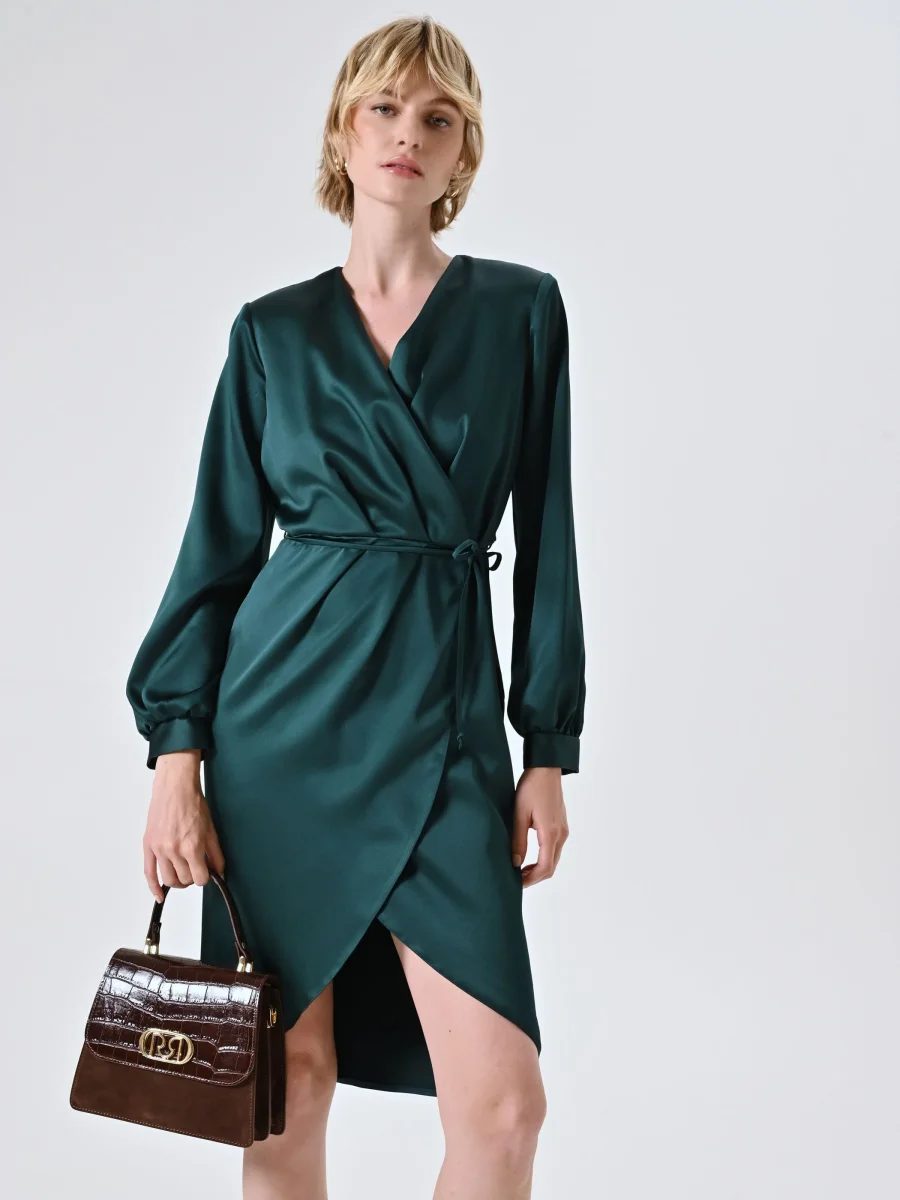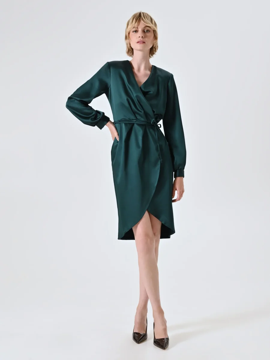 L’Abito Wrap Verde in Raso è una proposta elegante e femminile, pensata per valorizzare la figura con una costruzione fluida e raffinata.