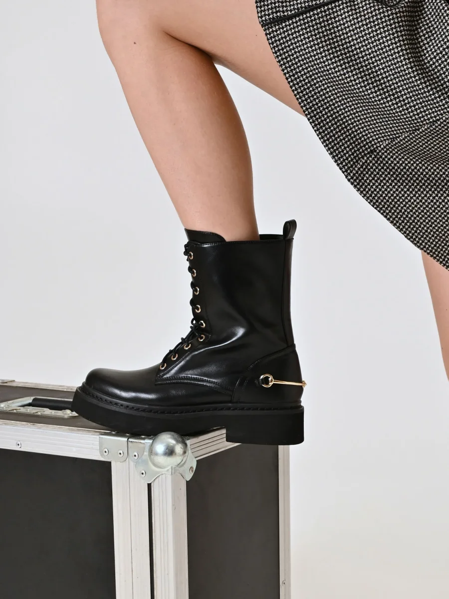 Anfibi neri in materiale effetto pelle con suola alta e profilo bold. Il design stringato è completato da una zip laterale con cursore logato dorato e impreziosito dal morsetto metallico applicato sul tallone, dettaglio dal tocco elegante e distintivo. Perfetti per aggiungere grinta ai tuoi look quotidiani, da abbinare a gonne midi o pantaloni cargo per un mood urban contemporaneo.