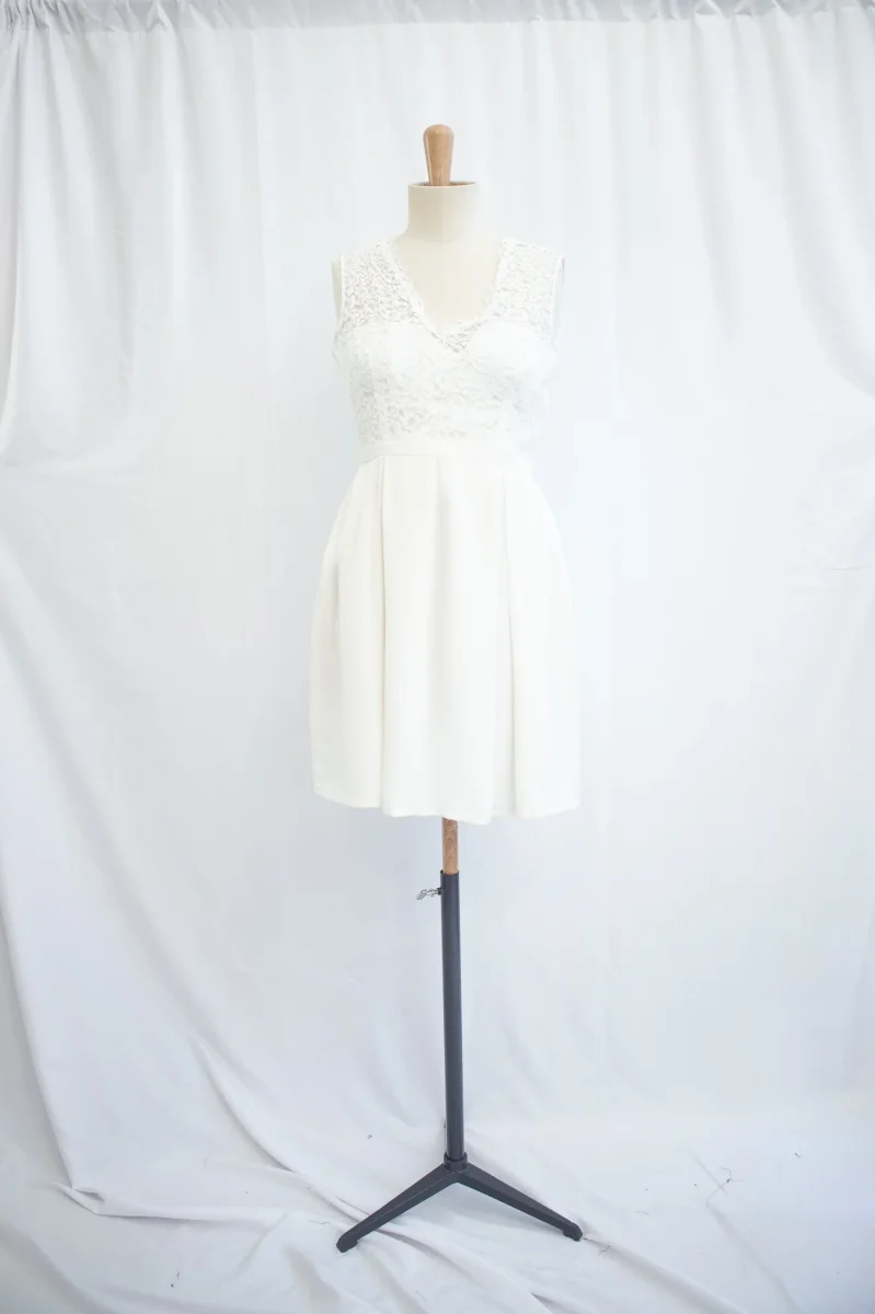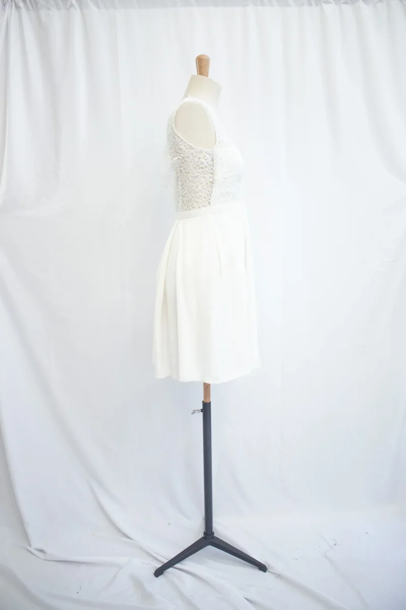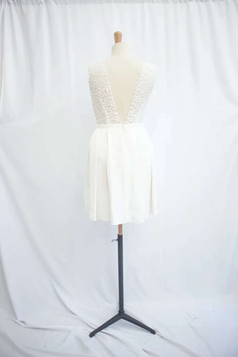 Détails : Robe courte avec jupe à plis et top en dentelle, décolleté V devant et dos nu.