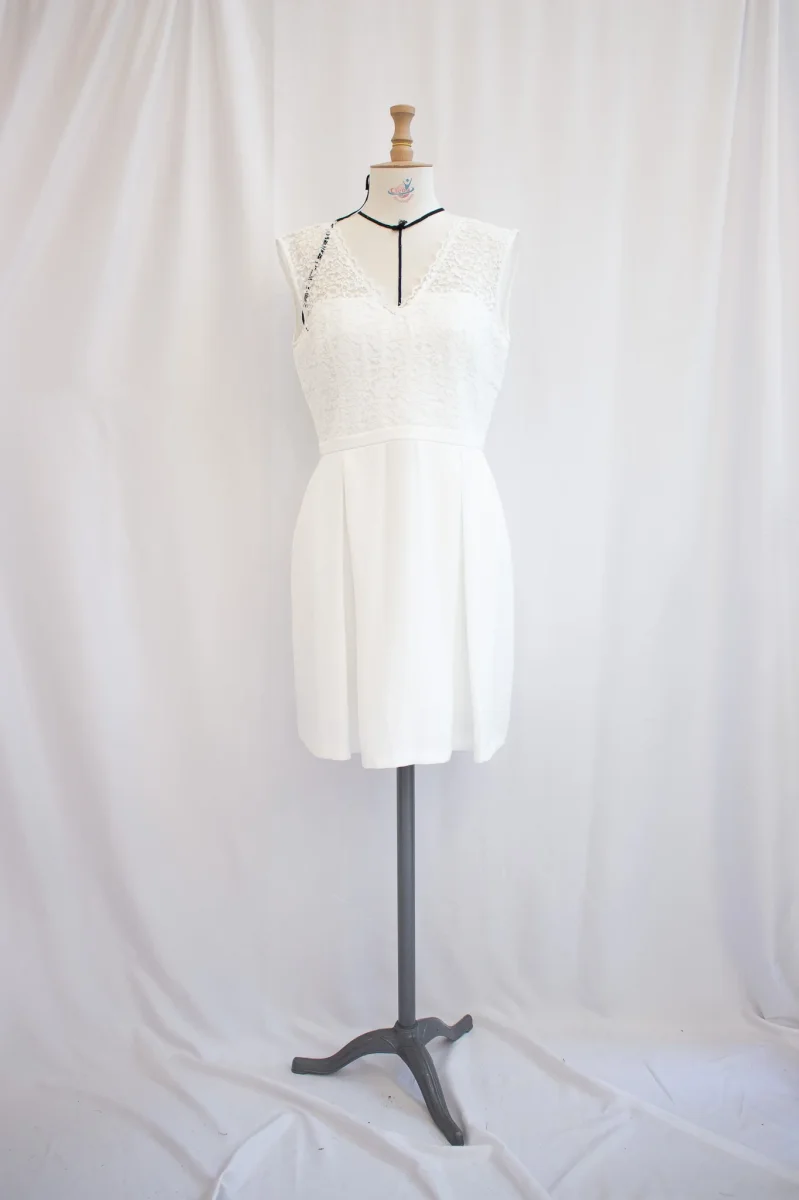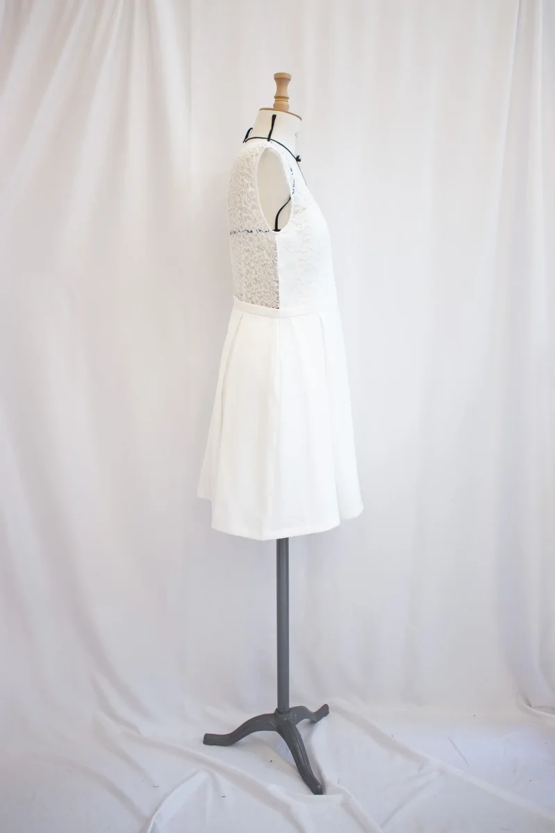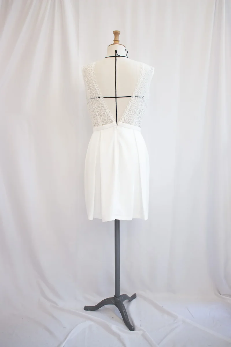 Détails : Robe courte jupe à plis, dos nu en dentelle de calais et décolleté V devant.